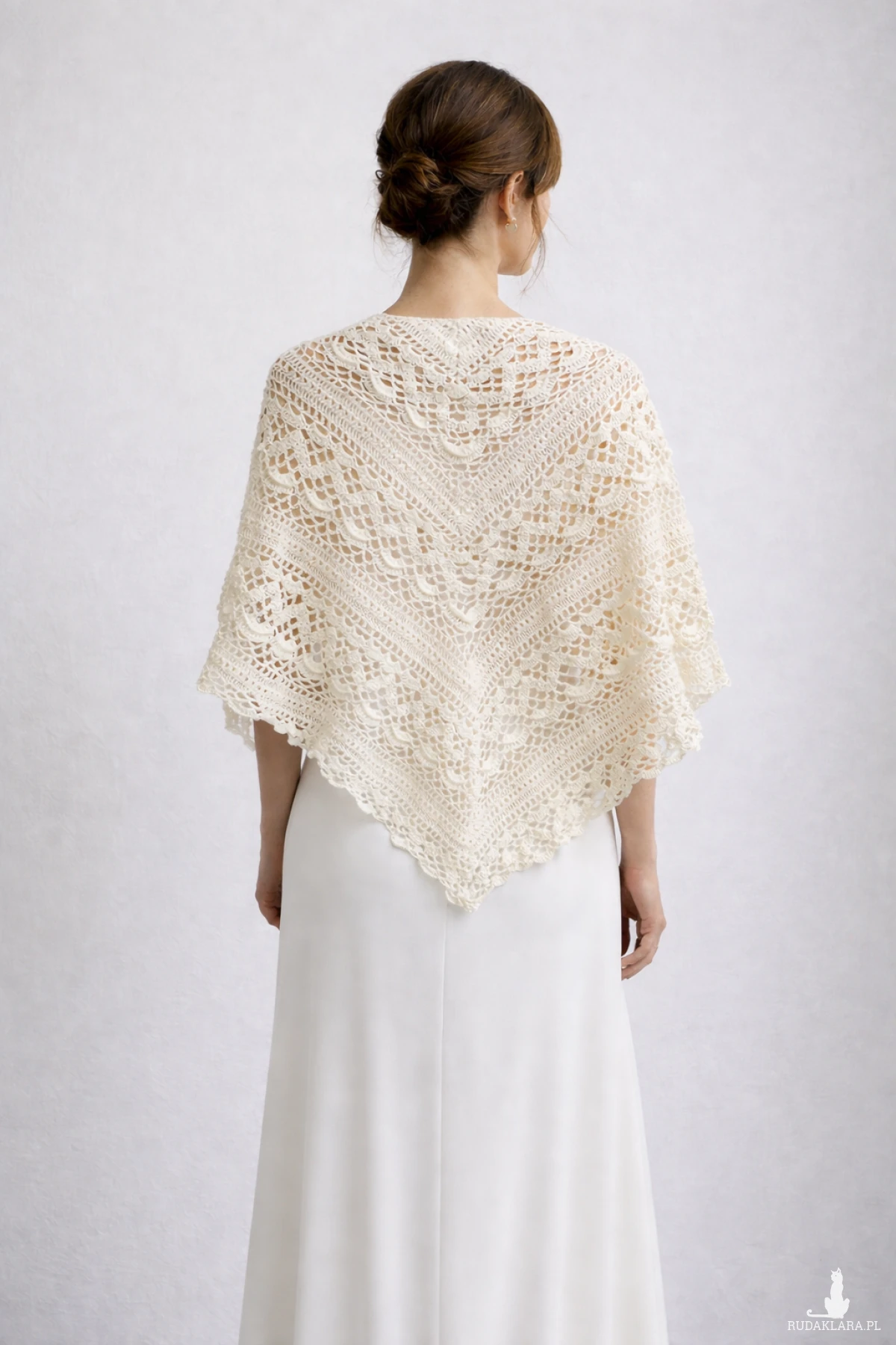 Ta chusta na ślub pasuje zarówno do klasycznych, jak i nowoczesnych stylizacji. Można założyć ją na ceremonię, przyjęcie weselne, a po ślubie nosić również na co dzień — jako elegancki szal lub chustę handmade do sukienek i płaszczy.