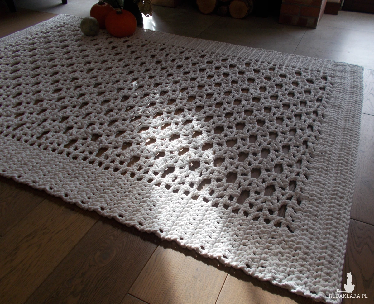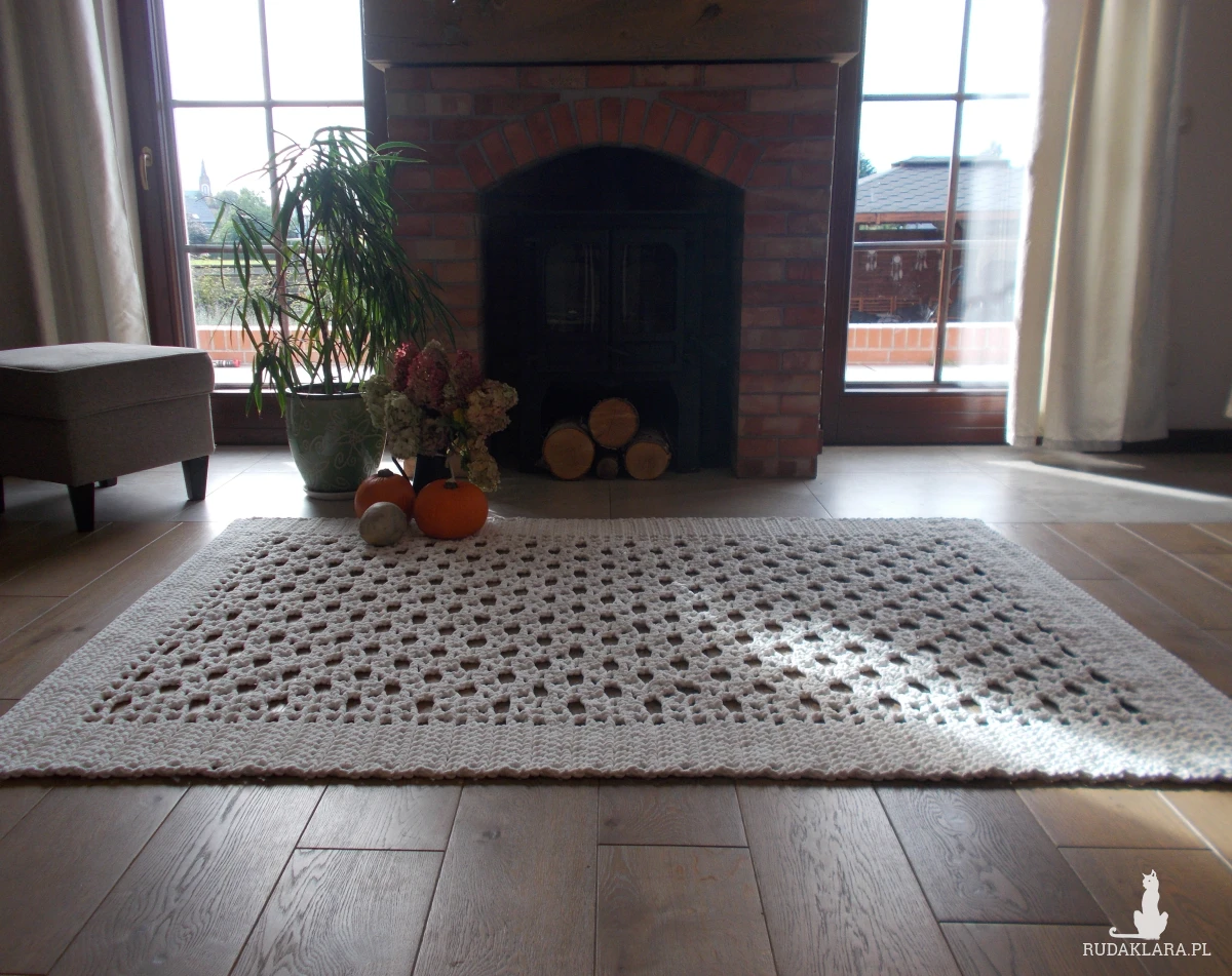 w całości wykonany ręcznie, kolor ecru. Dywan jest dwustronny - dzięki