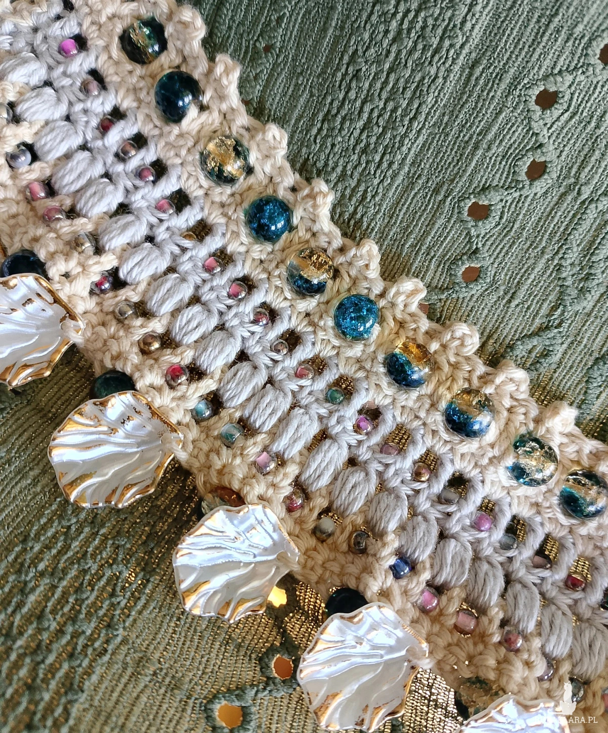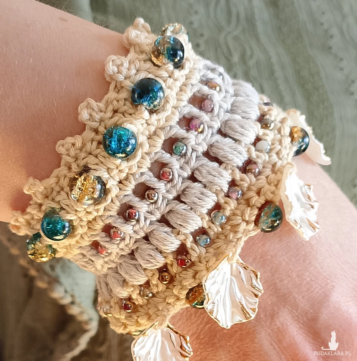 Bransoletka wykonana koronkowym wzorem, ozdobiona koralikami. Jest