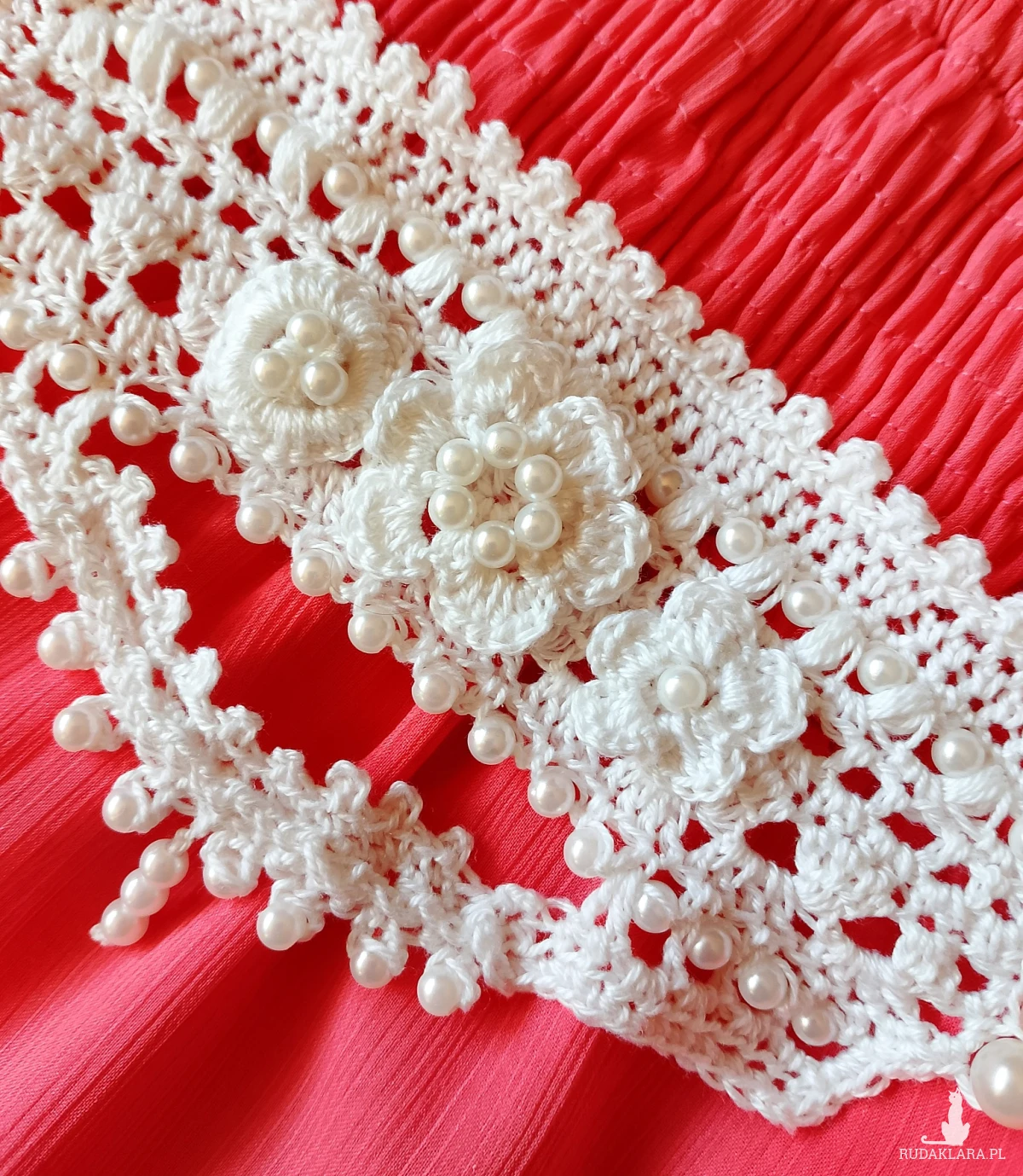 Bransoletka wykonana koronkowym wzorem, ozdobiona perłowymi koralikami.