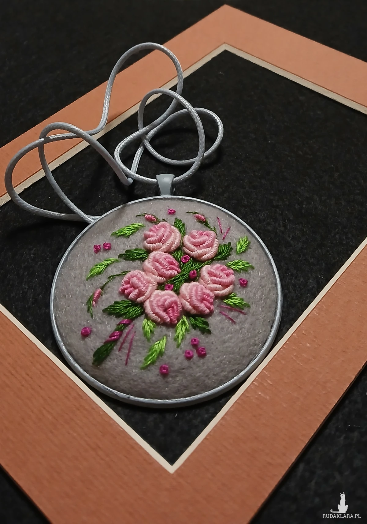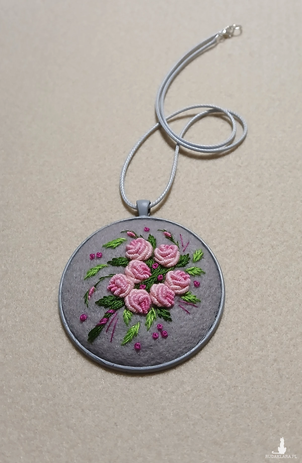 Bukiet różowych róż na lodowej szarości to romantyczne zestawienie kolorów w stylowym ogromnym wisiorze.