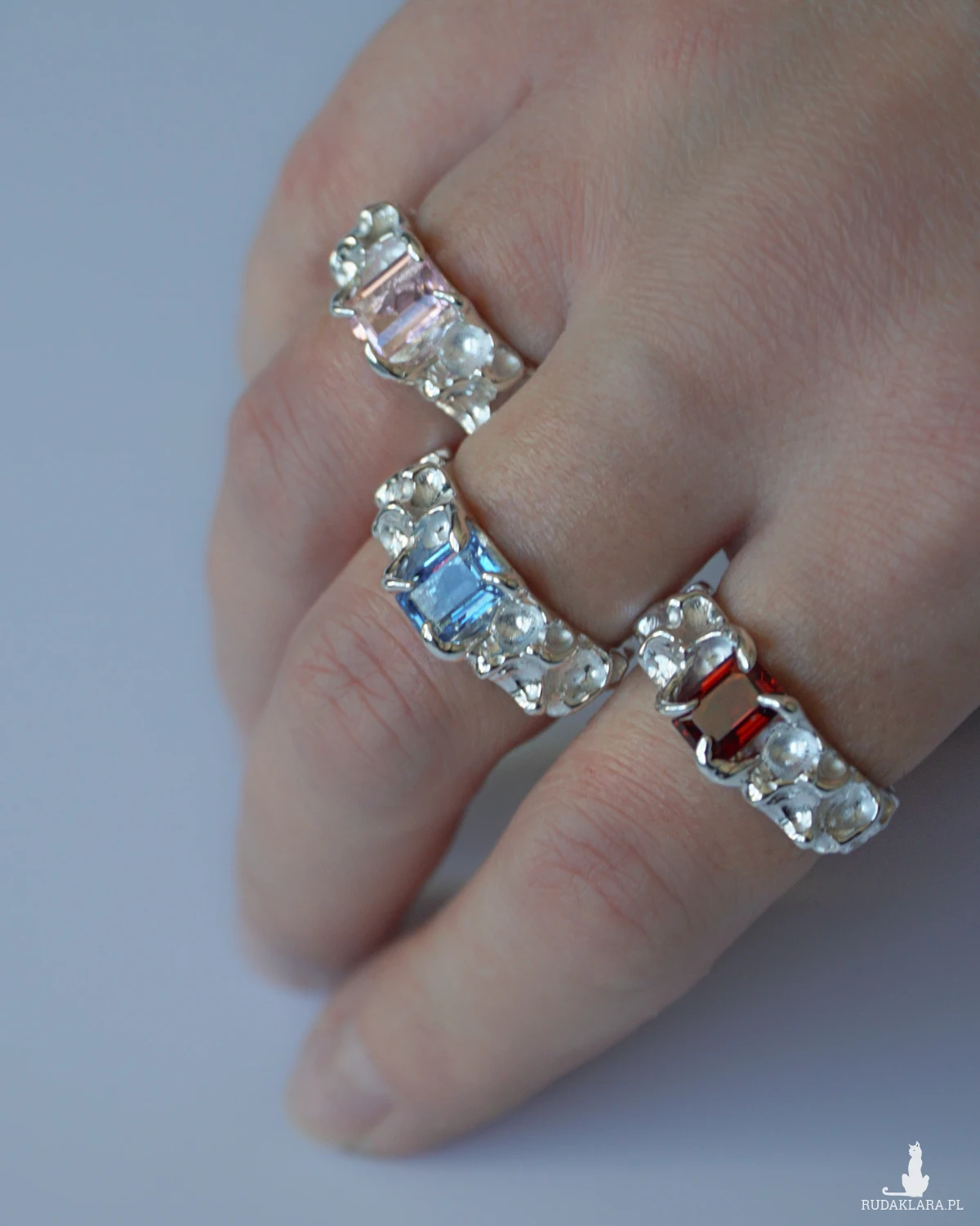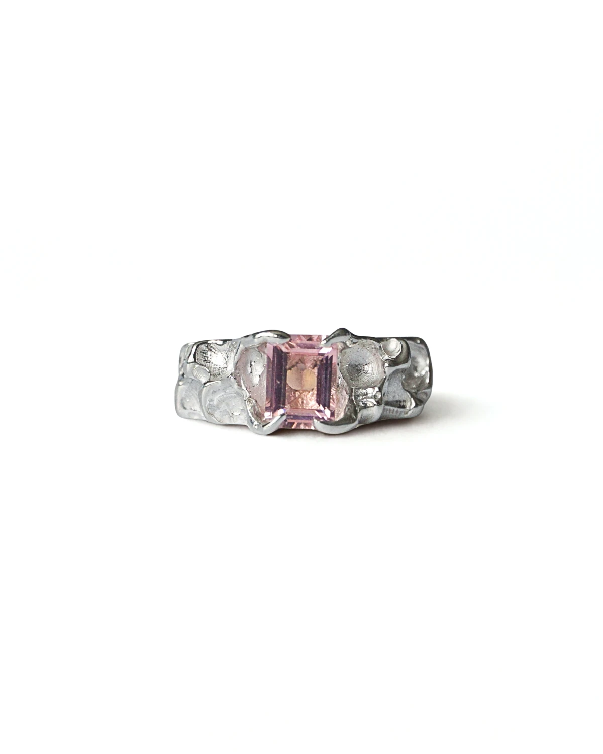 Srebrny nieregularny pierścionek z różowym kwarcem. Wykonany w srebrze próby 925.