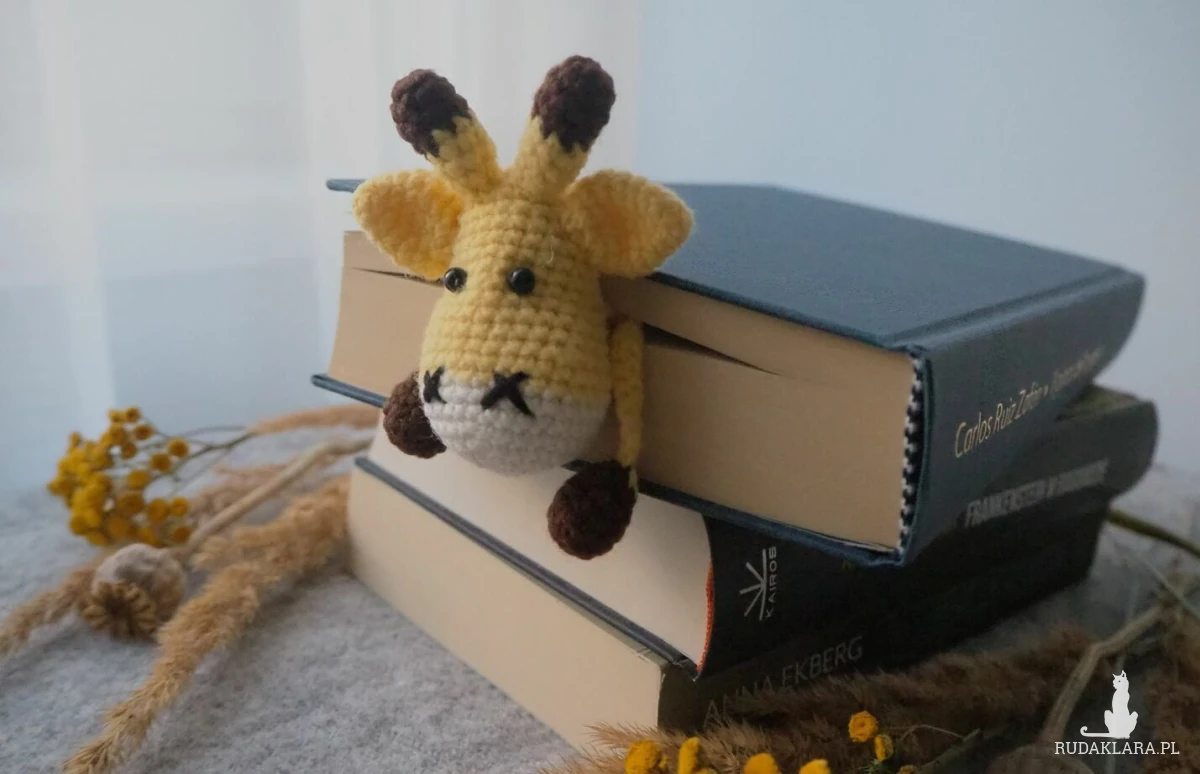 Zakładka do książki z sympatyczną żyrafą wykonana z włóczki na szydełku.