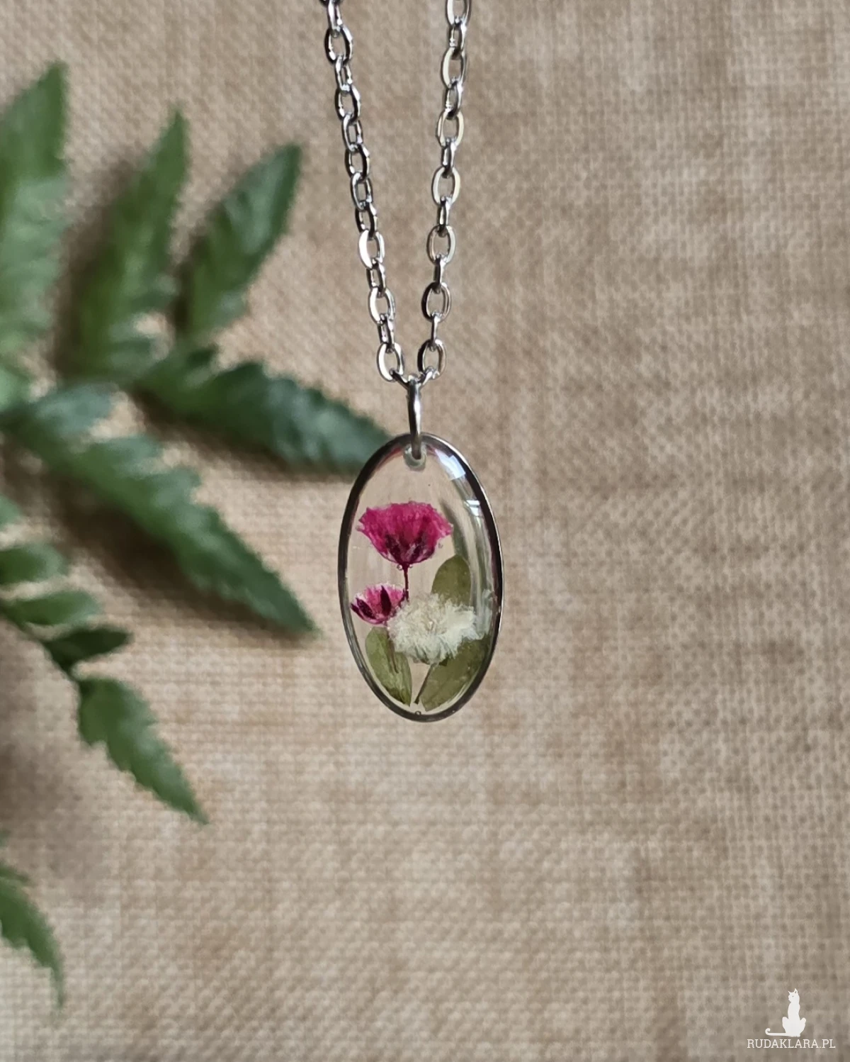 Oferuję Państwu unikalną biżuterię. Zawieszka jest wykonana z suszonych kwiatów i żywicy epoksydowej. Biżuteria jest wspaniałym i oryginalnym prezentem na lata.