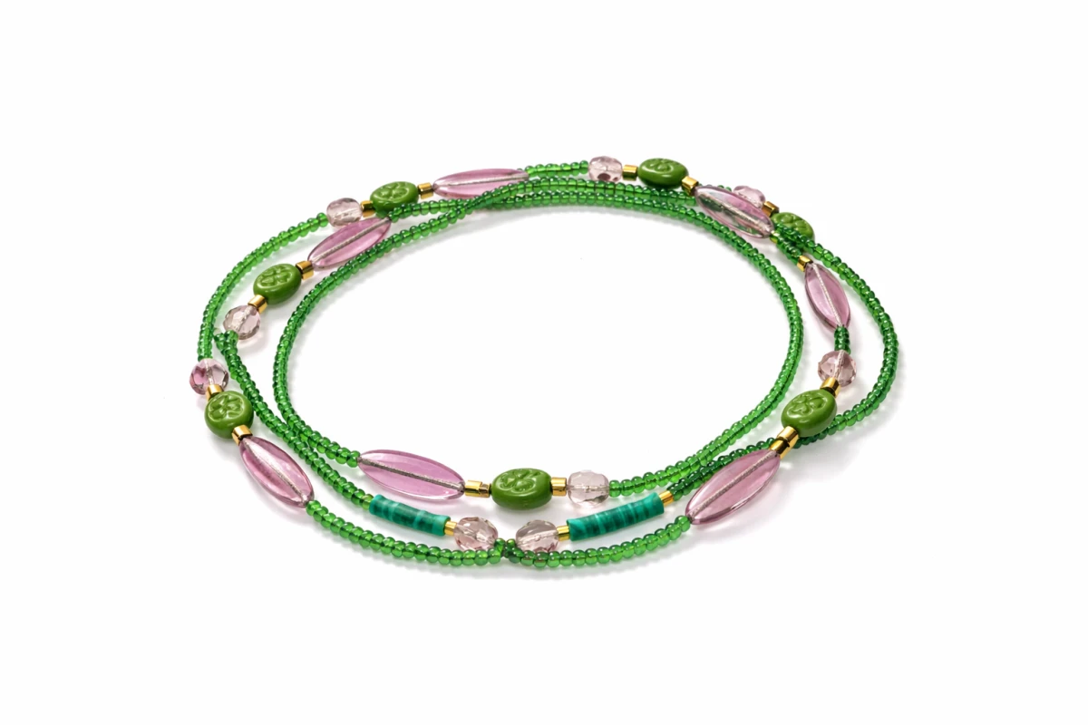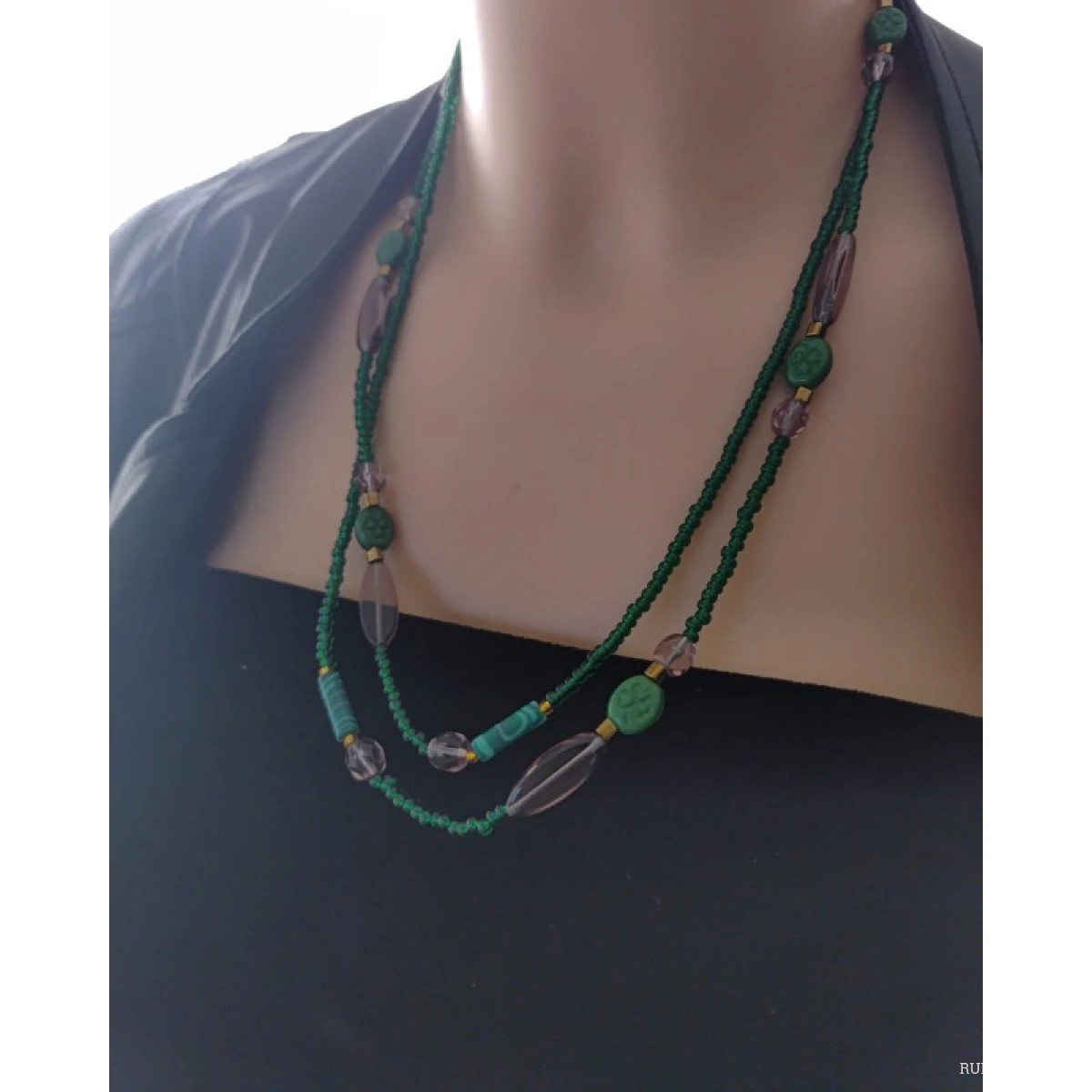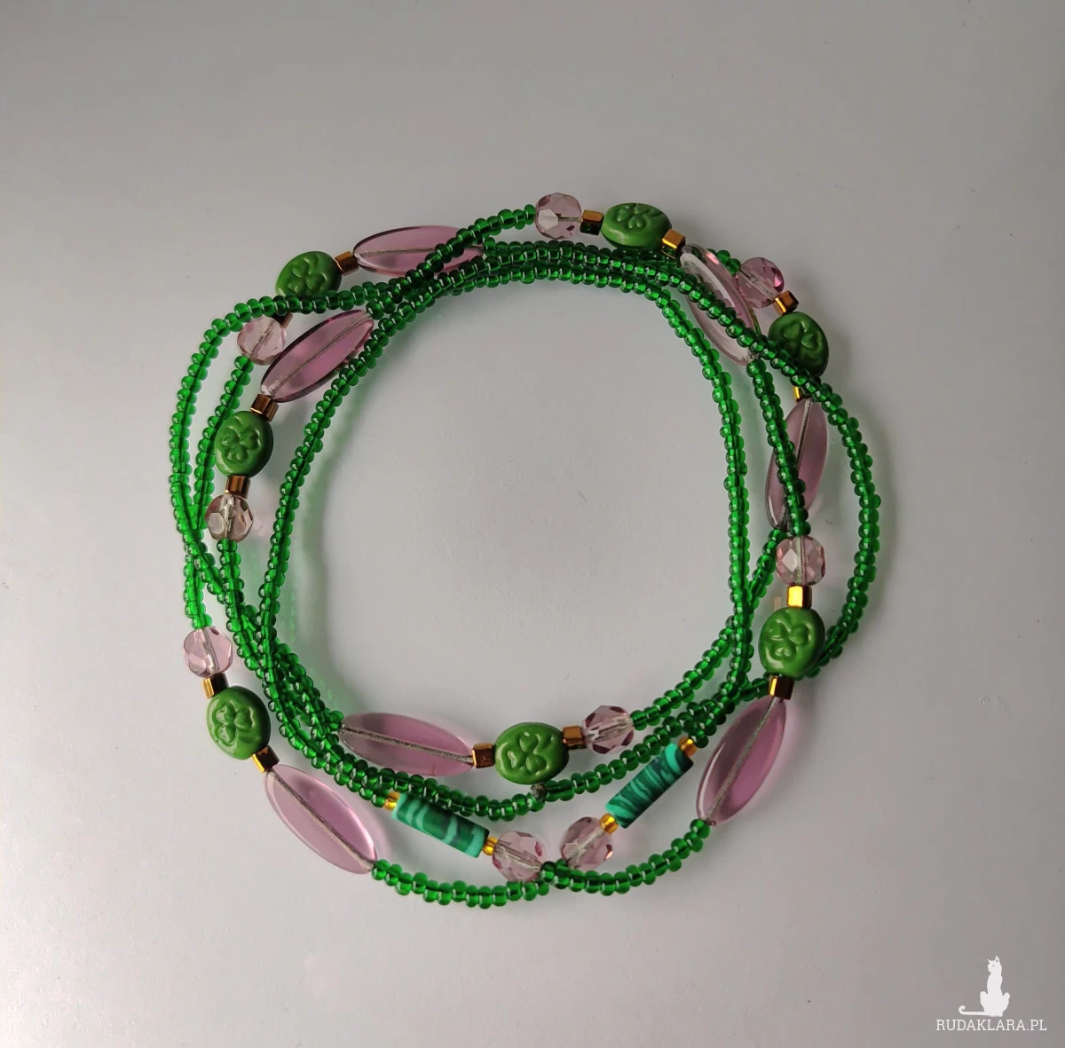 Zielony sznur koralików ozdobiony fioletowymi szklanymi oliwkami z czeskiego szkła i szklanymi oliwkami w kolorze zielonym z motywem oliwki. Malutkie szklane kostki w kolorze zlotym. Bez zapiecia. Długość sznura 2x 55 cm