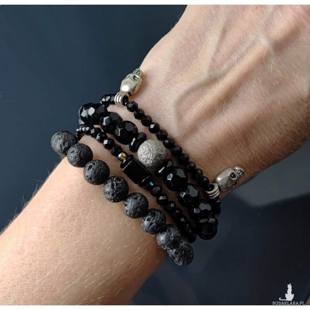 Bransoletka z czarnych koralików szklanych i kulek lawy wulkanicznej. Kulka pył księzycowy srebrna i maleńkie czaszki. Czarny sznurek syntetyczny.  Zapięcie wyplecione ściegiem makramowym pozwala na dopasowanie bransoletki do nadgarstka, przechodzi przez dłoń ok 20 cm