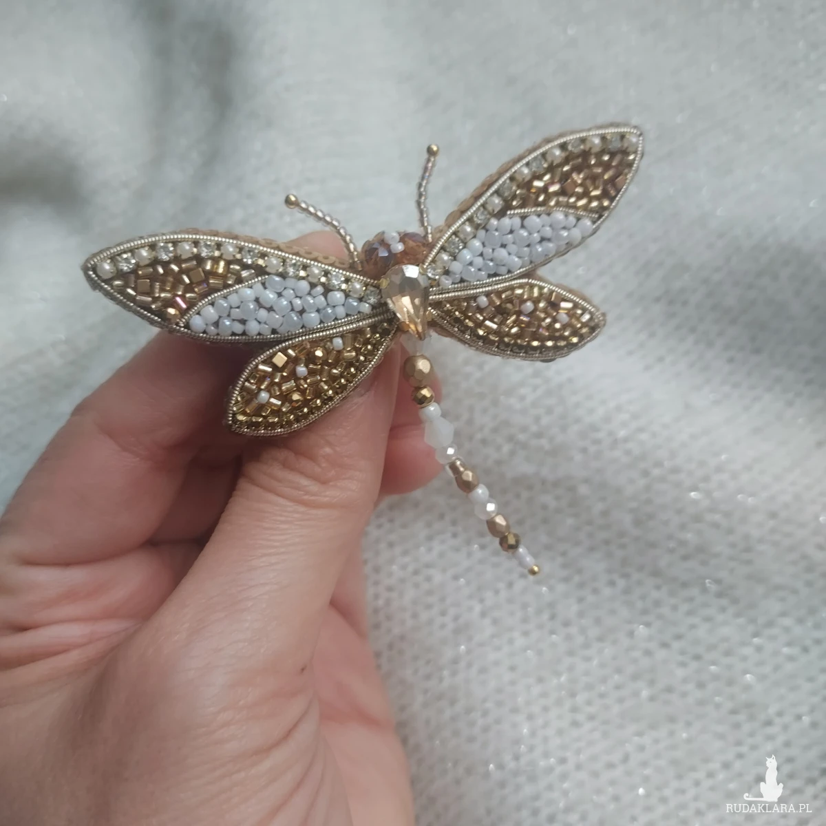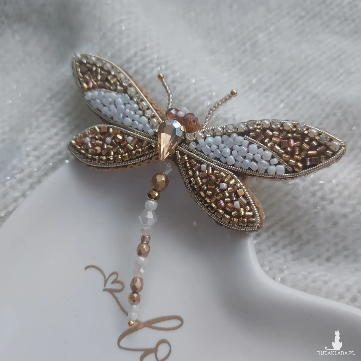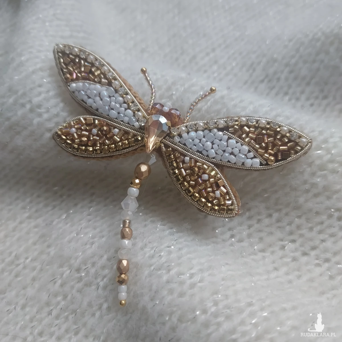 Broszka ważka w kolorze perłowo-złotym - wiosenno-letnie szaleństwo piękna oraz delikatności. Broszka powstała haftem koralikowym z dbałością o każdy szczegół.
