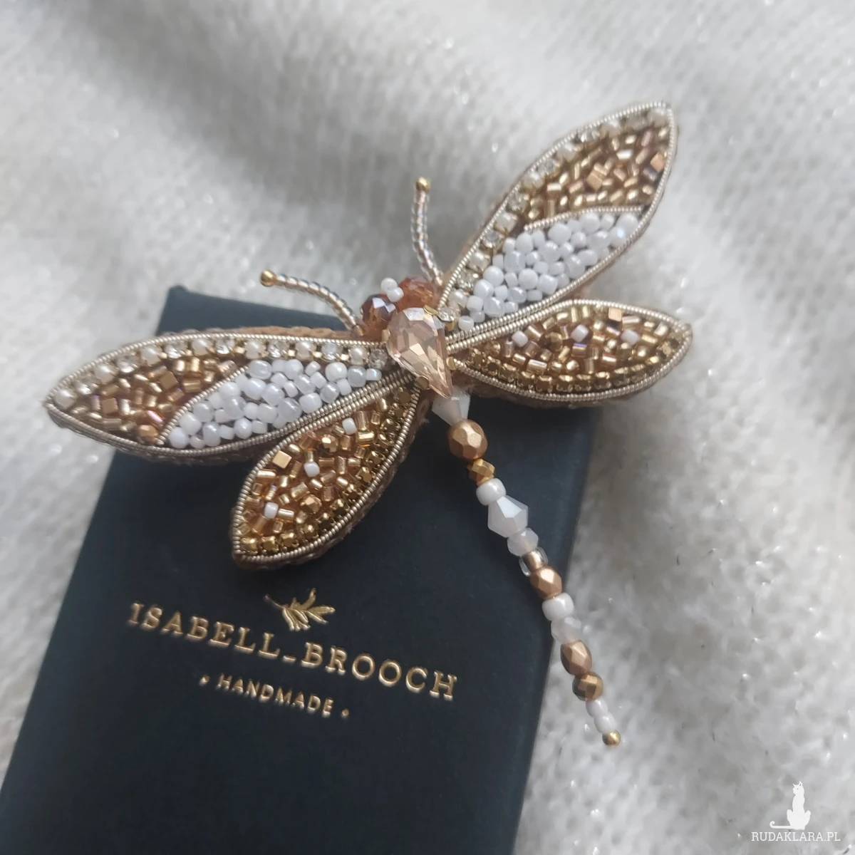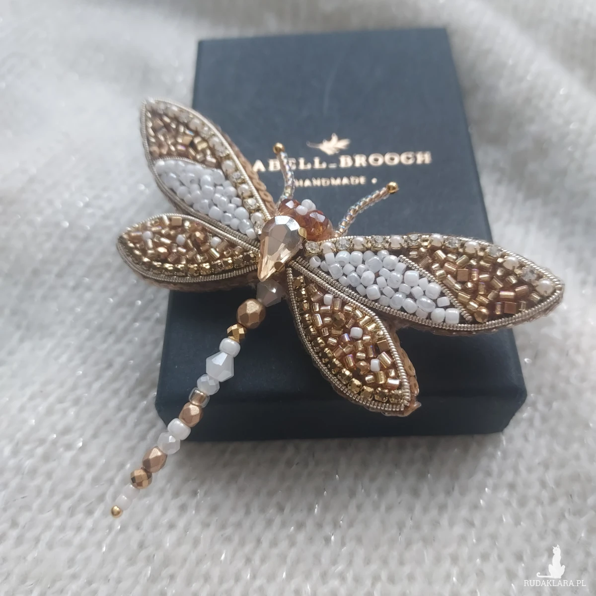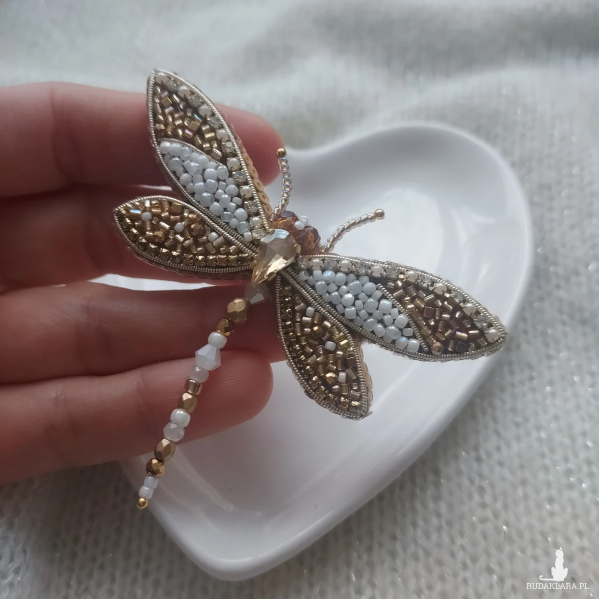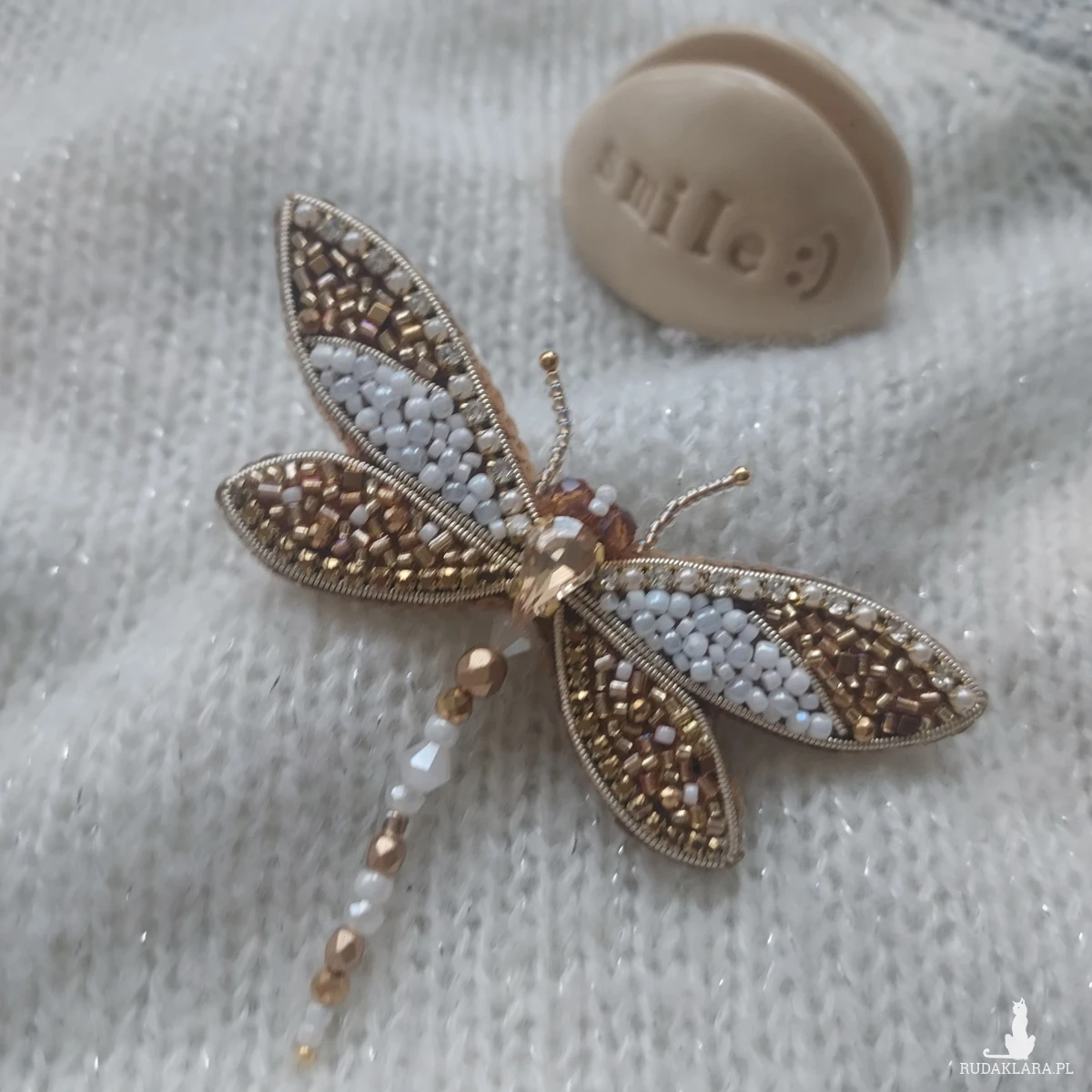 Broszka ważka w kolorze perłowo-złotym - wiosenno-letnie szaleństwo piękna oraz delikatności. Broszka powstała haftem koralikowym z dbałością o każdy szczegół.