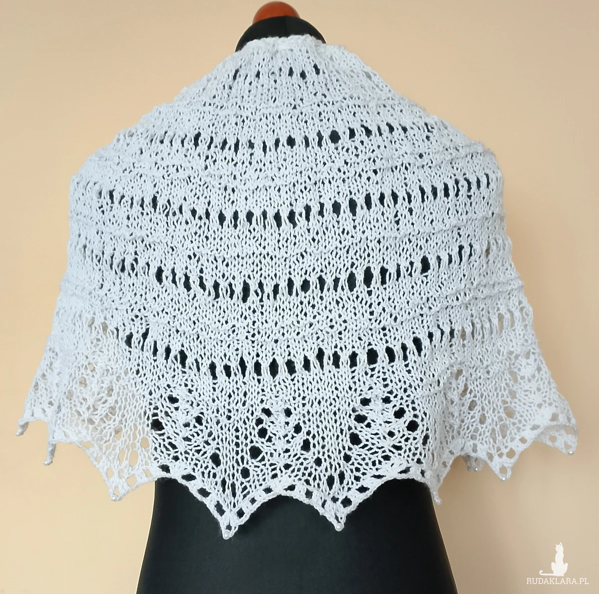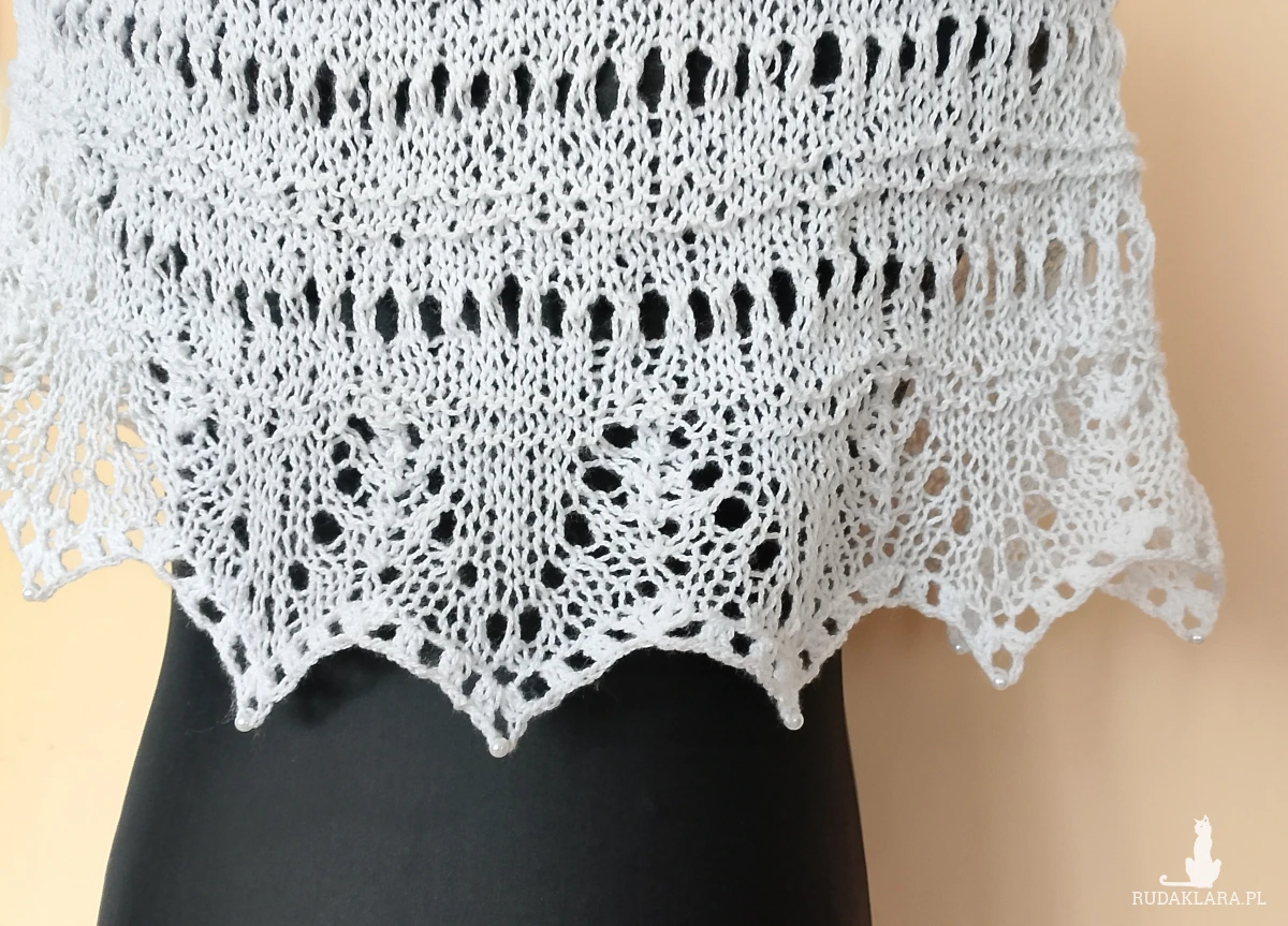 Biała komunijna pelerynka wykonana w całości ręcznie na drutach z przyjemnej w dotyku włóczki akrylowej. Zakończona koronkowym wzorem, oraz perłowymi koralikami. Wiązana wokół szyi ozdobnym sznureczkiem z szydełkowymi kwiatkami na końcach. Wiązanie umożliwia regulację obwodu.
