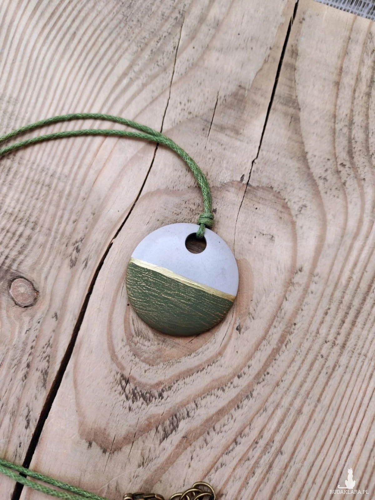 Unikatowy wisiorek wykonany ręcznie z betonu kreatywnego, łączący surową estetykę z delikatnym, naturalnym akcentem kolorystycznym. Okrągła forma została ozdobiona subtelnym przejściem barw – od jasnej, neutralnej góry po zielony dół z delikatną strukturą. Całość zawieszona jest na wytrzymałym, zielonym sznurku, który podkreśla naturalny charakter biżuterii. Wisiorek posiada wygodne zapięcie na karabińczyk oraz przedłużający łańcuszek, co umożliwia regulację długości.