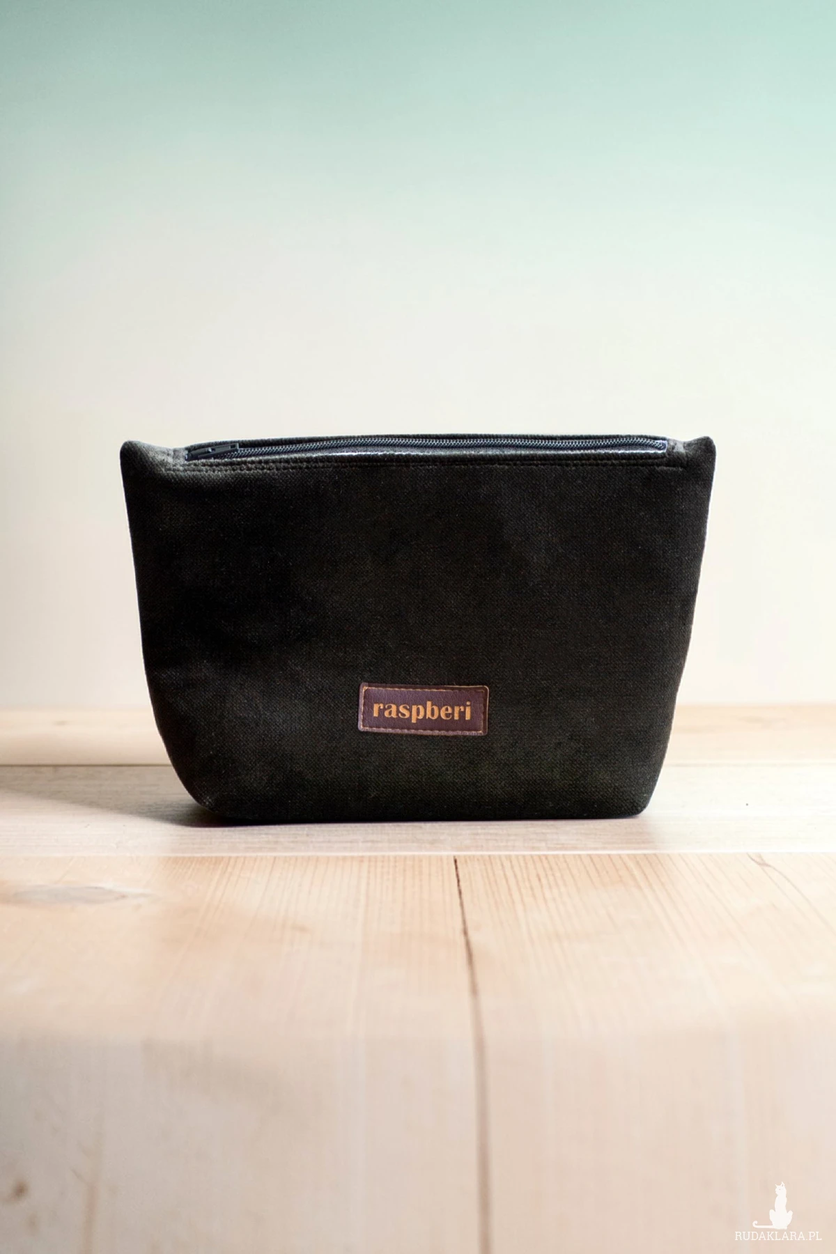 Duża kosmetyczka w kolorze ciemnooliwkowym wykonana z weluru.