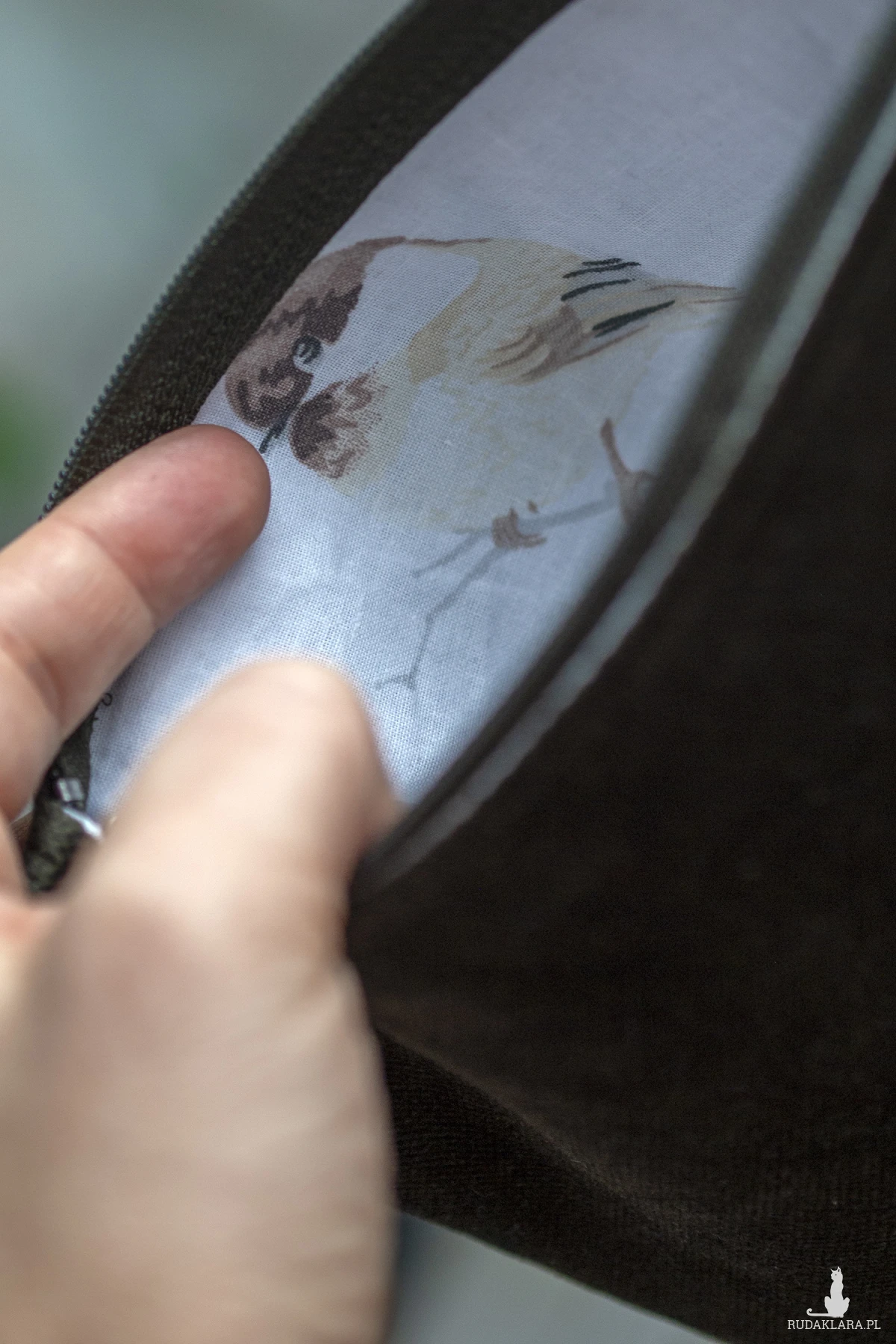 Kosmetyczka jest zapinana na suwak, w środku bawełniana podszewka.