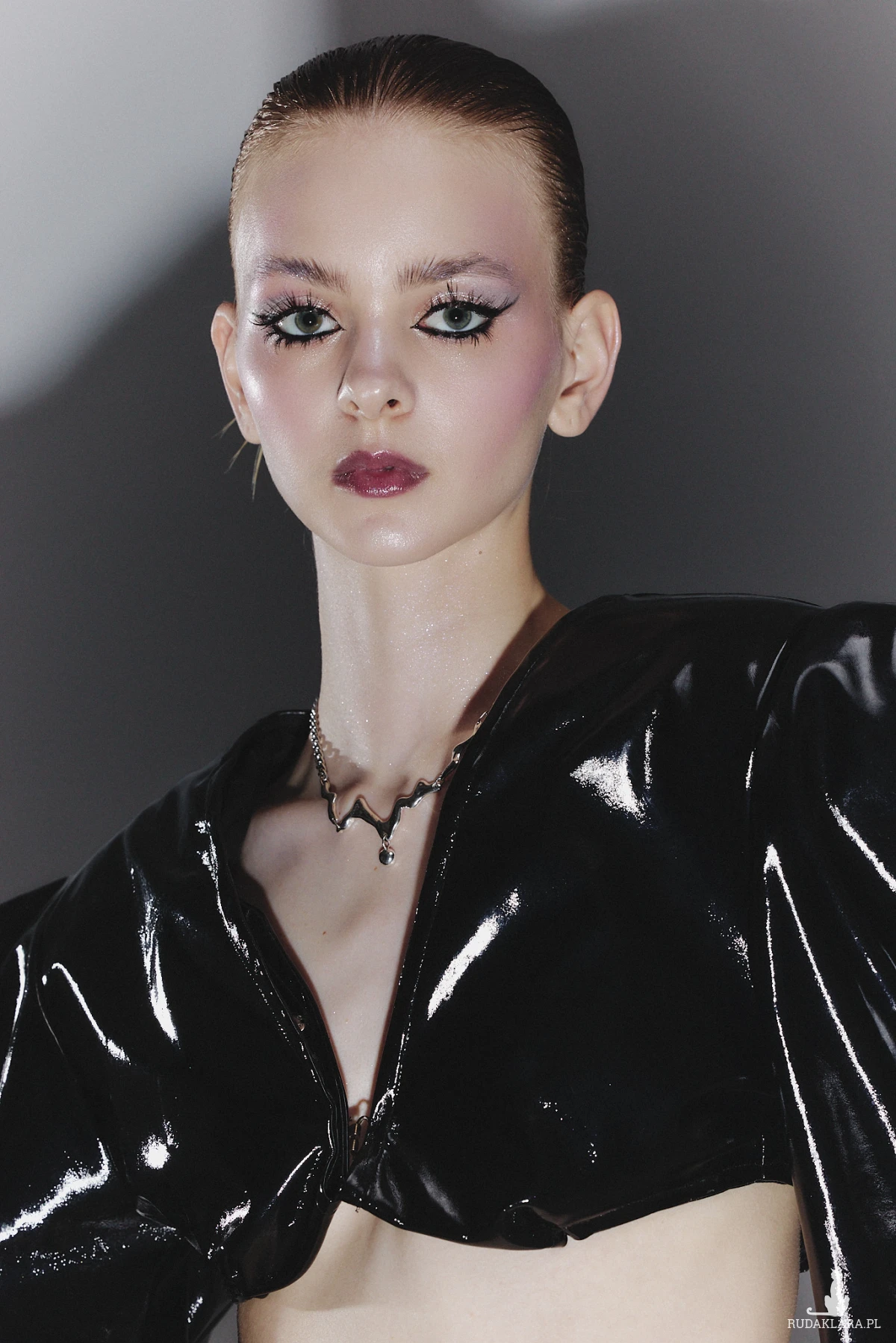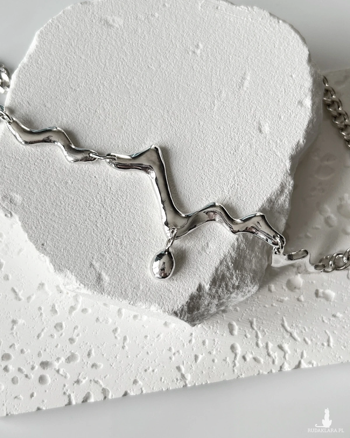Nieregularny naszyjnik w formie lejącego, ociekającego srebra, z wiszącą kroplą.