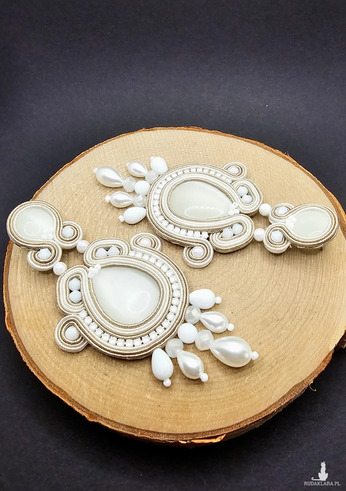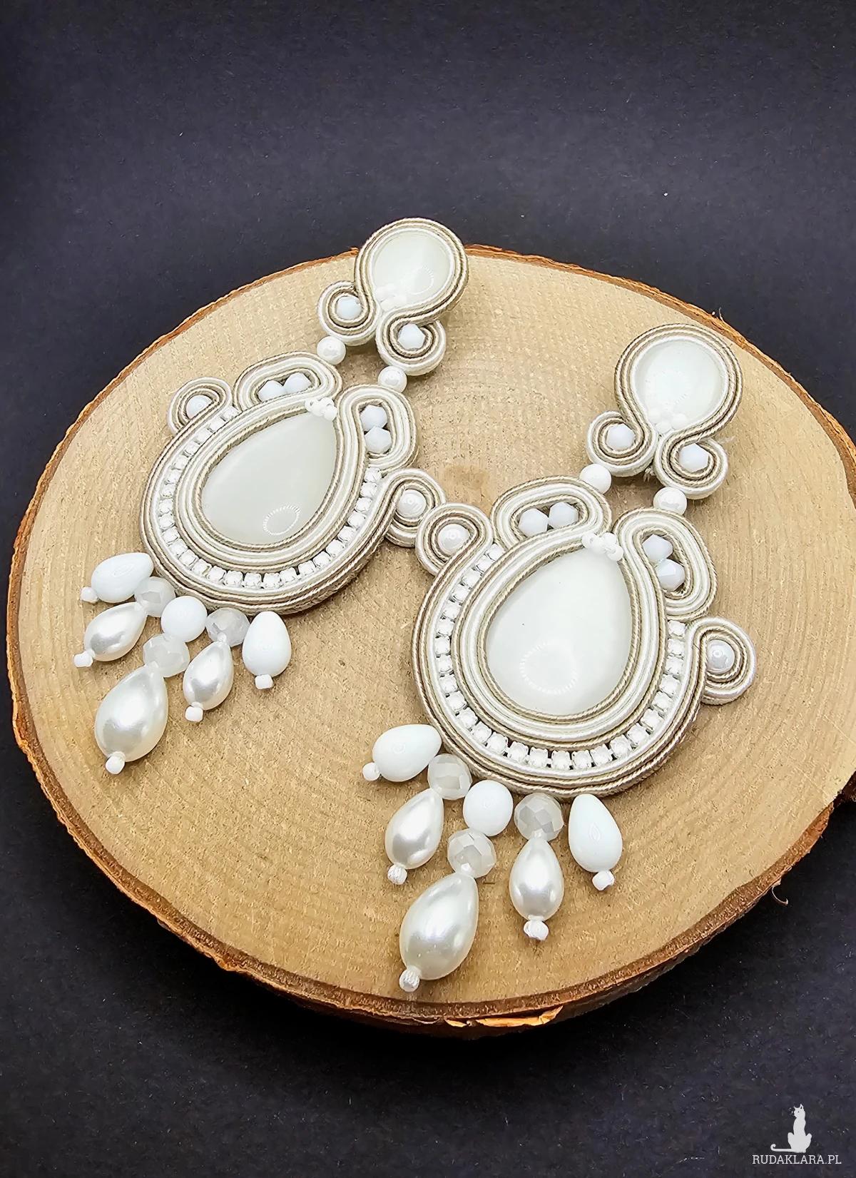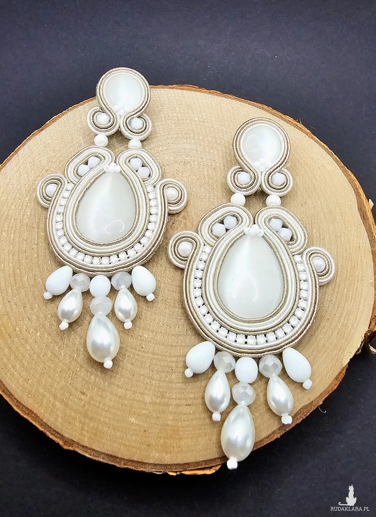 Biało beżowe długie kolczyki sutasz z kocim okiem