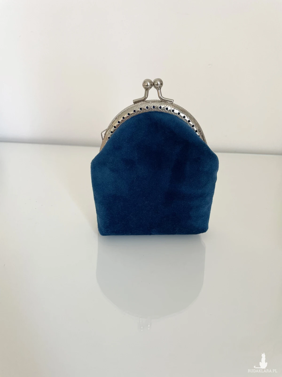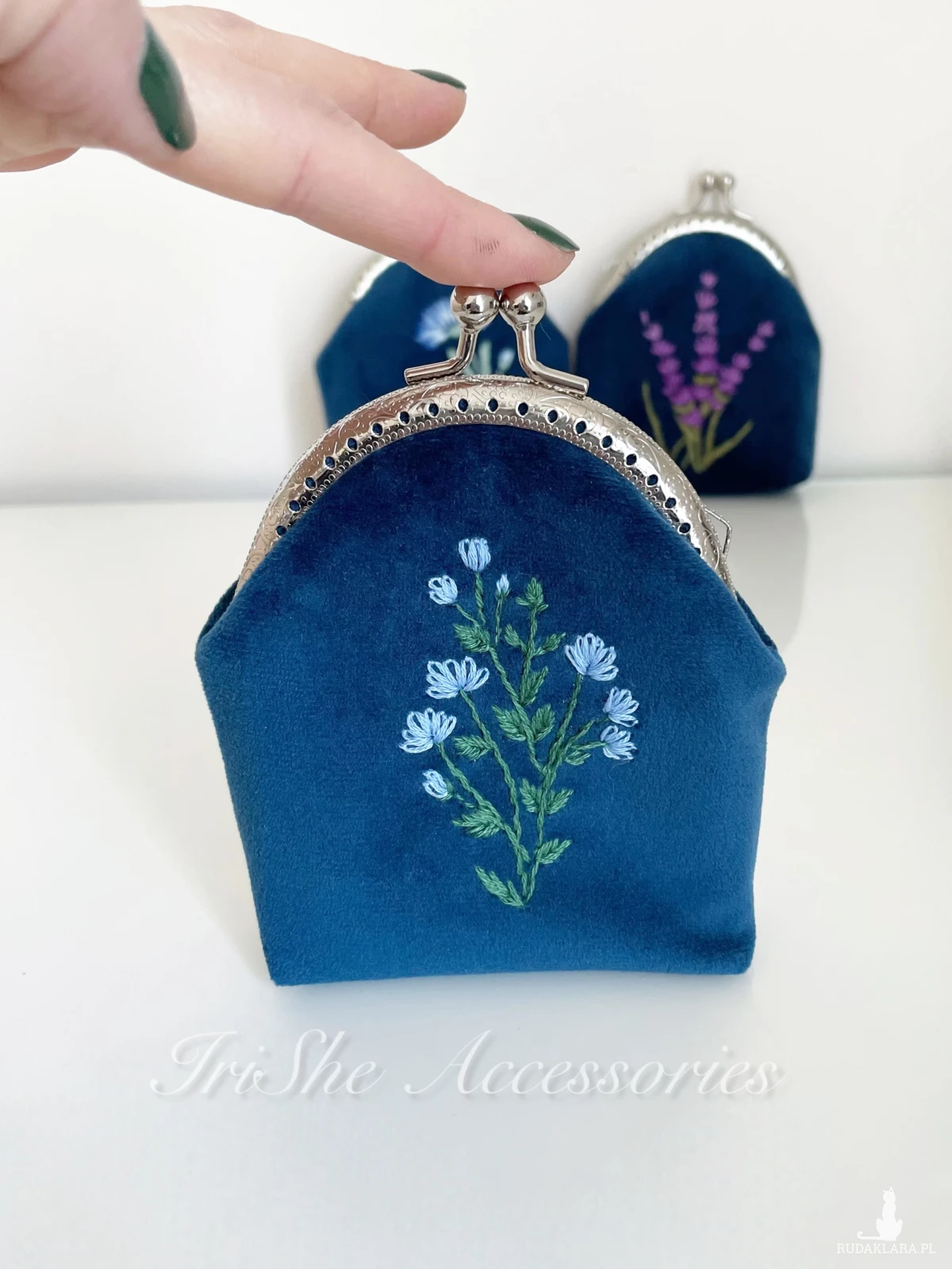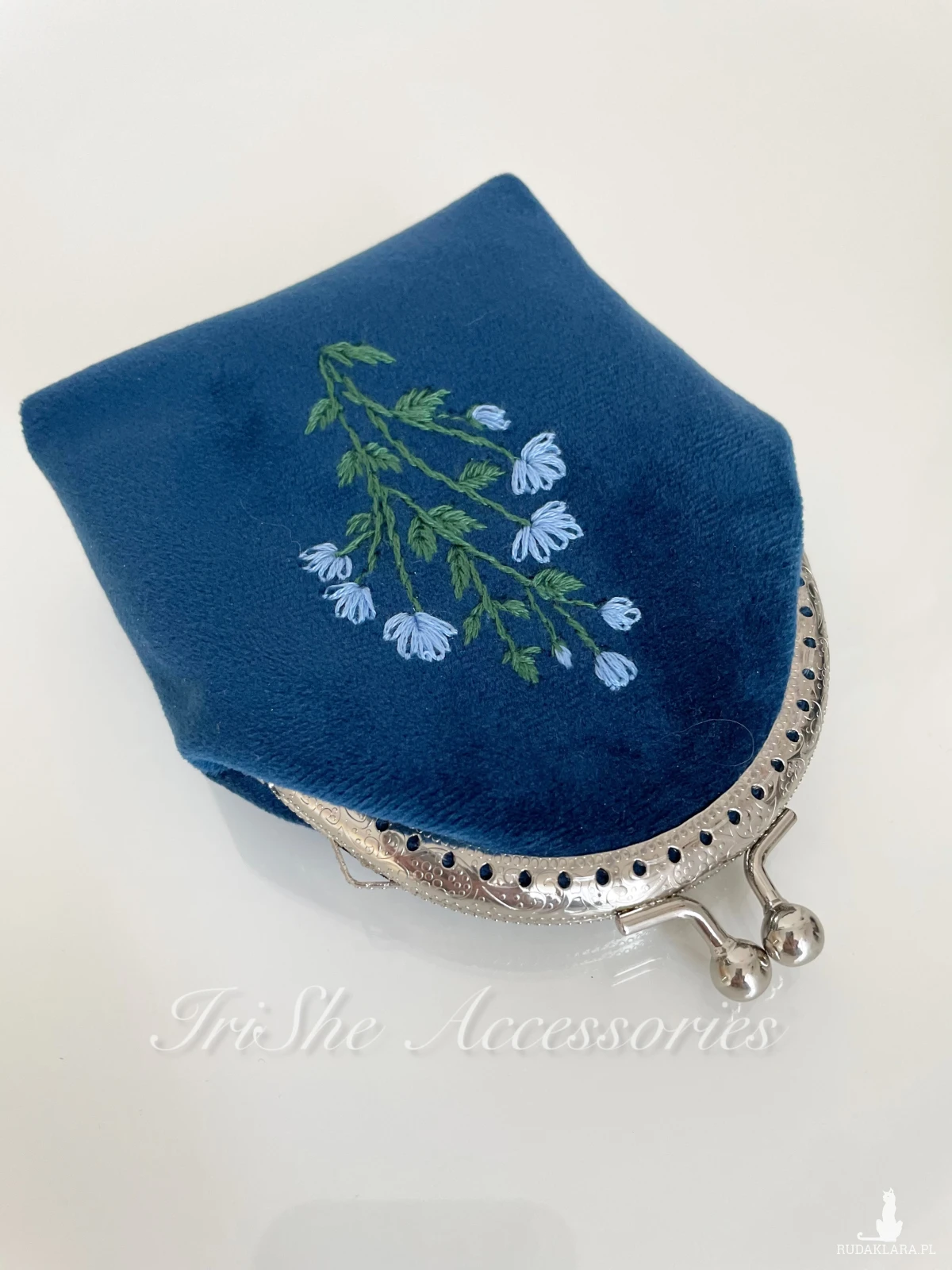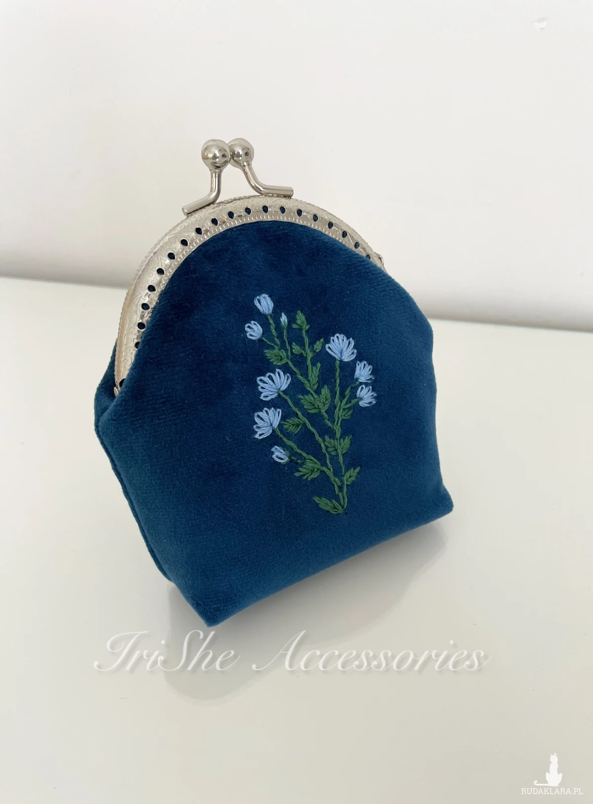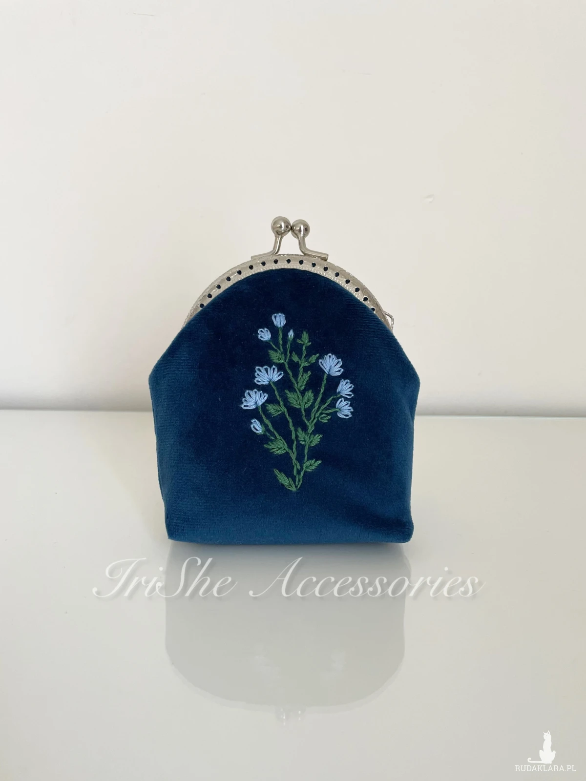 Granatowa portmonetka "Kwiat lnu" – własnoręcznie uszyta i haftowana, wyjątkowo lekka i miękka, doskonała na każdą okazję.