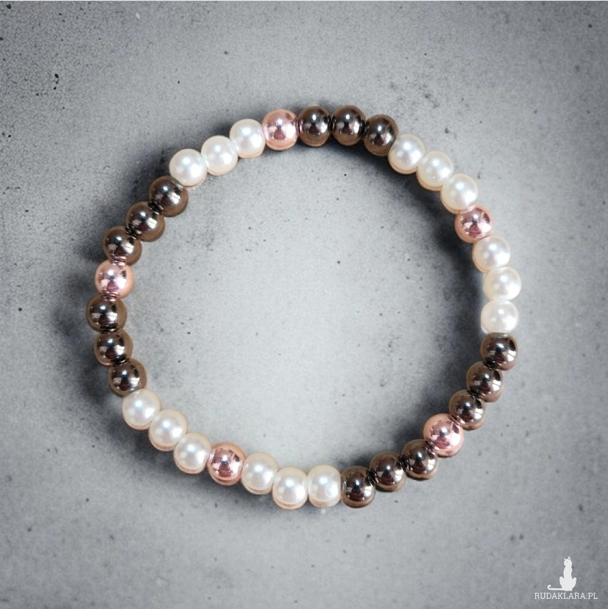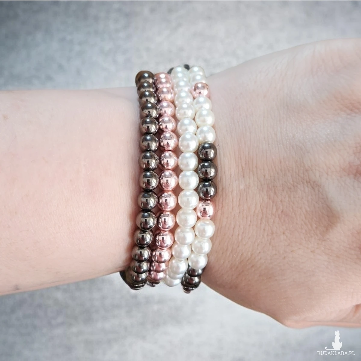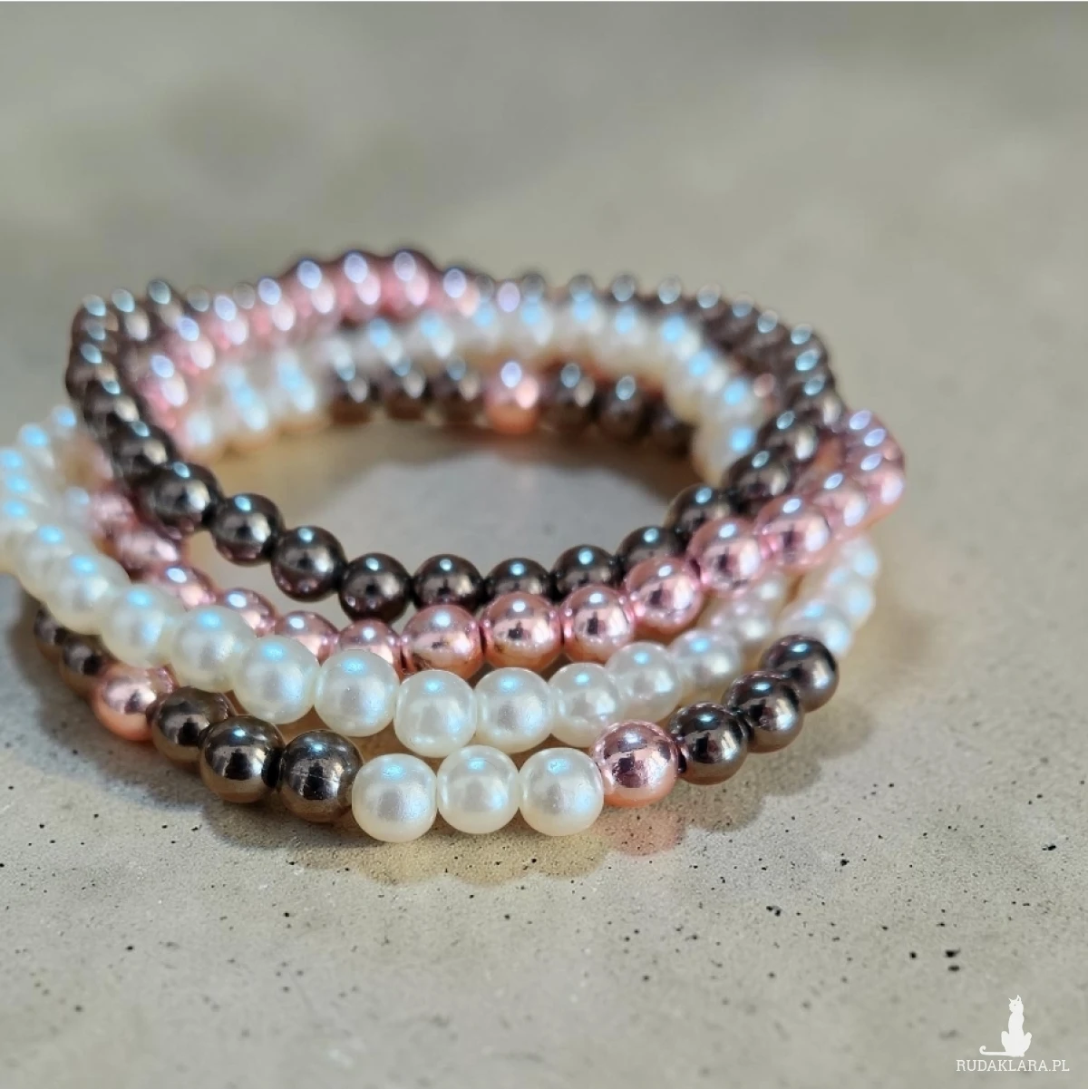 Sprzedam piękny zestaw czterech bransoletek wykonanych z koralików w eleganckiej kolorystyce: perłowej bieli, różowego złota oraz grafitu. Idealne do noszenia razem lub osobno – pasują zarówno do codziennych stylizacji, jak i na wyjątkowe okazje.