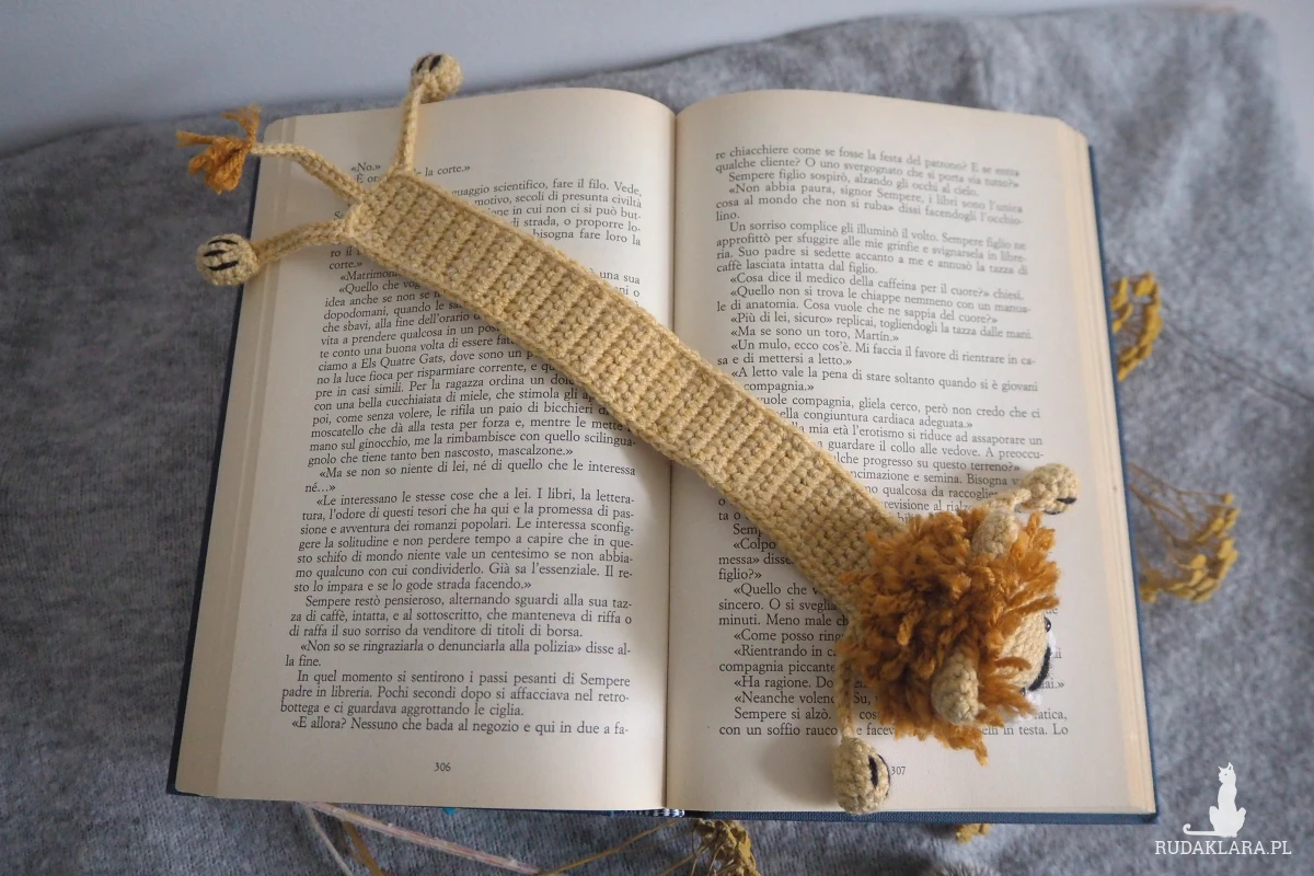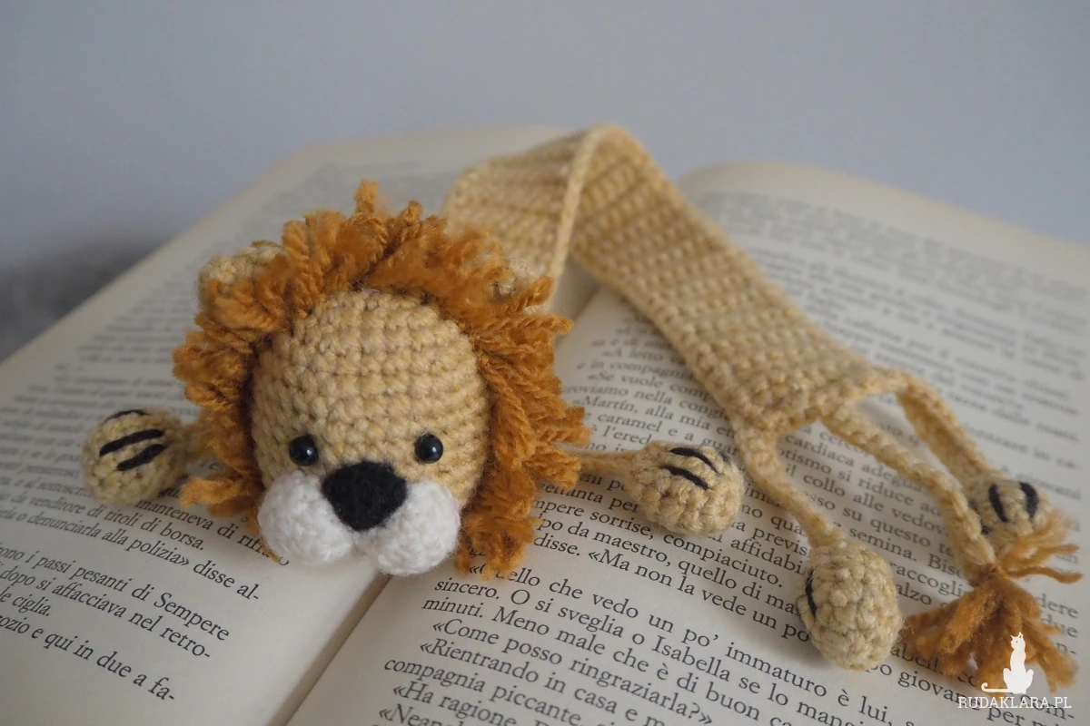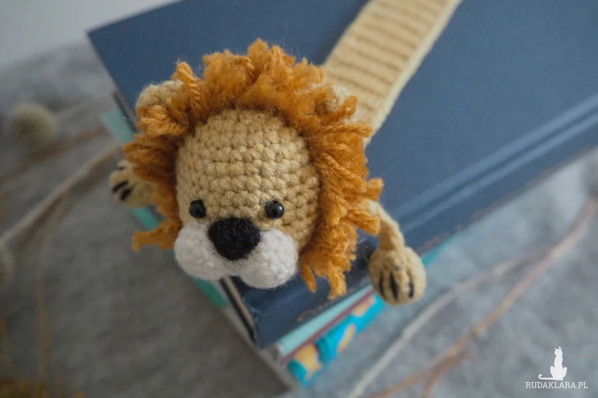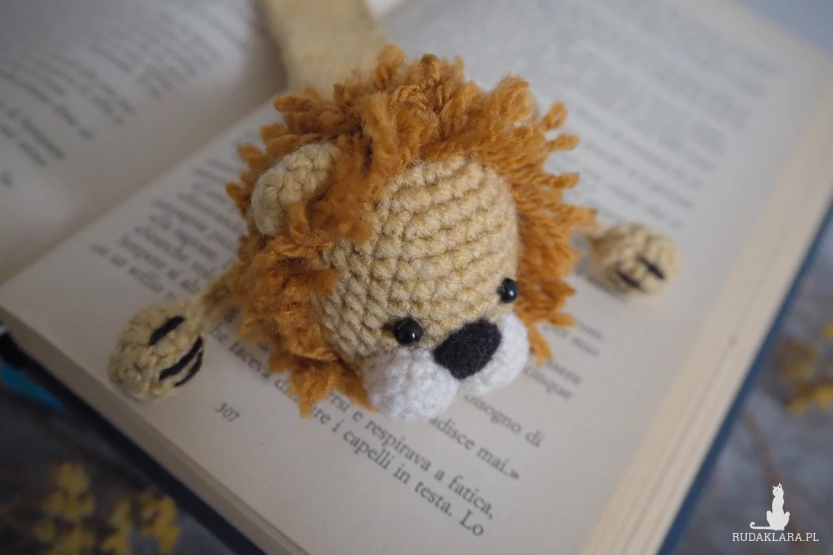Zakładka do książki z sympatycznym lewkiem wykonana z włóczki na szydełku.