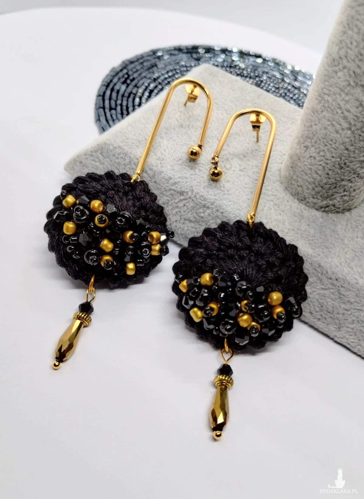 Podstawą jest okrągły element z włóczki w kolorze głębokiej czerni. Został obszyty drobnymi szklanymi koralikami w dwóch odcieniach – czarnym oraz matowego złota.