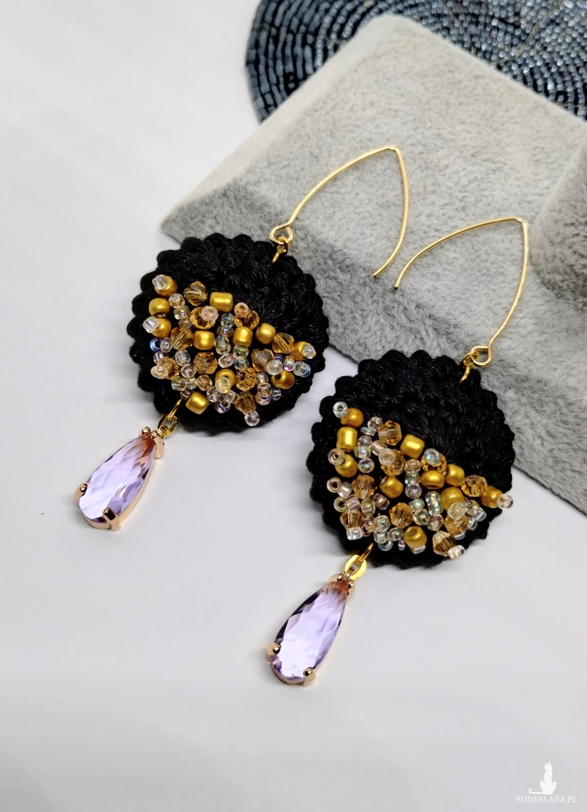 Czarne kolczyki szydełkowe z akcentami złota i fioletu.