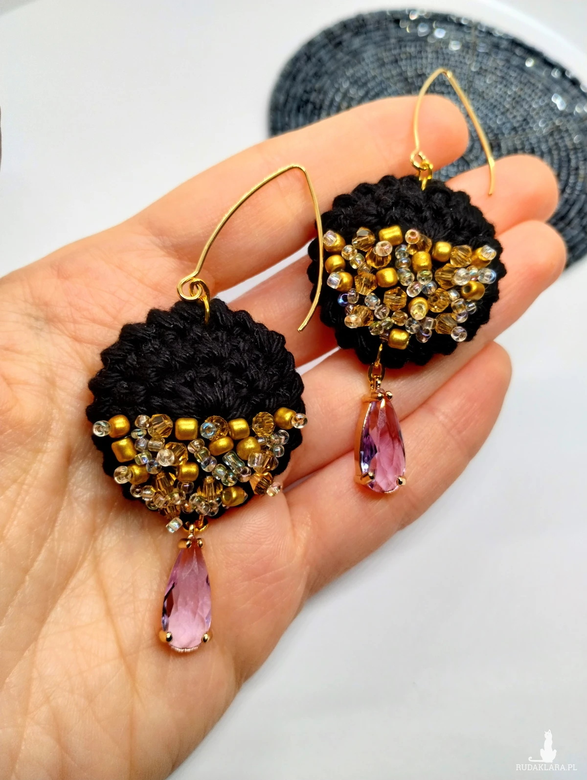 Czarne szydełkowe kolczyki z kryształkami uzupełnią zarówno prostą stylizację, jak i bardziej elegancki strój.