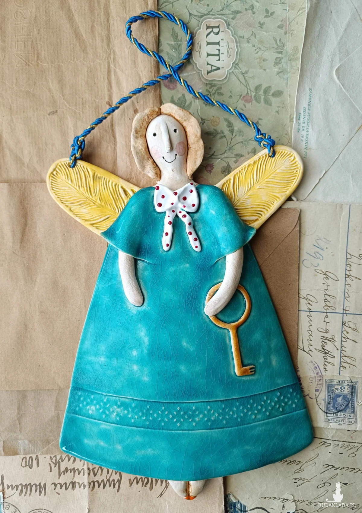 Uroczy aniołek ceramiczny wykonany z gliny szamotowej, wypalony na biskwit, a następnie szkliwiony w temperaturze 1260 stopni C. Wymiary ok 17 cm x 24 cm. Do powieszenia na ścianie na ozdobnym sznureczku. Idealny jako prezent okolicznościowy lub do ozdoby domu.