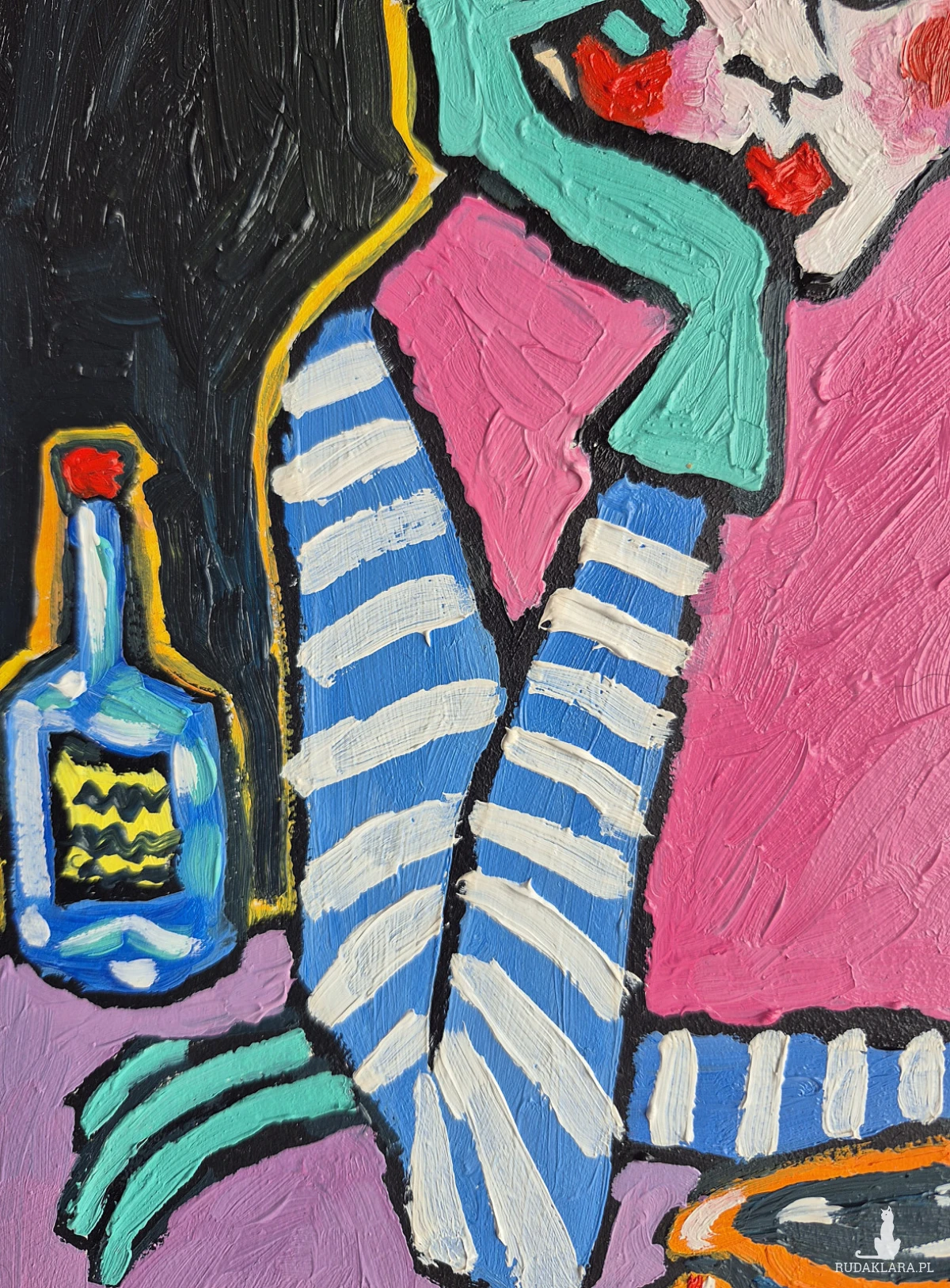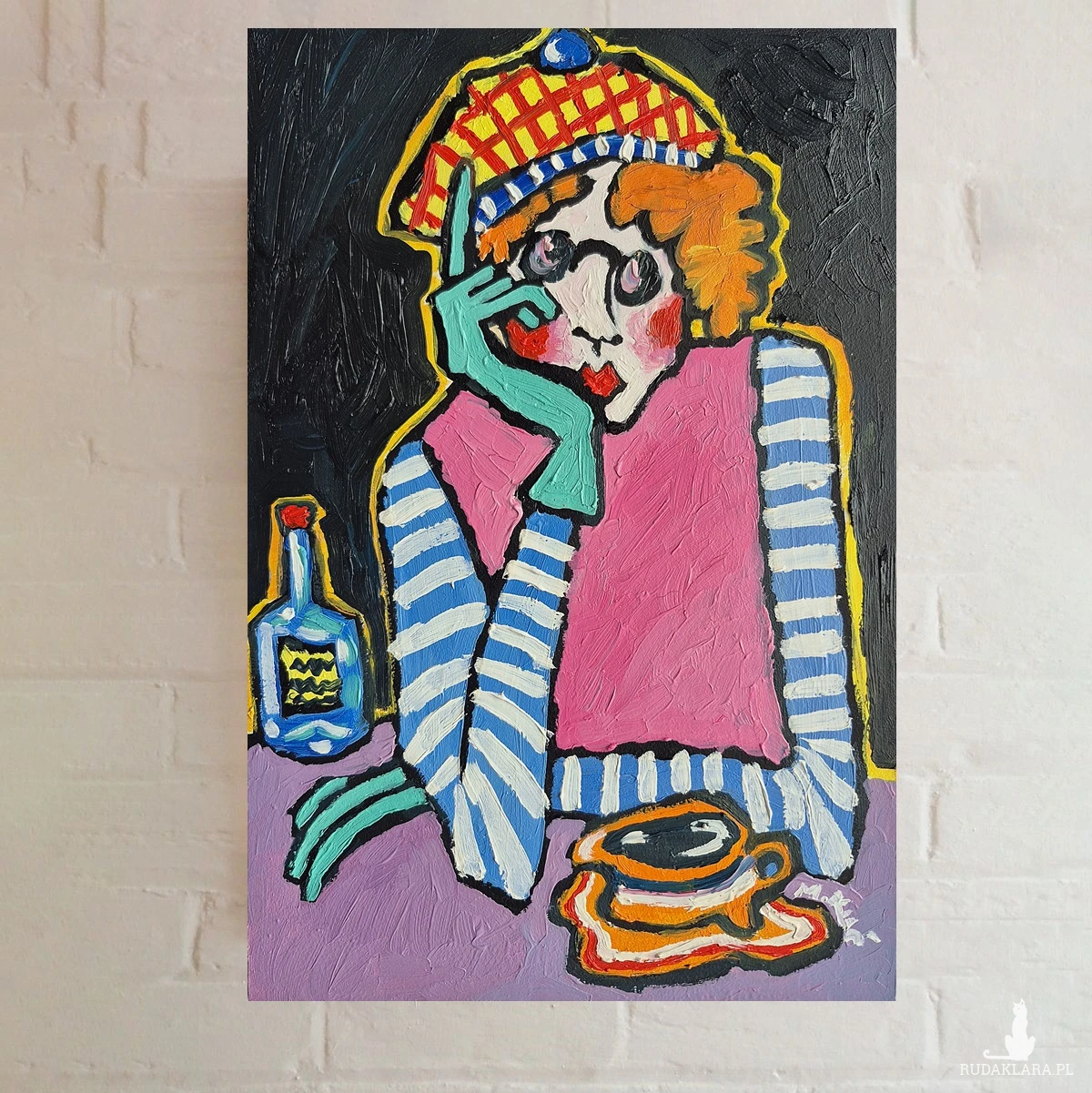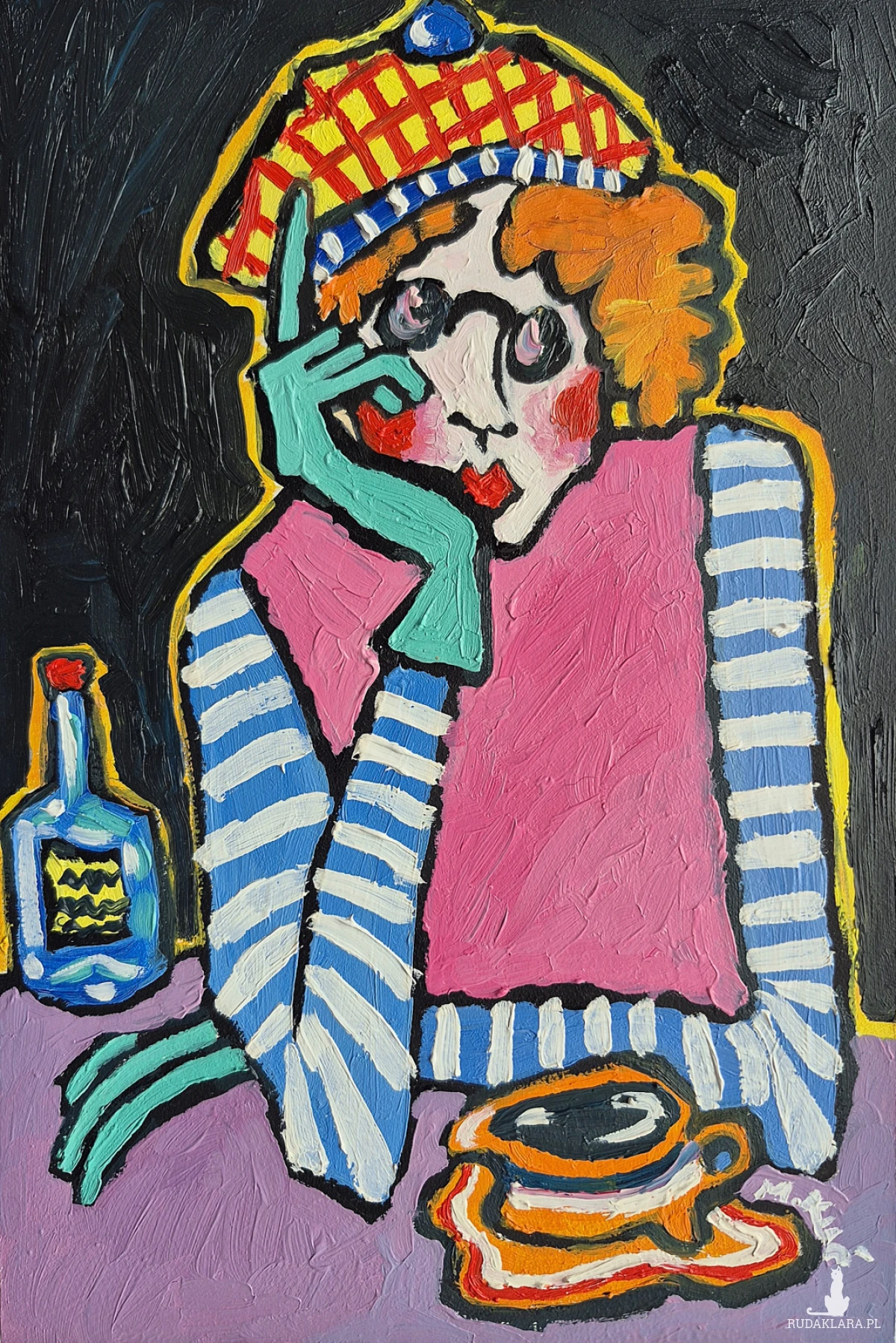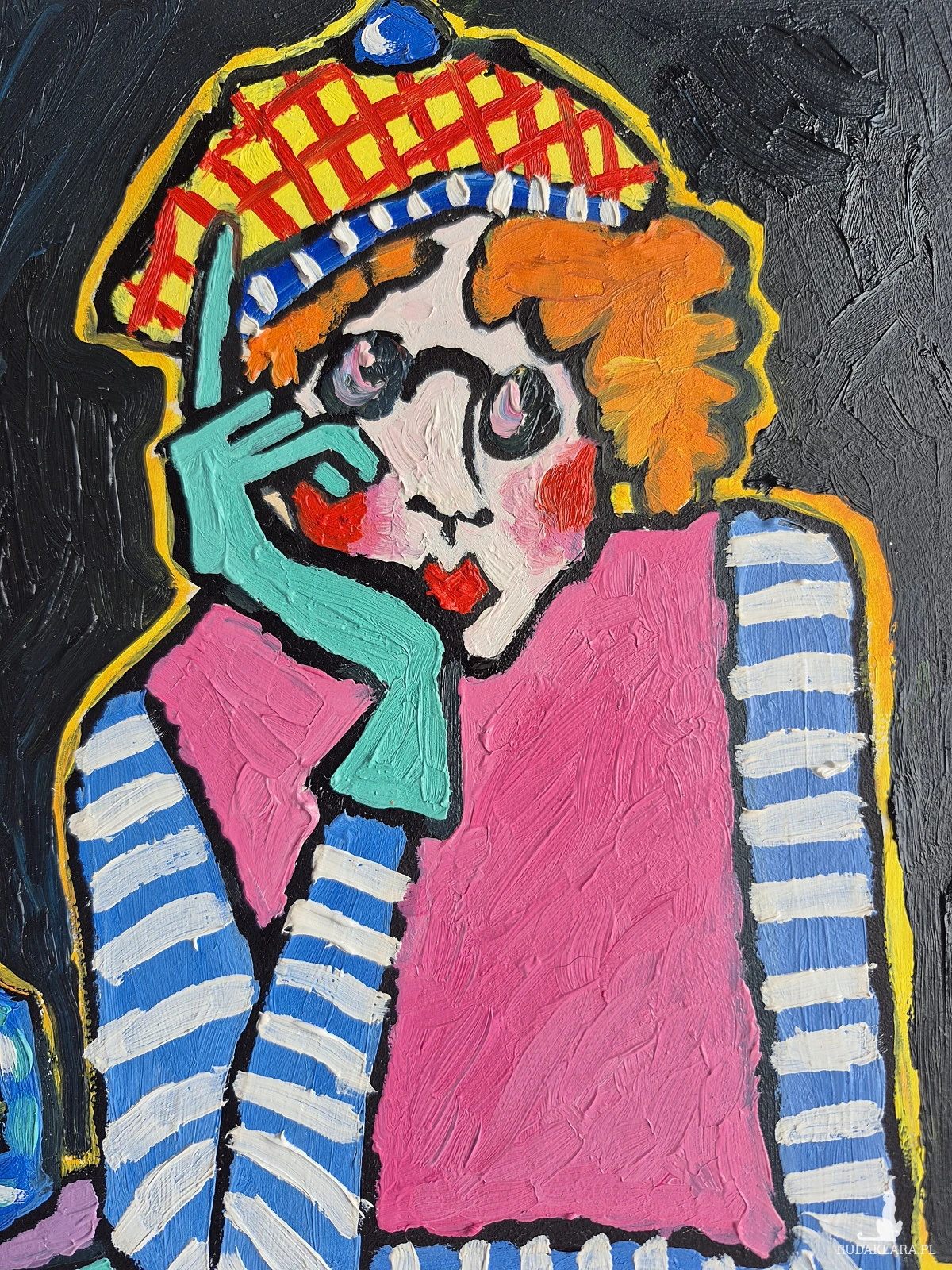 Obraz pulsuje intensywnością barw i emocji, balansując na granicy naiwności i świadomej deformacji. Centralna postać — kobieta o przerysowanych rysach, ukryta za grubymi konturami i kontrastowymi plamami koloru — zdaje się zawieszona w stanie cichej zadumy. Jej twarz, niemal maskowata, z wyraźnie zaznaczonymi rumieńcami i zamyślonym spojrzeniem, niesie w sobie nutę melancholii, ale i subtelnej ironii.