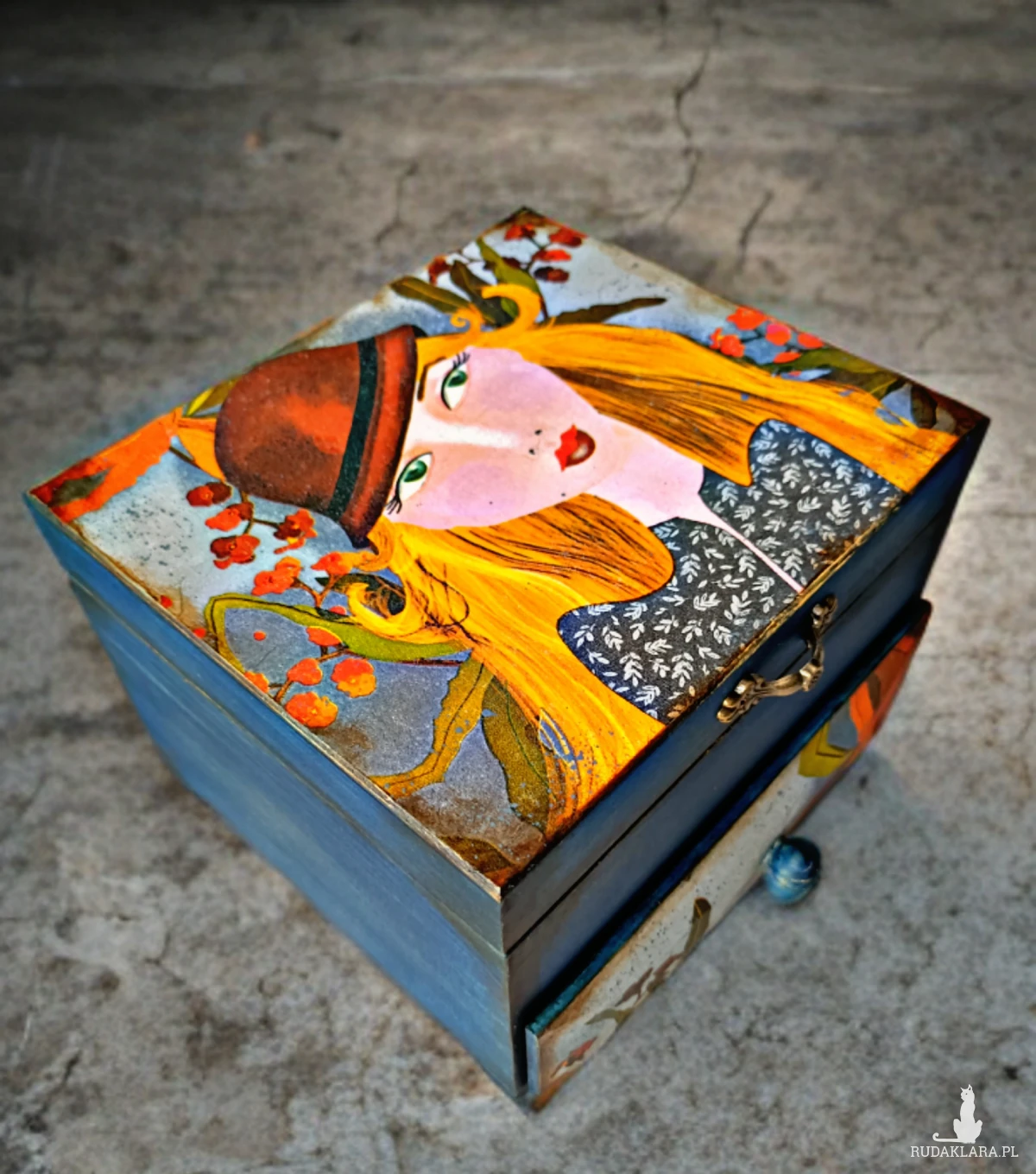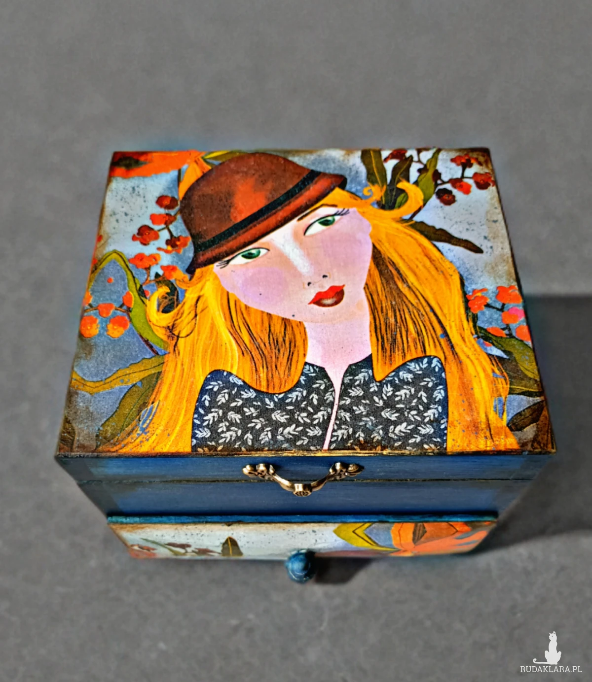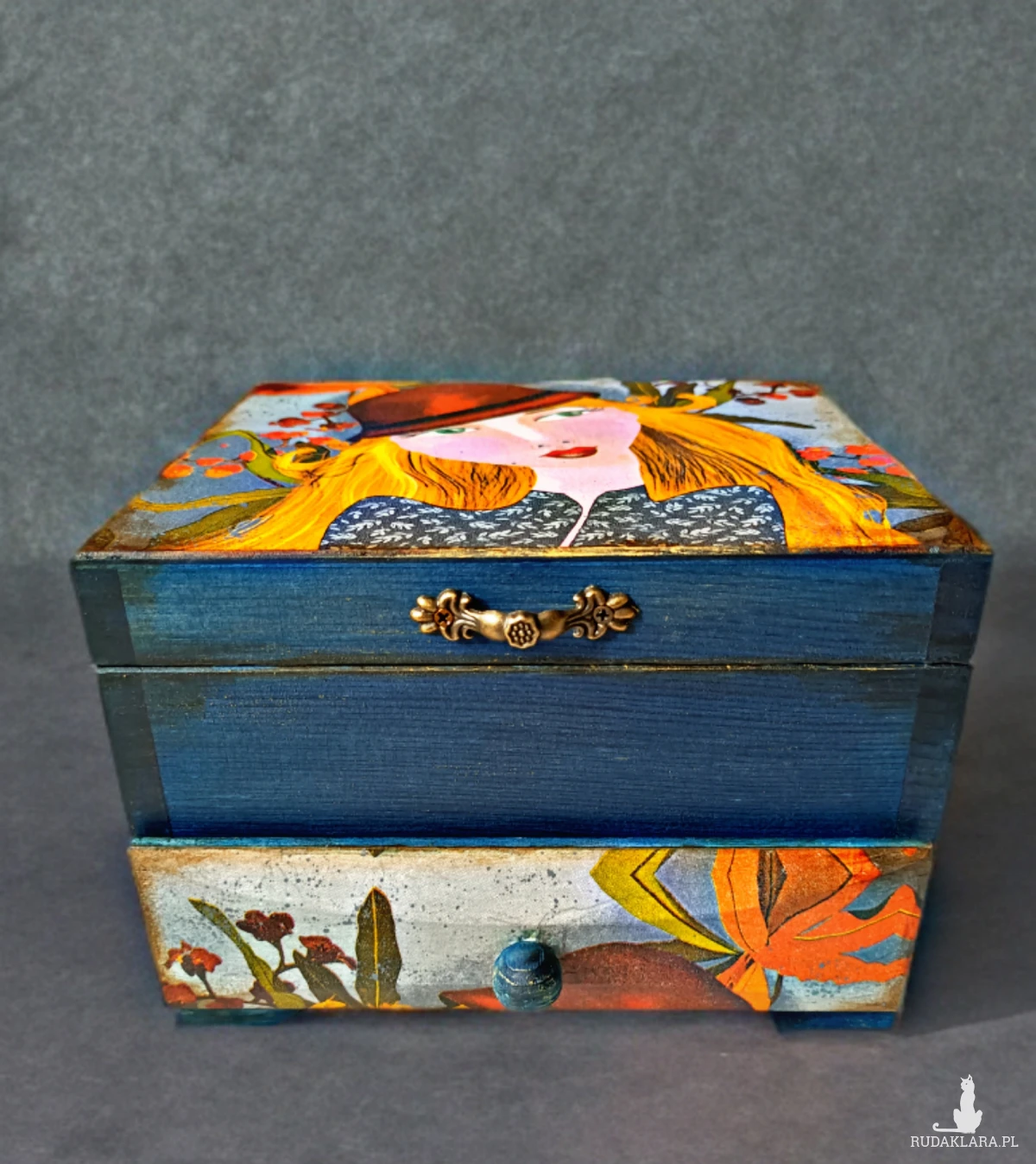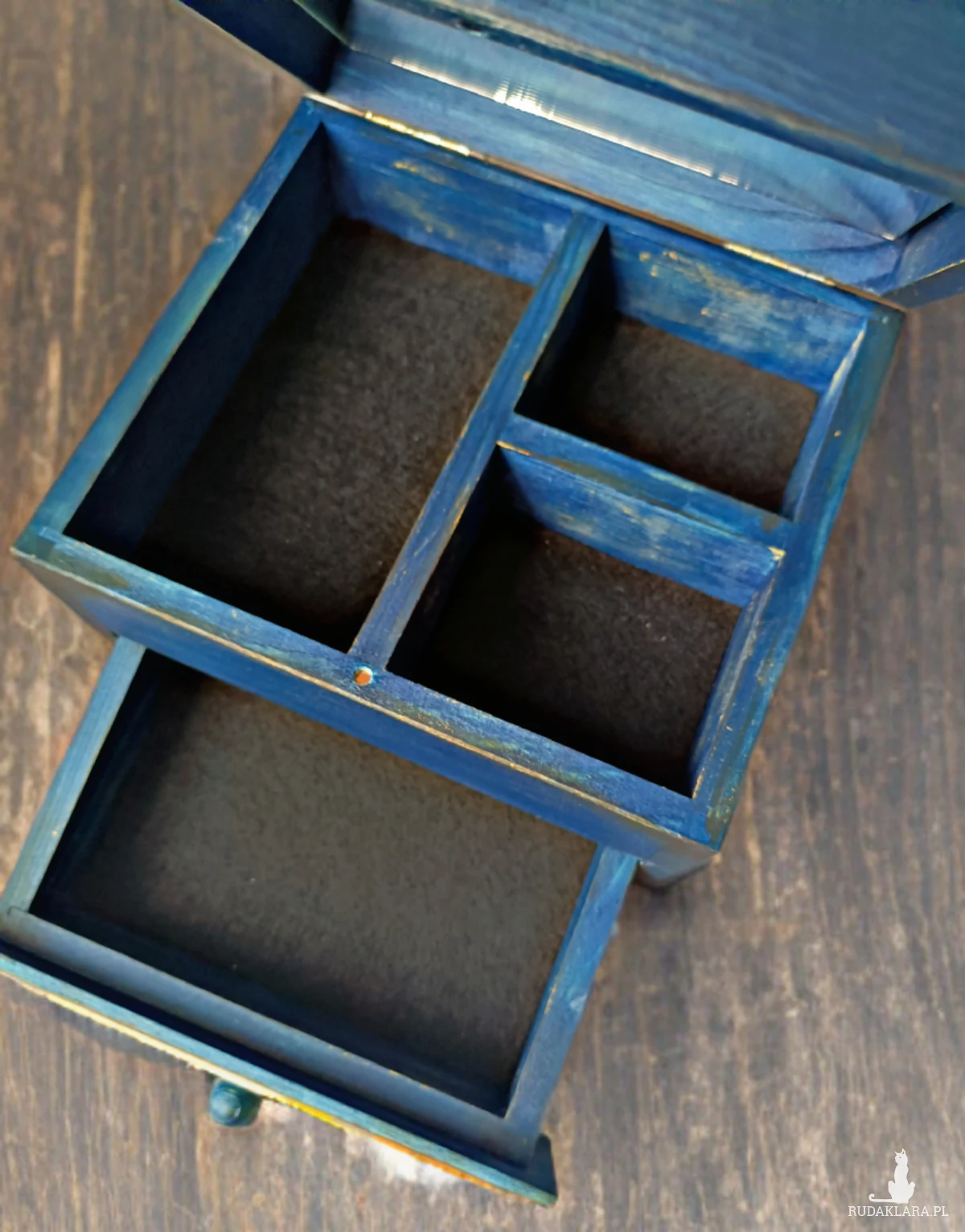 Drewniana skrzyneczka na biżuterię, z przegródkami, dodatkową szufladką i lusterkiem. Zamykana na mały magnesik.