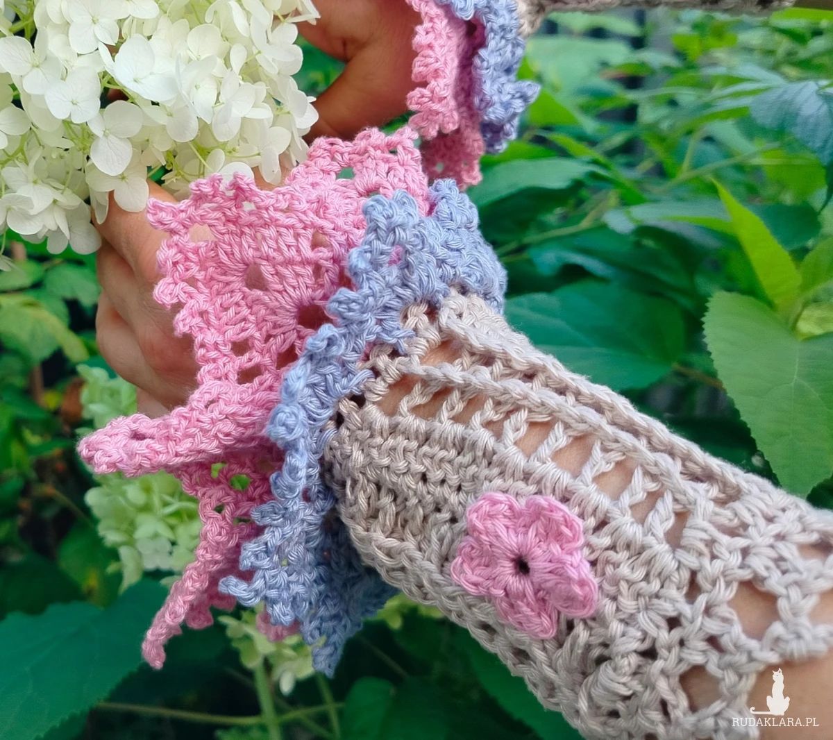 Urocze, bardzo kobiece koronkowe mitenki wykonane ręcznie. Kolory: beżowy, różowy, niebieski. Bawełna 100%.