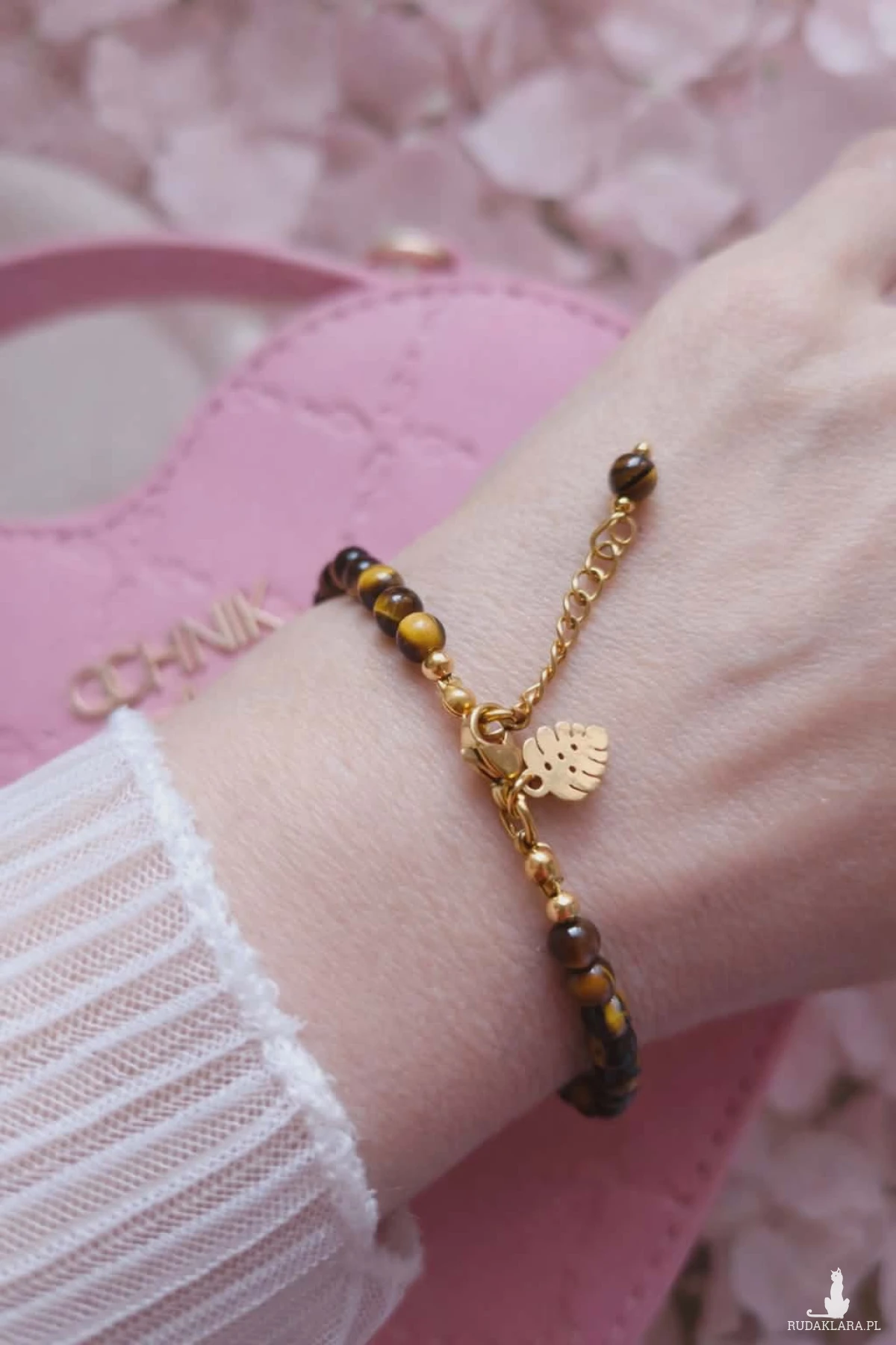 Ciepłe odcienie brązu i złota tworzą harmonijną kompozycję, a zawieszka w kształcie liścia monstery nadaje całości subtelnego, naturalnego charakteru. Kolor kamieni może nieznacznie różnić się od przedstawionego na zdjęciu, co wynika z ich naturalnego pochodzenia.