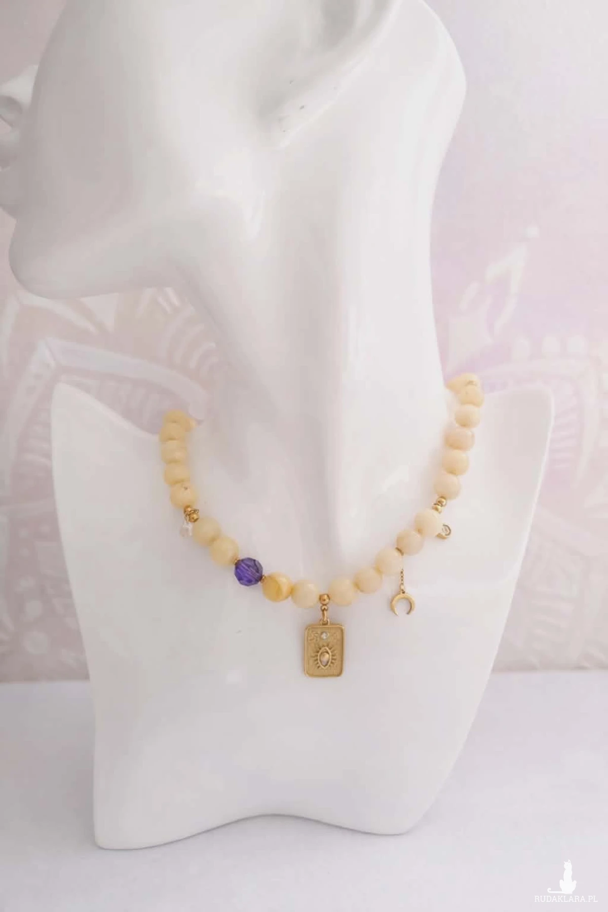 Piękny naszyjnik stworzony z naturalnego nefrytu miodowego w formie kul o średnicy 10 mm, których ciepły, słoneczny odcień przyciąga spojrzenie i otula swoją energią. Całość przełamana została pojedynczym kryształkiem Swarovski w pięknym odcieniu fioletu, dodającym subtelnego blasku i lekkości.