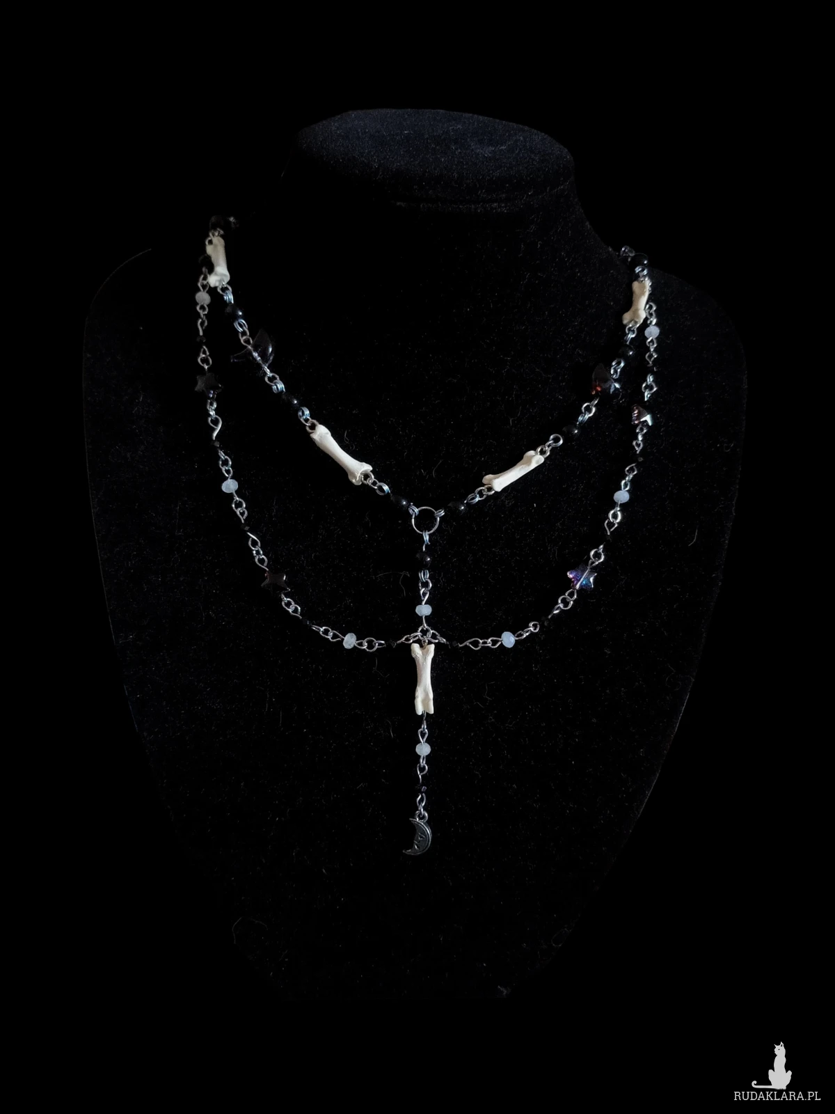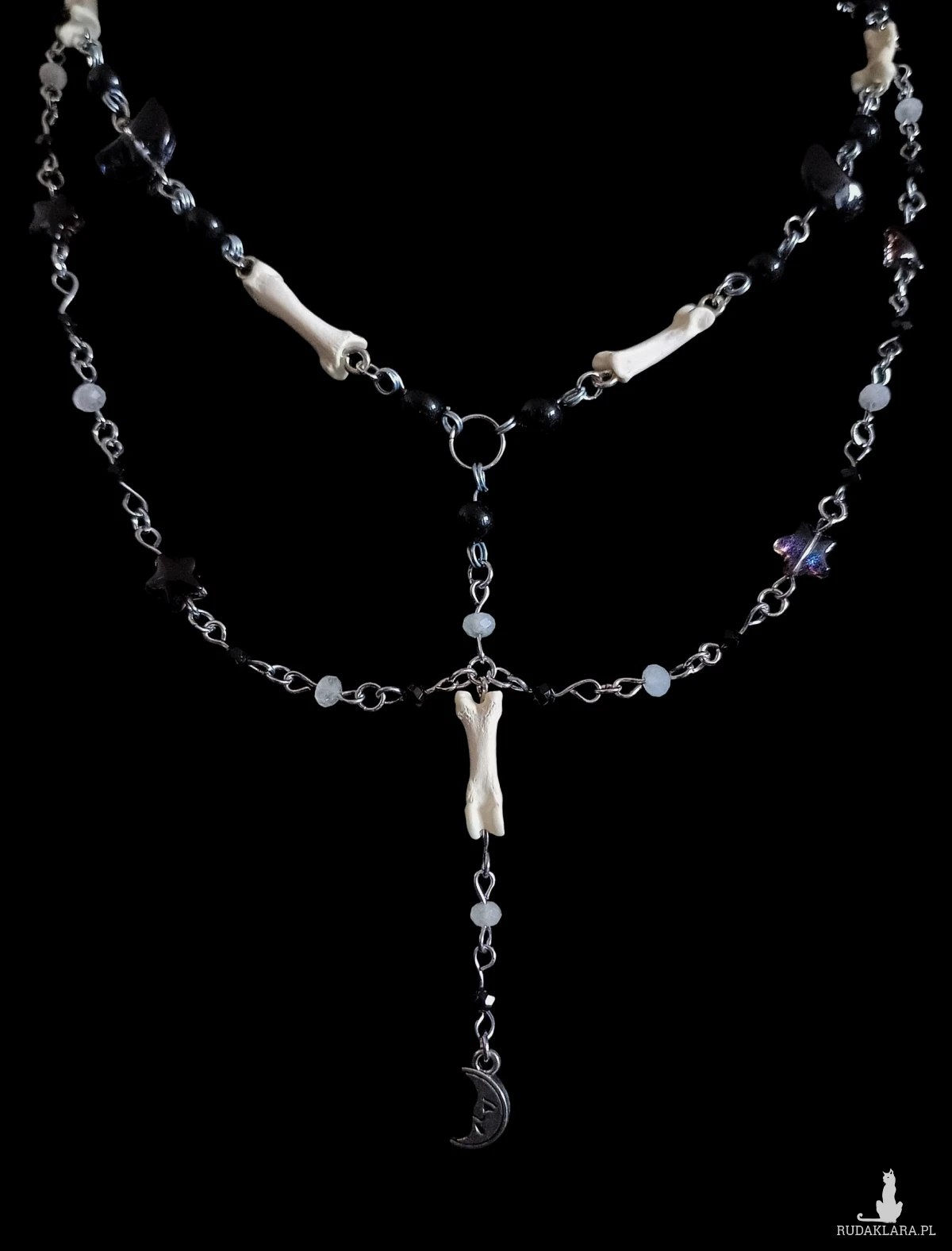 Wykonany ze szklanych koralików w kształcie gwiazdek i księżyców, koralików z kwarcu oraz lisich kostek podniebny naszyjnik z zawieszką księżycem 🌜