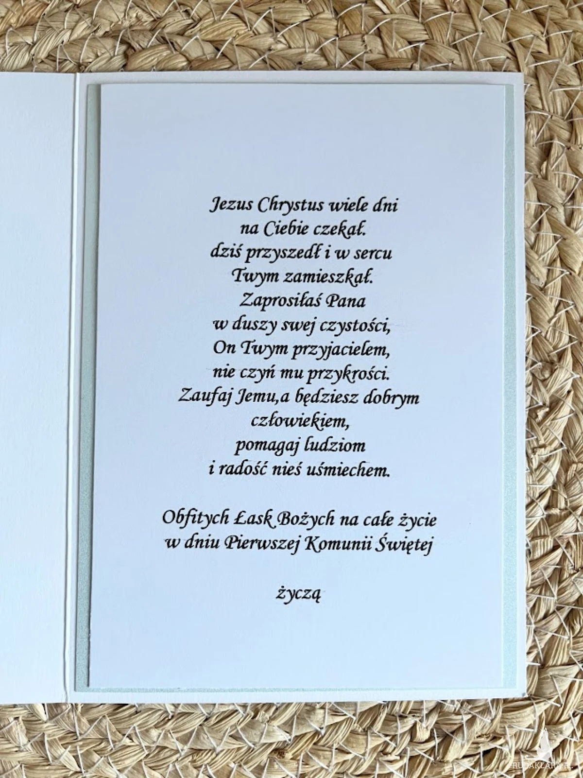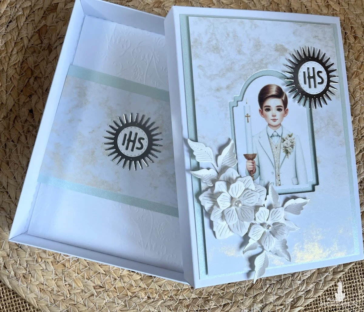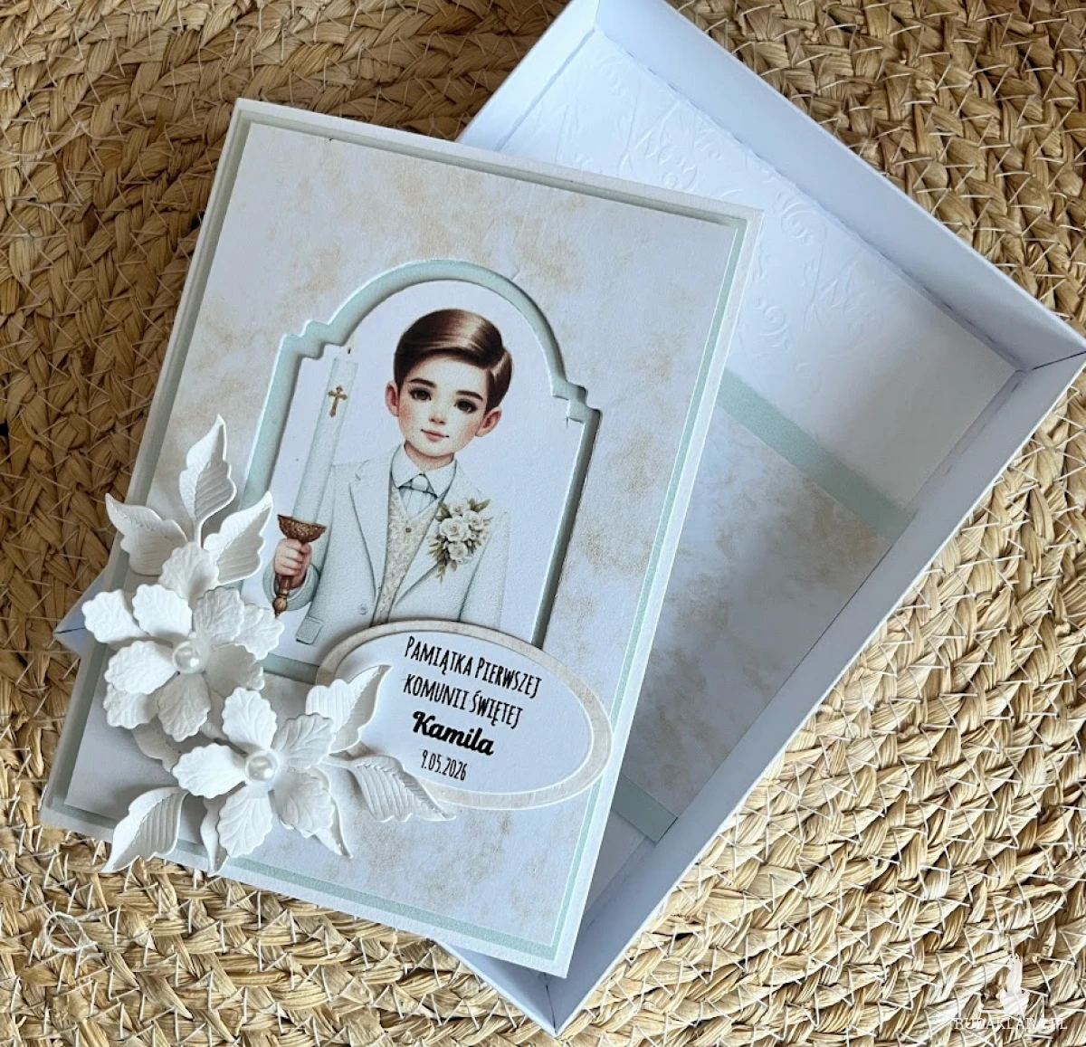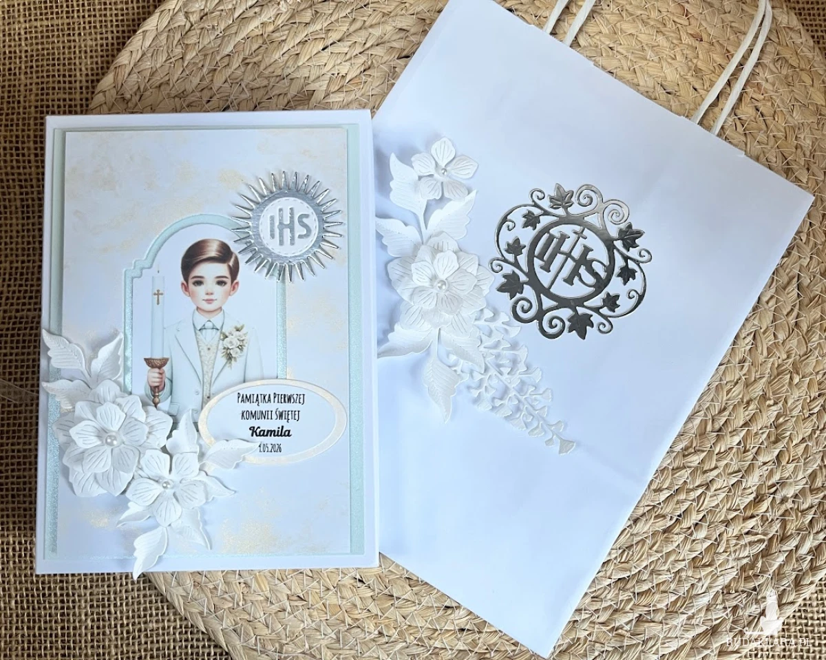 Elegancka, bogato zdobiona kartka w pudełku z okazji Pierwszej Komunii Świętej. Utrzymana w całości w bieli , błękitu z elementem srebra Ozdobiona postacią chłopca i białych kwiatów ,ręcznie robionych.Kartka jest w całości wykonana ręcznie z najlepszej jakości materiałów do scrapbookingu. Wielkość pudełka 13,0×17,5×2,5 cm Wielkość kartki 10,5×14,5cm z gotowymi życzeniami.do własnoręcznego podpisu.. Na dnie pudełka umieszczono kieszonkę na małe co nieco.Do kartki dołączono torebkę ozdobioną IHS i kwiatami. Wielkość torebki 22,5x18x8cm.Jest możliwość dodania imienia ,daty Komunii oraz osób składających życzenia.