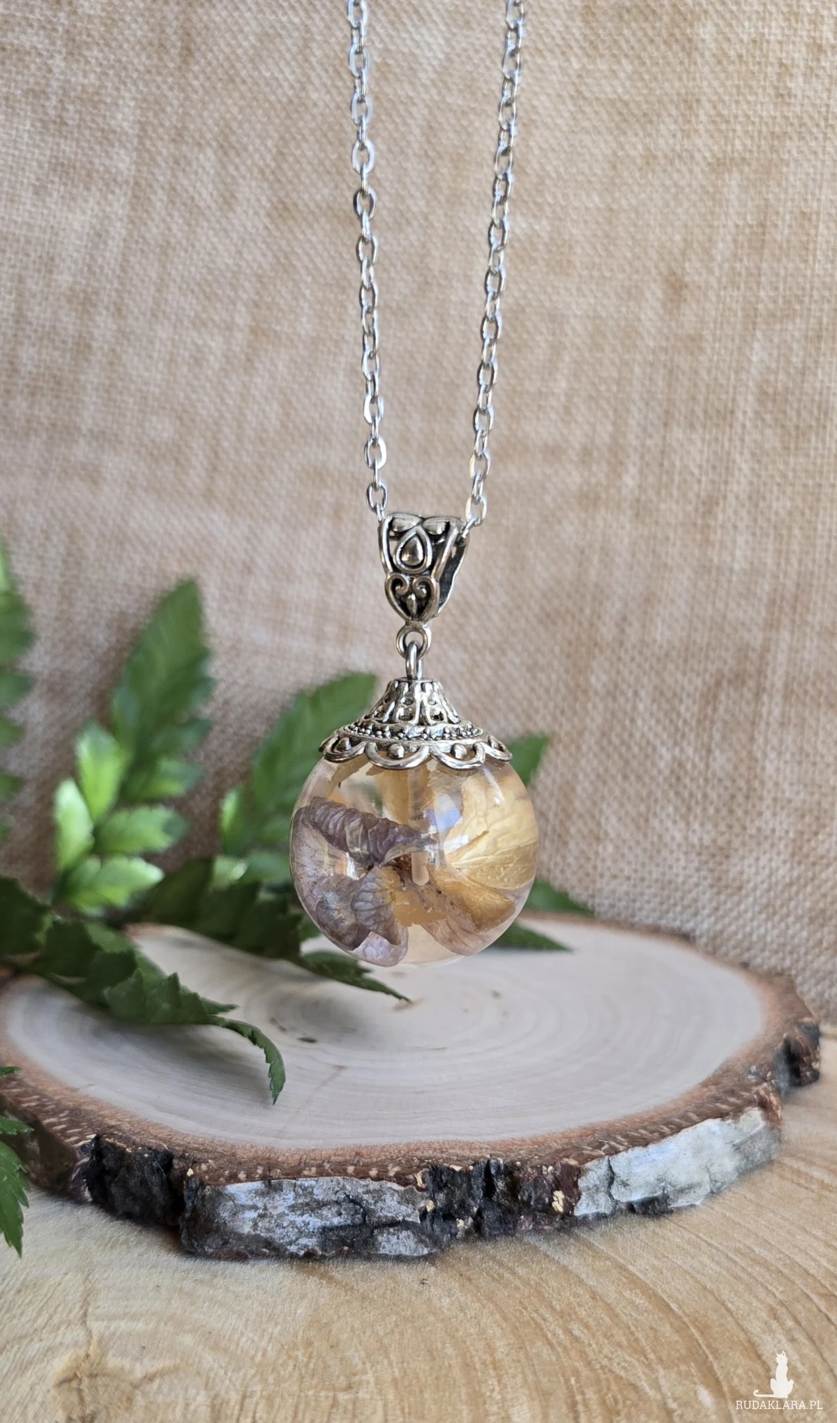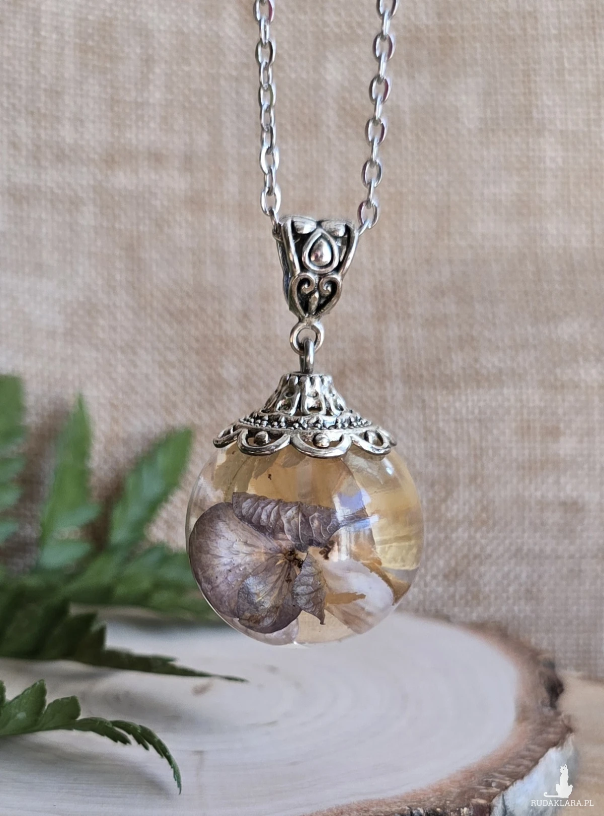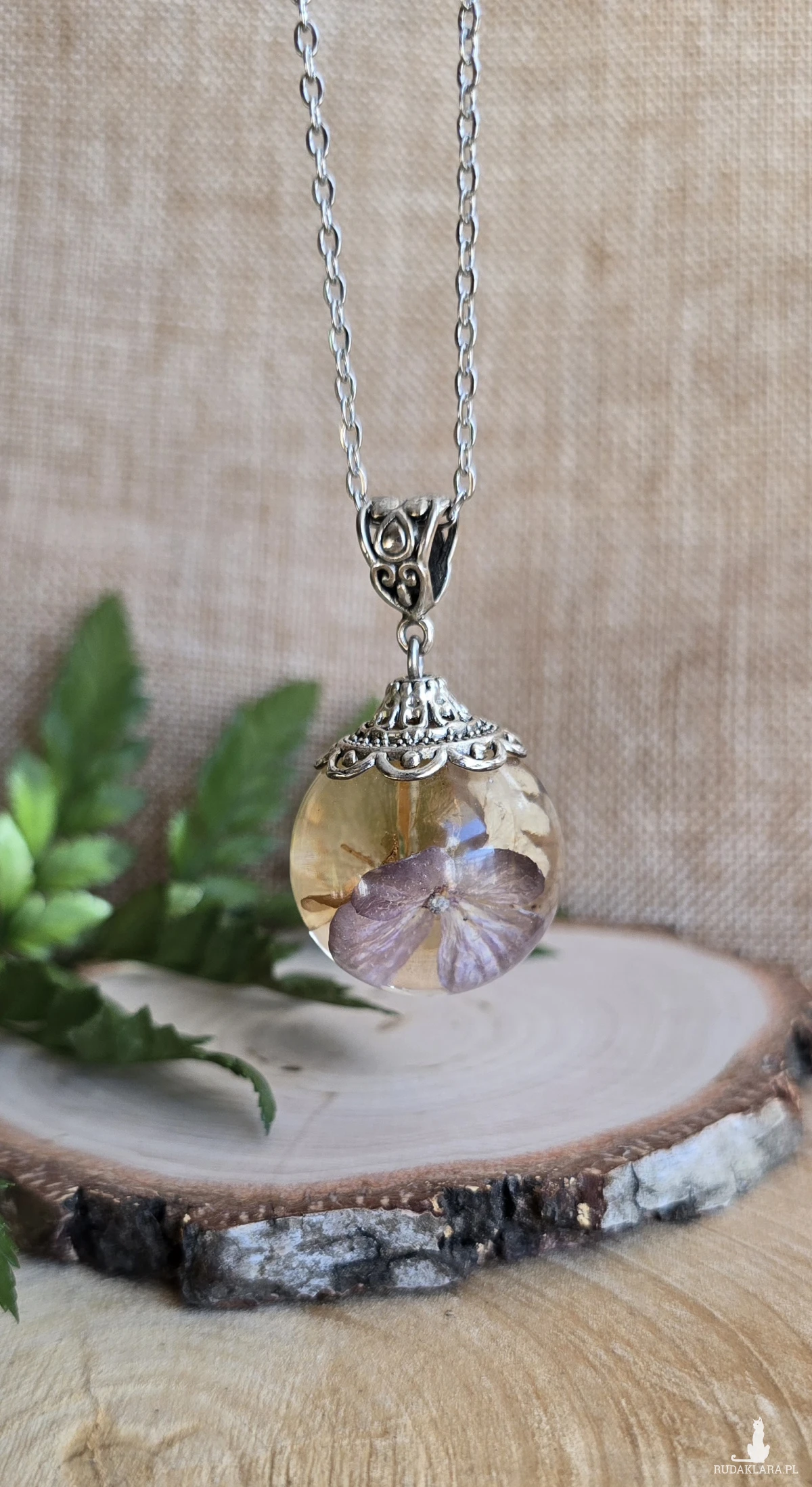 Oferuję Państwu unikalną biżuterię. Zawieszka jest wykonana z suszonych kwiatów i żywicy epoksydowej. Biżuteria jest wspaniałym i oryginalnym prezentem na lata.