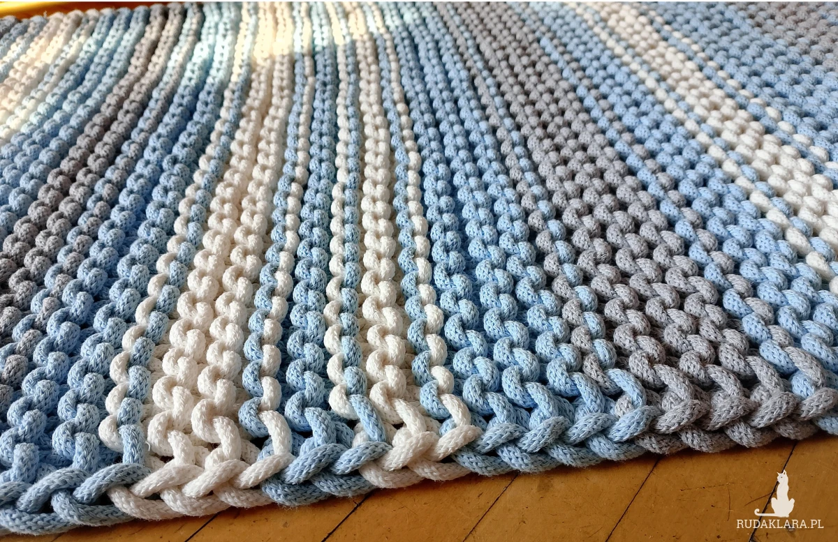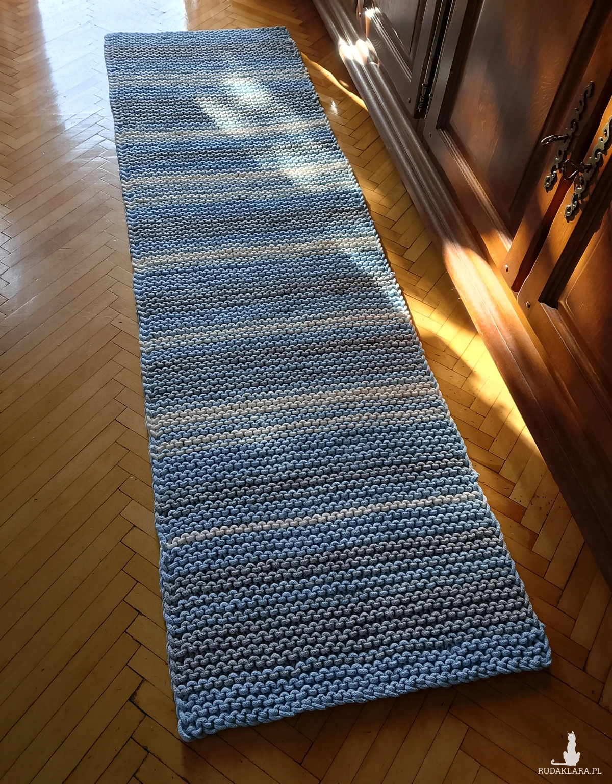 Dywan, chodnik wykonany ręcznie na drutach. Dywan jest dwustronny. Może zostać wykorzystany również jako kilim.