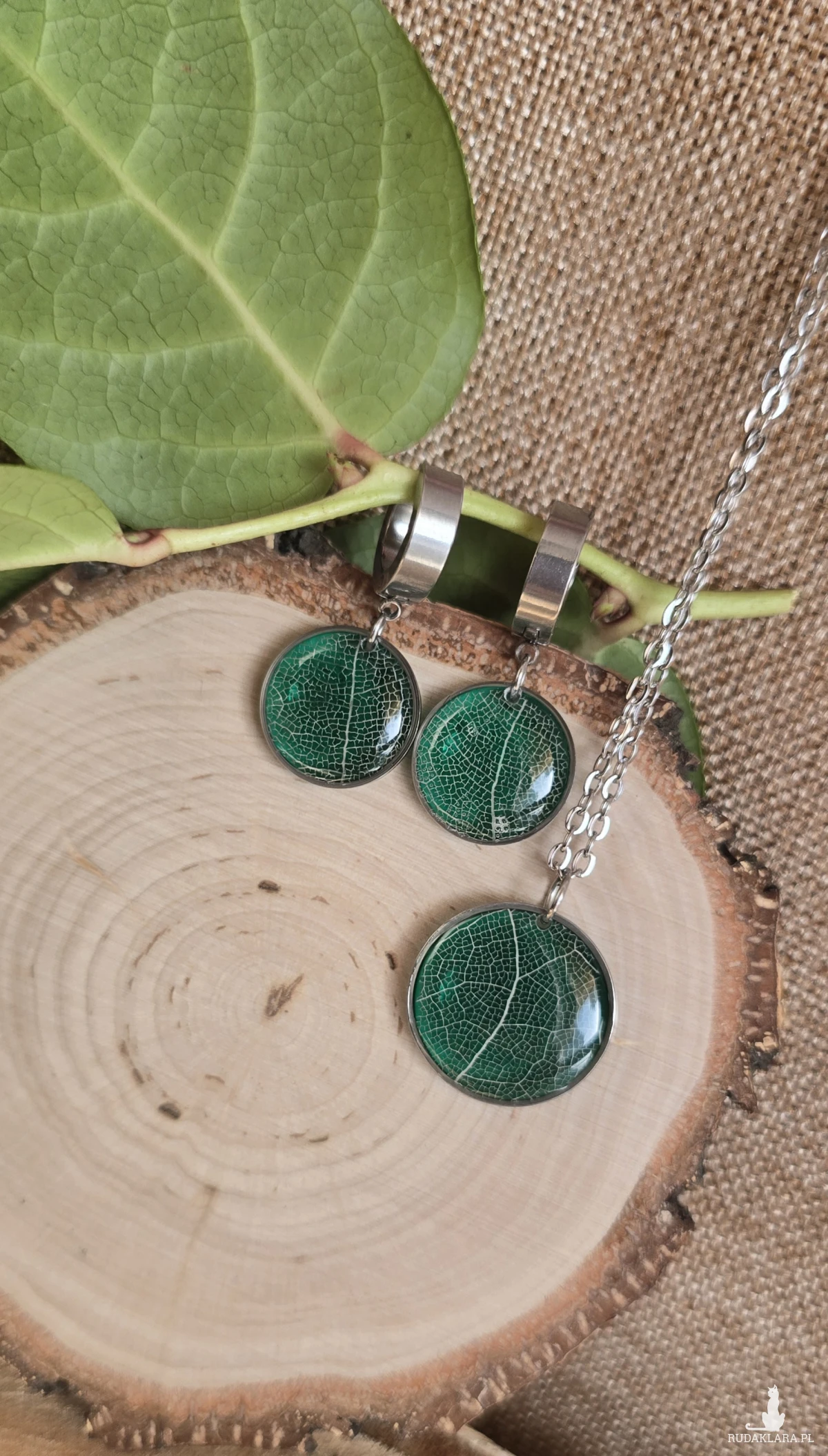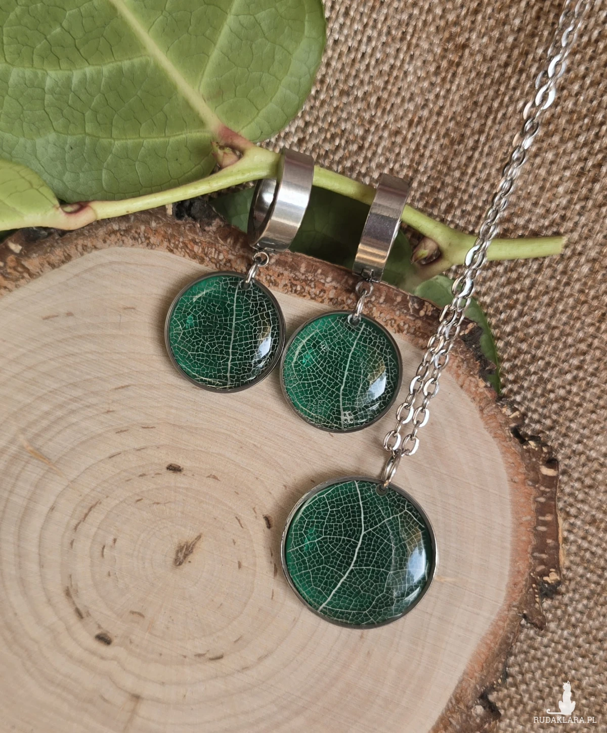 Komplet kolczyki srebrna zawieszka srebrny wisiorek liść prawdziwa roślina zielony