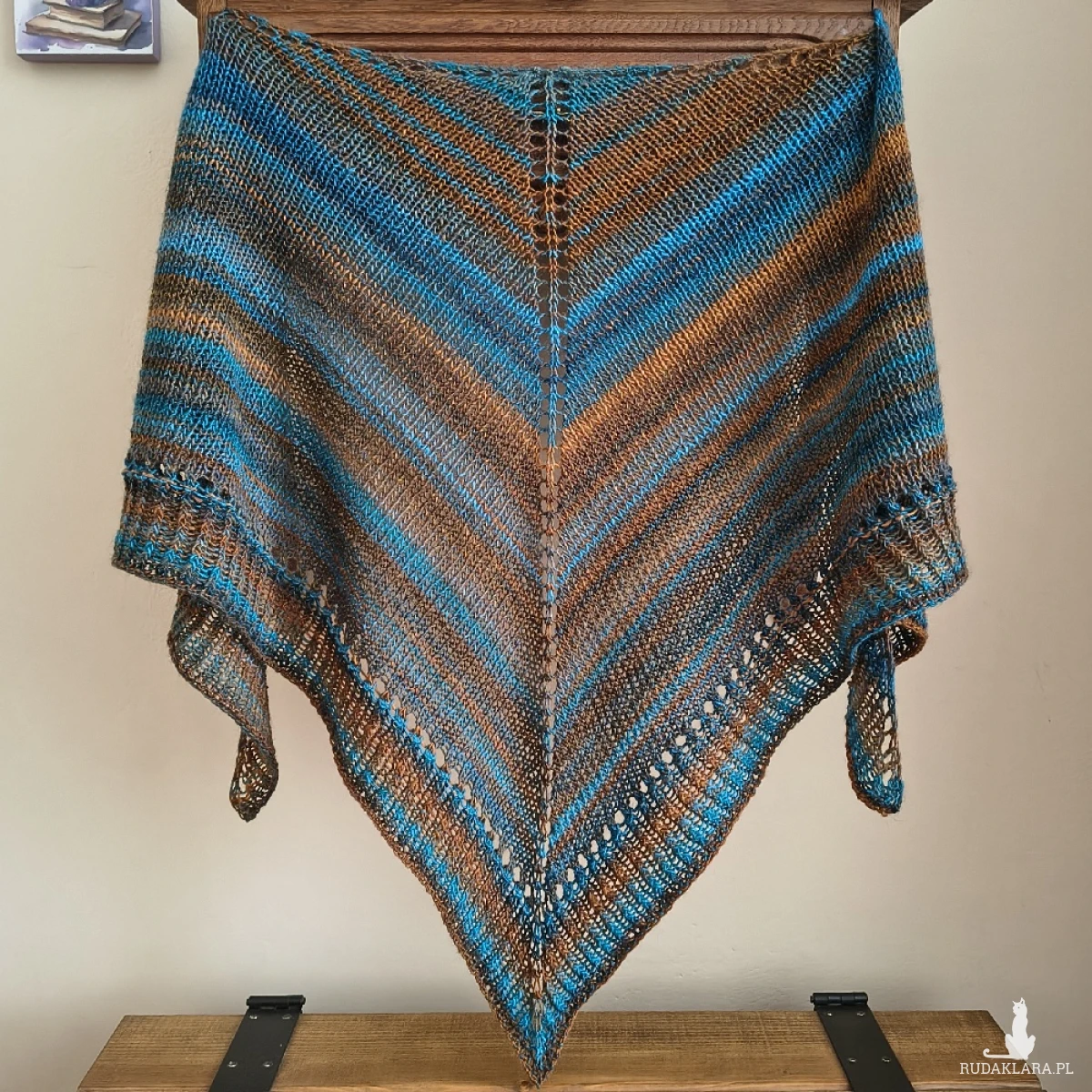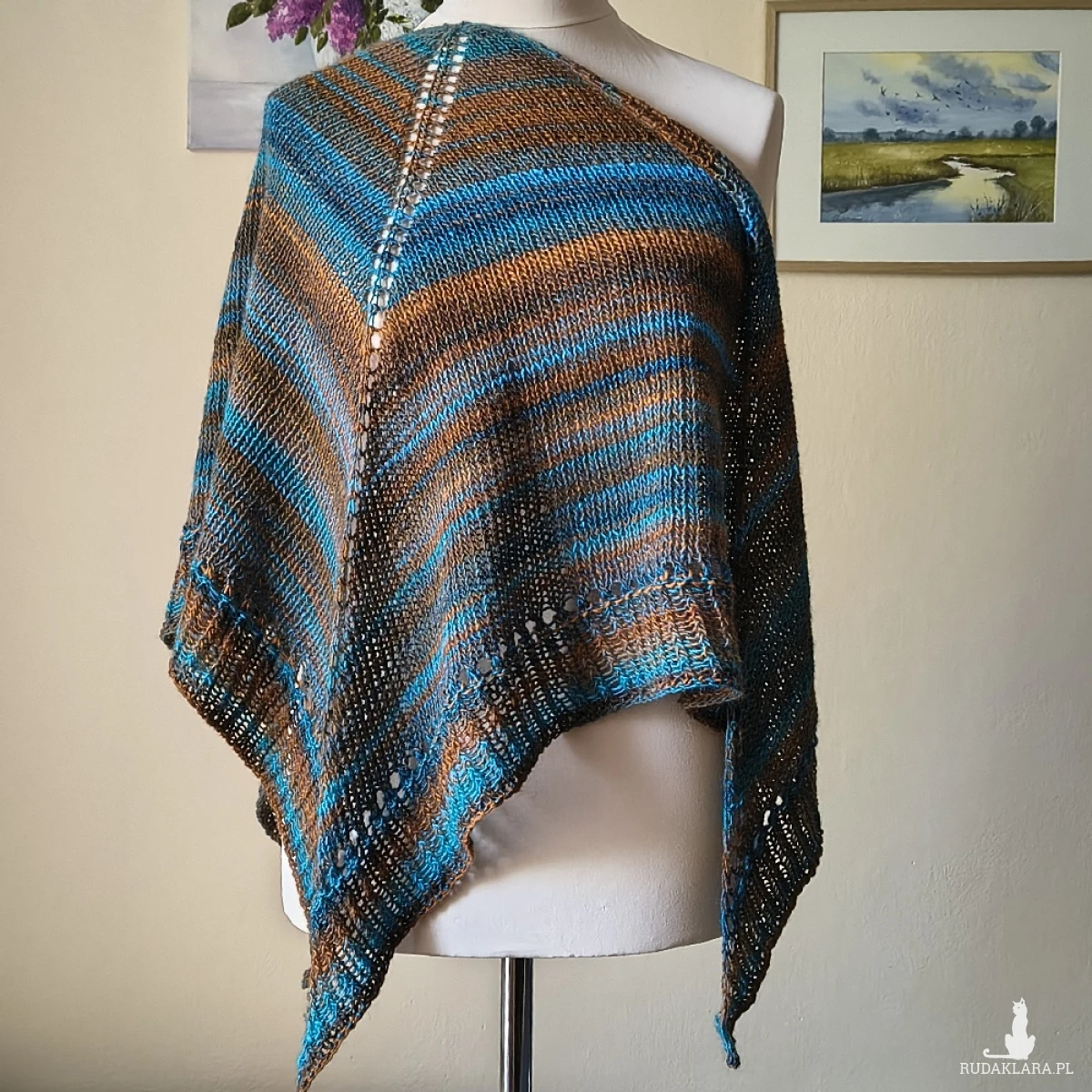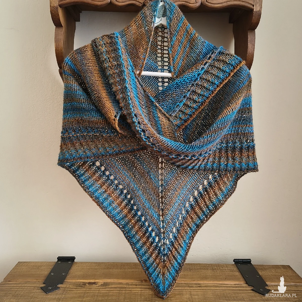 Miła, lekka, świetnie układająca się chusta wykonana ręcznie na drutach z doskonałej hiszpańskiej włóczki wełniano - akrylowej (z przewagą przyjemnej dla skóry wełny). Ciekawy i twarzowy zestaw kolorystyczny, który świetnie sprawdzi się o każdej porze roku. Wymiary chusty: 180 cm. bok najdłuższy, 80 cm wysokość trójkąta. Pranie ręczne.