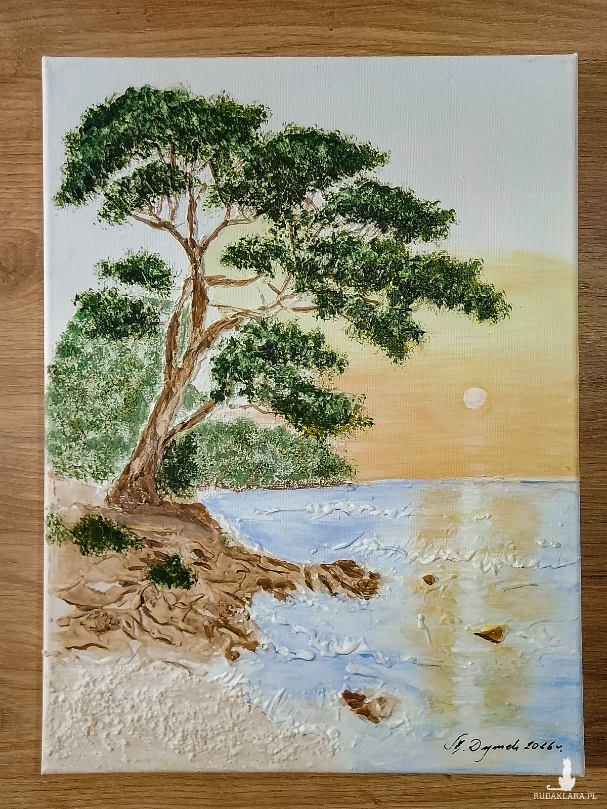 - Tematyka: Klasyczny, kojący pejzaż - drzewa, polana, brzeg skąpany w promieniach słońca