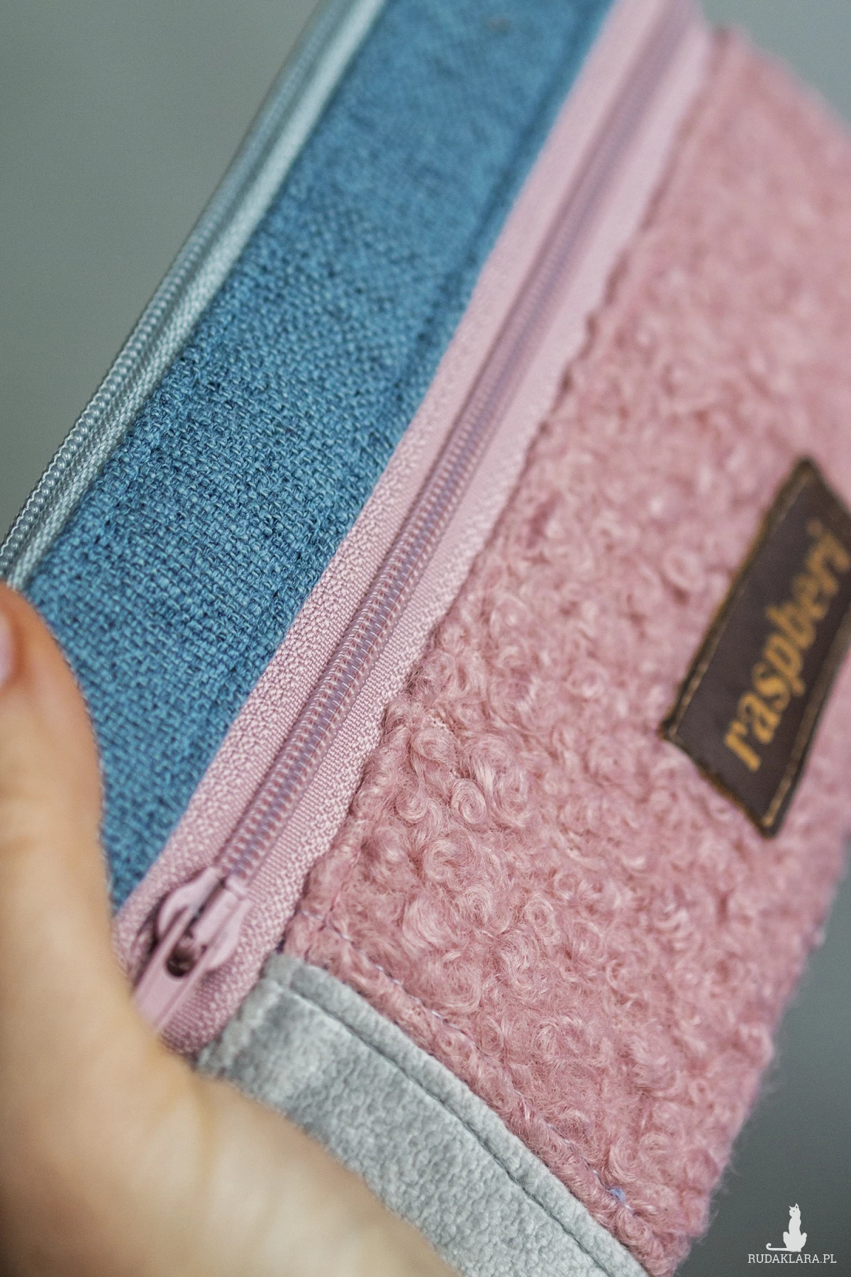 Prosty wodoodporny portfel wykonany z kilku rodzajów tkanin w odcieniach szarości i różu i błękitu.