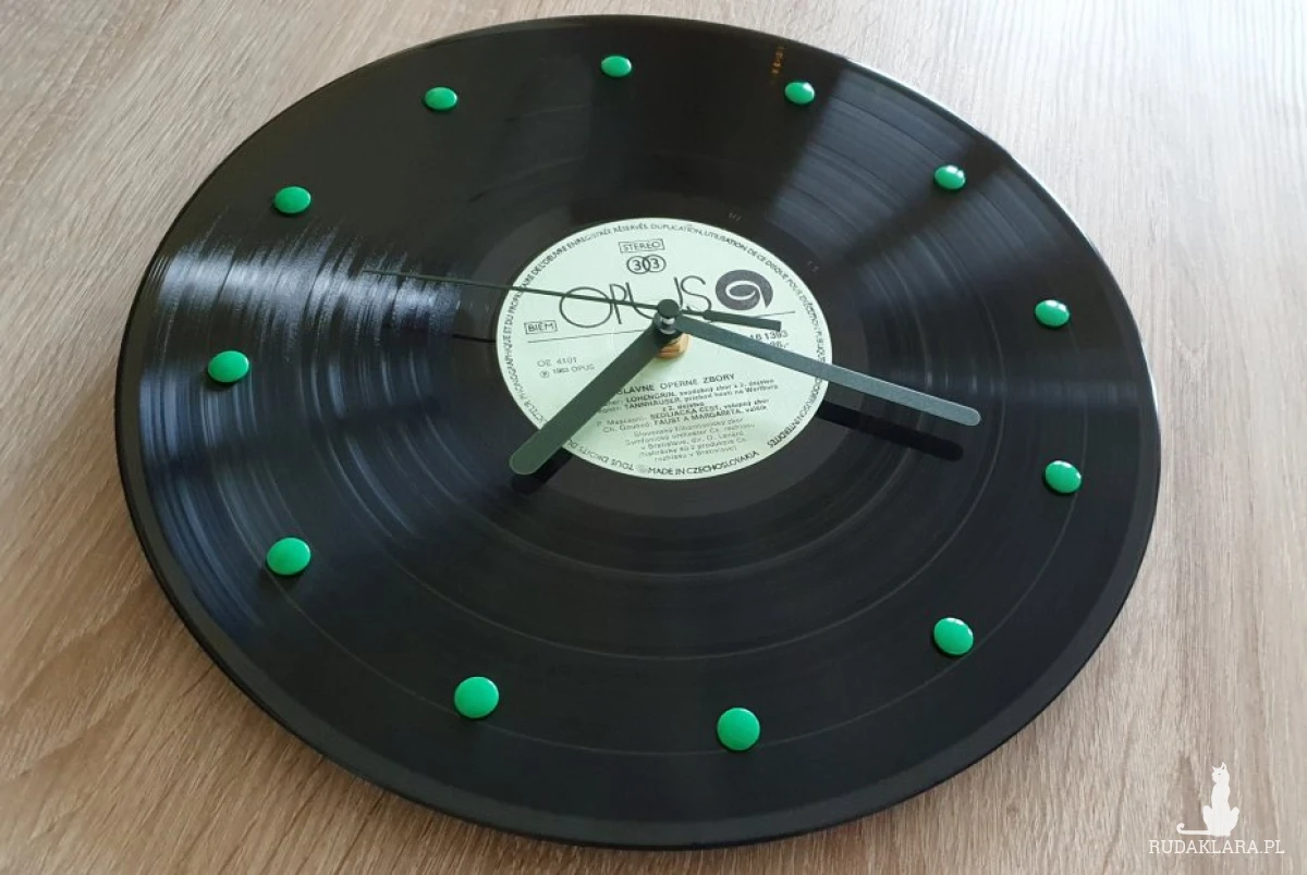 Muzyczny zegar wykonany z prawdziwej płyty winylowej pochodzącej z rodzinnej kolekcji. Wielka gratka dla melomanów oraz wielbicieli winyli!