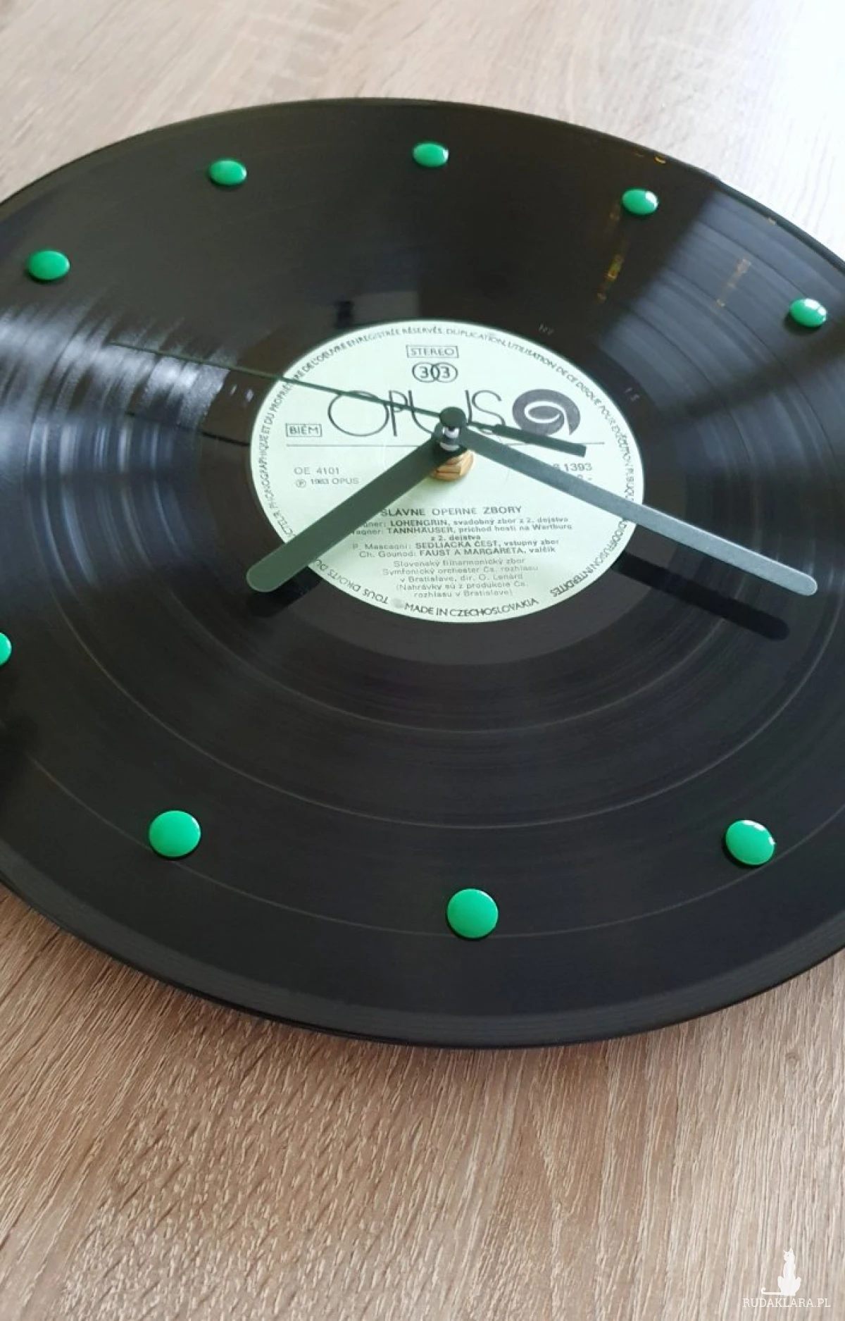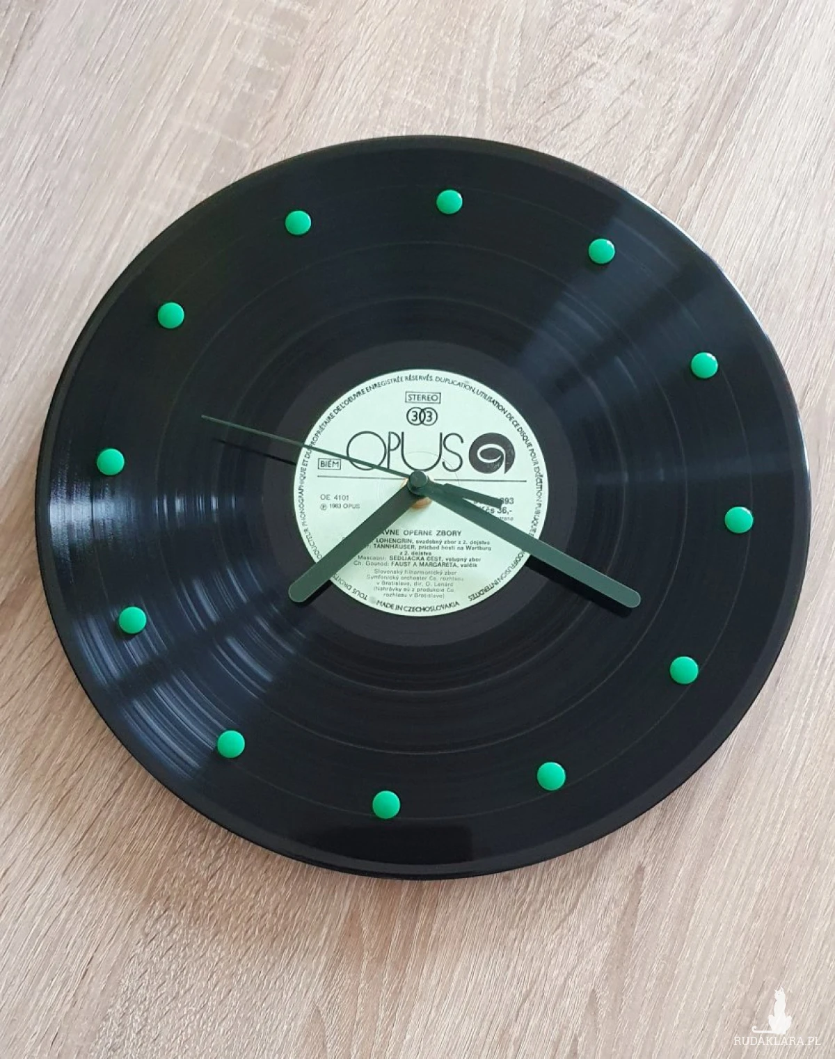 Etykieta płyty winylowej ma kolor jasnozielony. Zegar posiada ciemnozielone wskazówki oraz zielone znaczniki poszczególnych godzin.