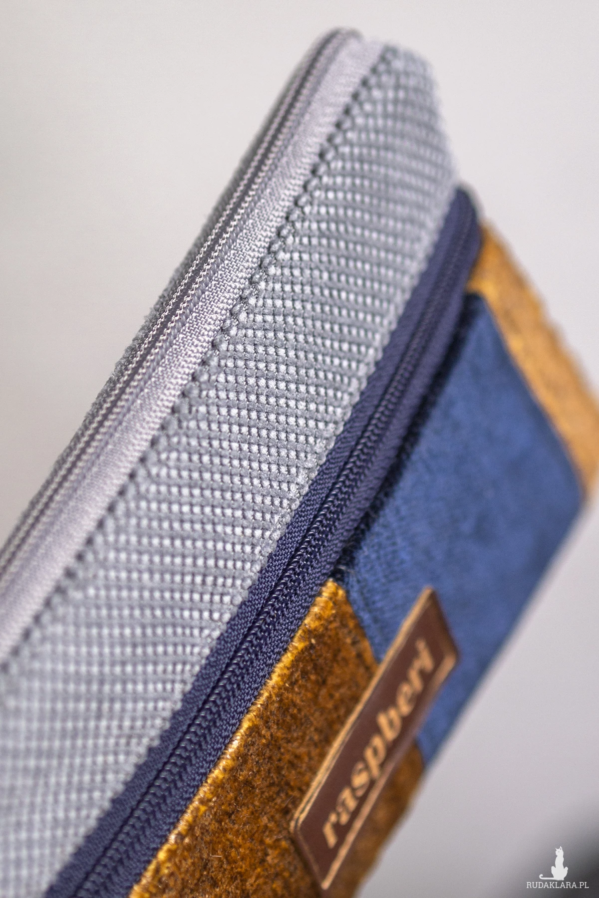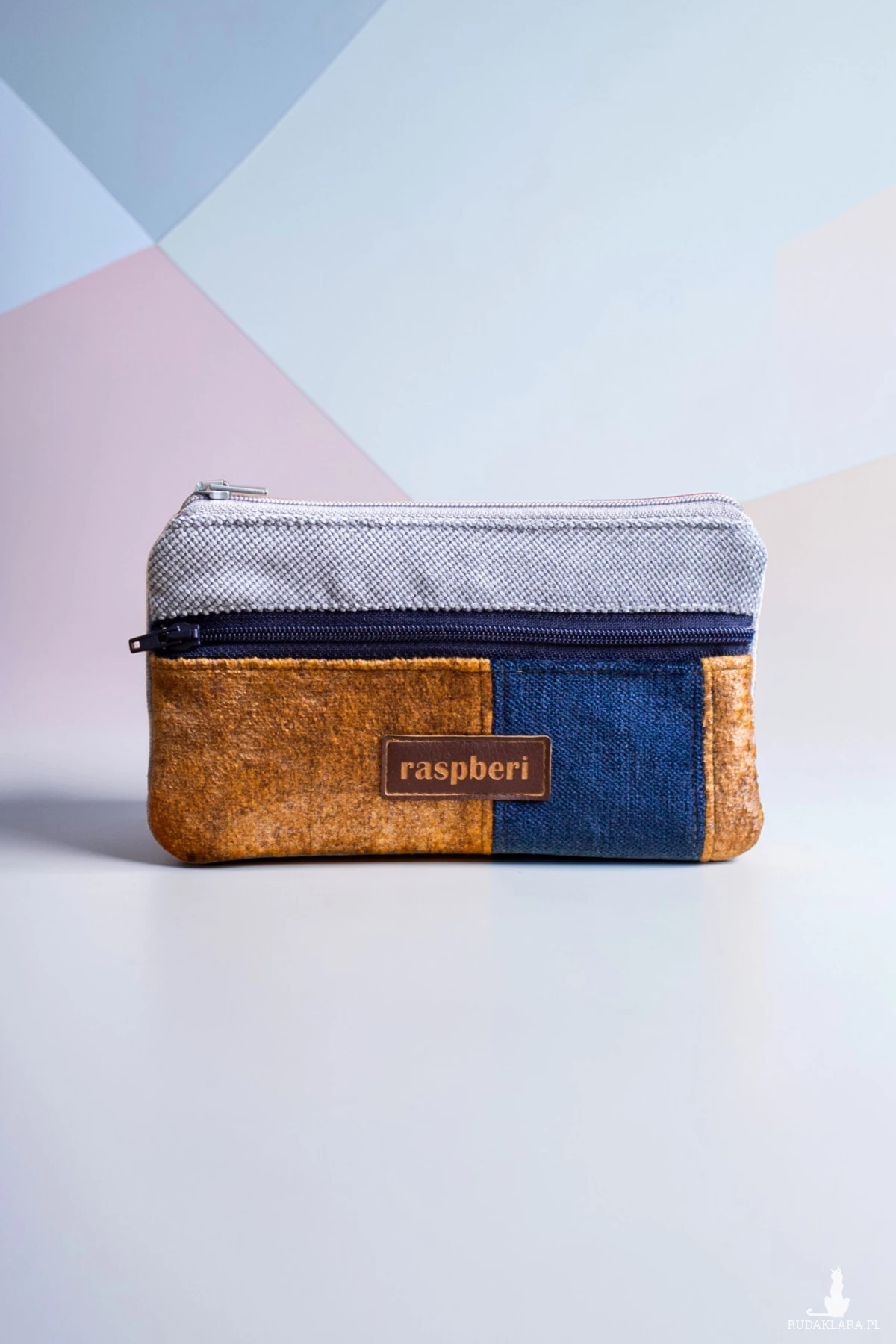 Prosty wodoodporny portfel wykonany z kilku rodzajów tkanin w odcieniach szarości, miodu i granatu.