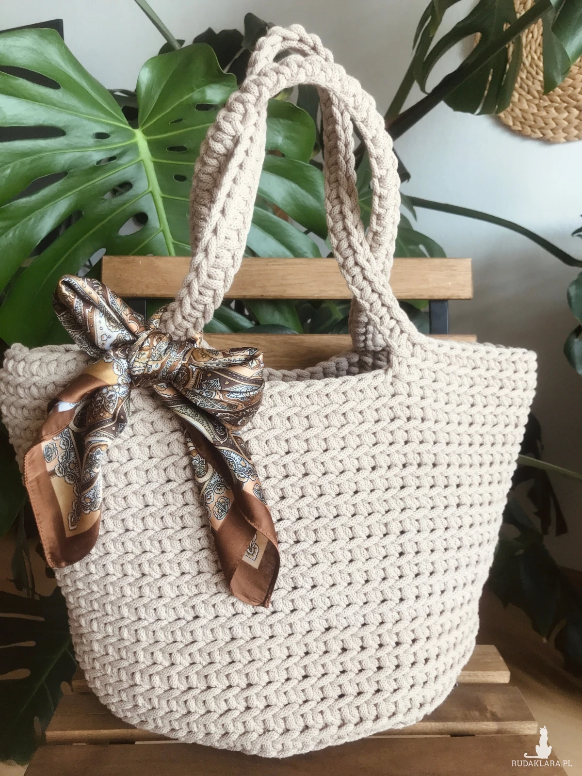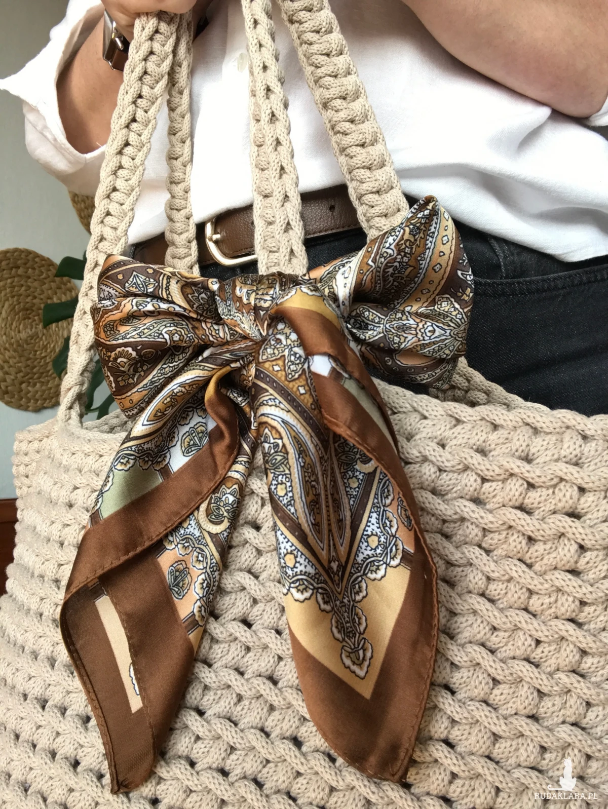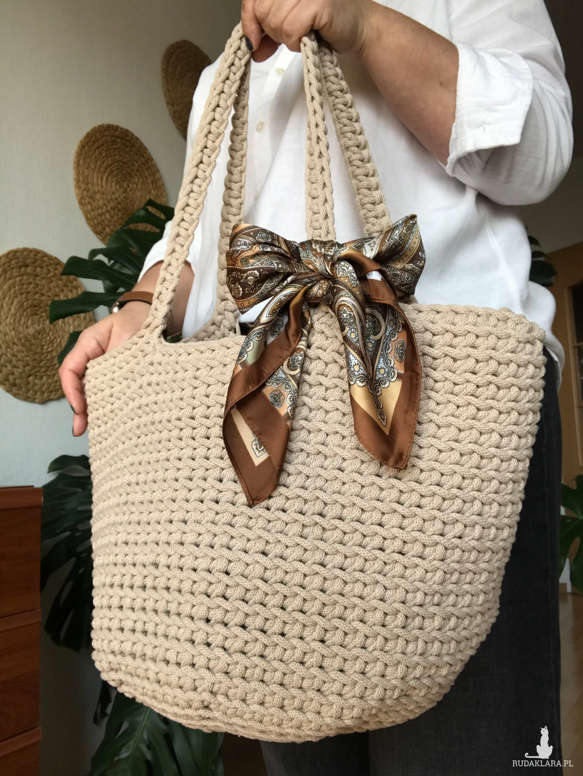Torebka szydełkowa,koszyk na szydełku z sznurka bawełnianego + apaszka