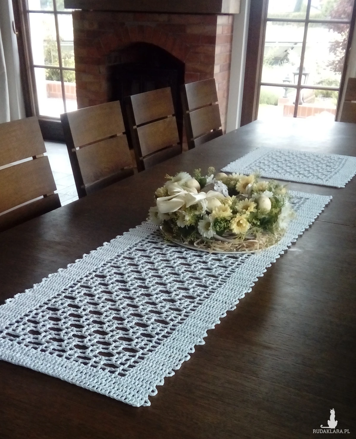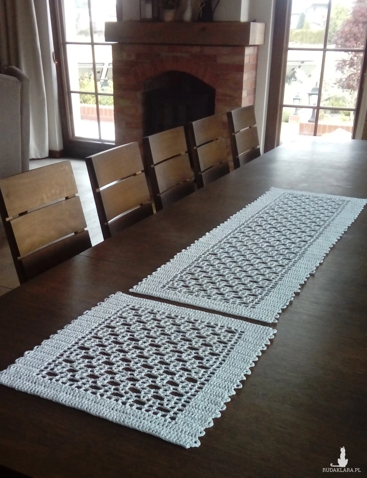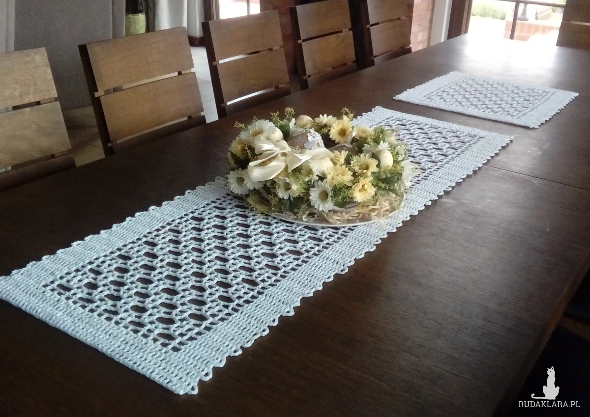 Komplet bieżnik z serwetą w całości wykonany ręcznie, w kolorze białym.
