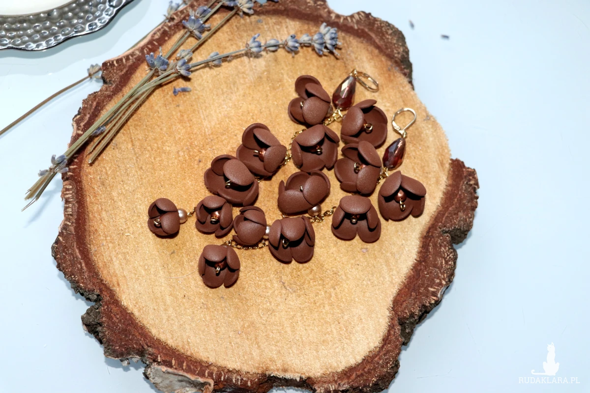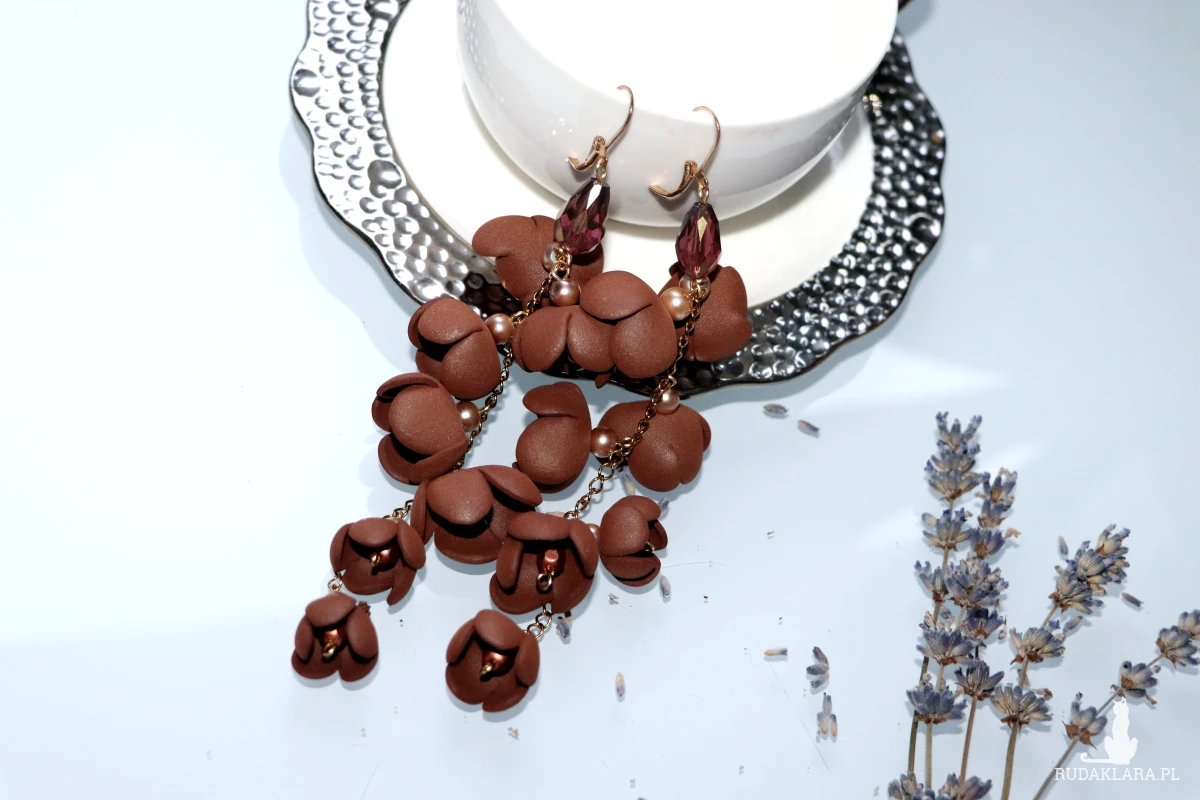Te efektowne długie kolczyki kwiatowe w odcieniu ciemnej czekolady zostały wykonane ręcznie z niezwykle lekkiej pianki (foamiranu). Dzięki temu, mimo swojej kaskadowej formy, są one piórkowo lekkie i niemal niewyczuwalne na uszach. Kompozycję dopełniają fasetowane kryształy w kolorze dymnego różu oraz srebrne detale, które pięknie rozświetlają całość.