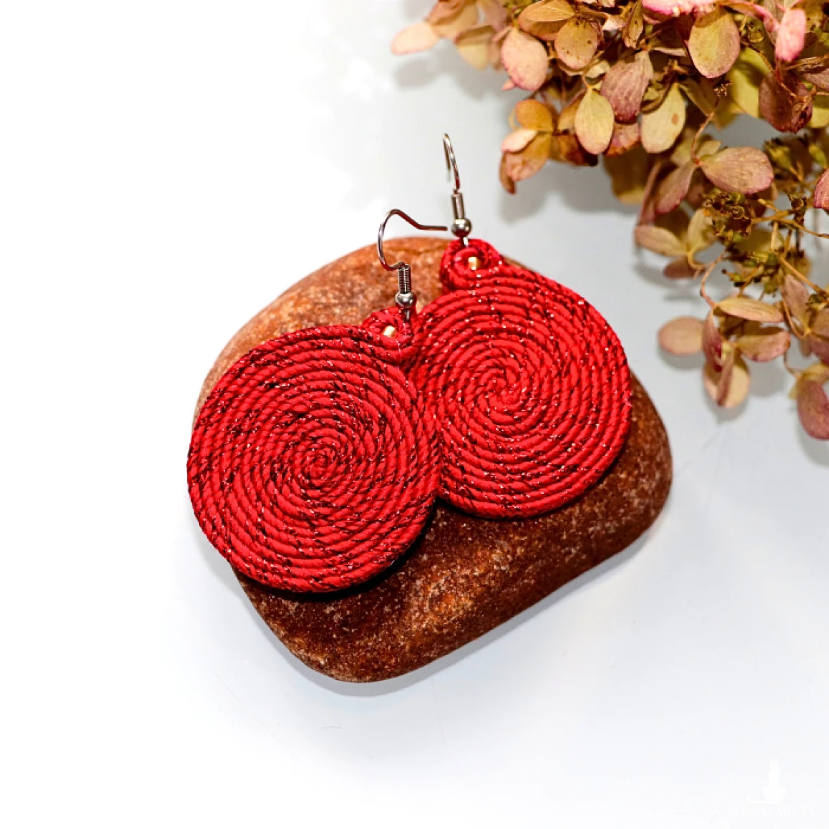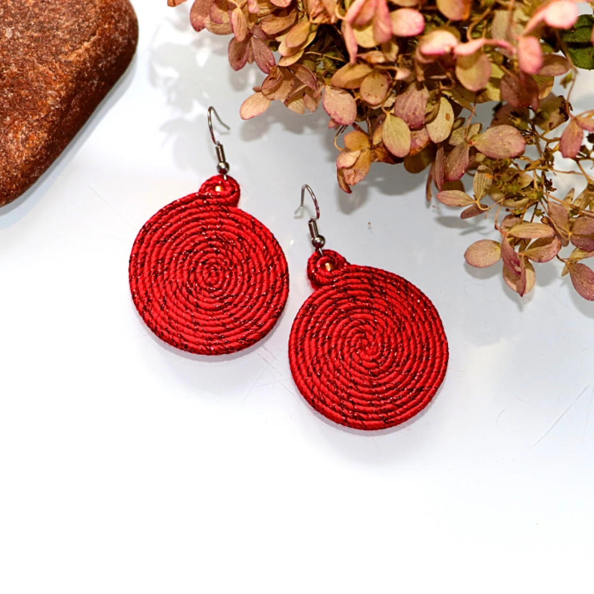 Te wyraziste kolczyki w kształcie kół zostały wykonane techniką haftu sutasz. Intensywna czerwień sznurka została przeplatana delikatną połyskującą nitką, co tworzy trójwymiarowy efekt.