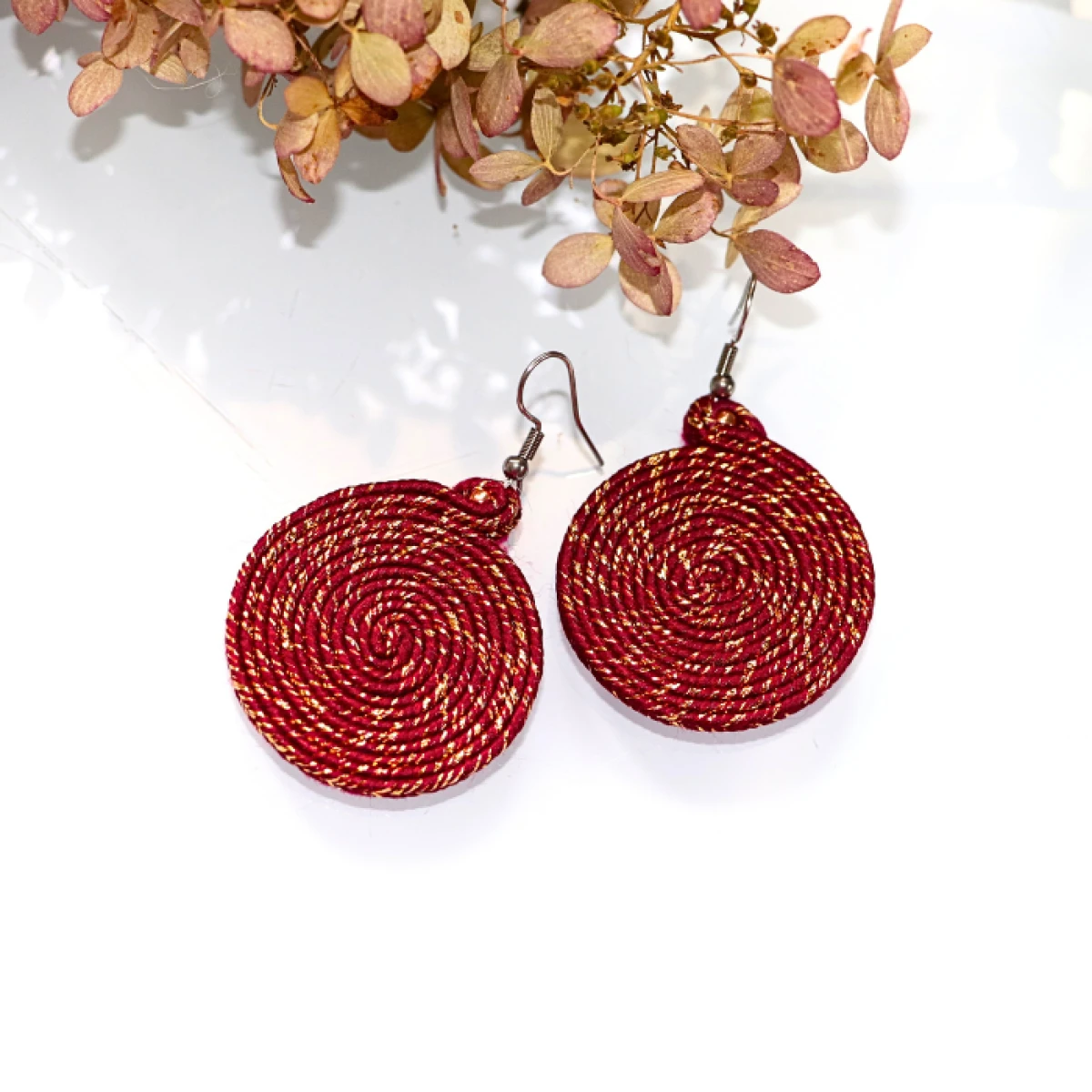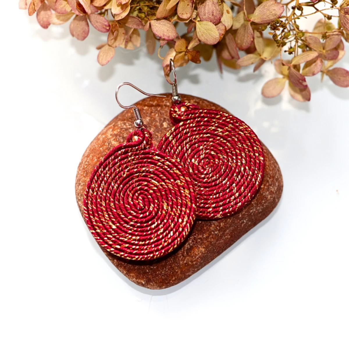Wyraziste kolczyki sutasz w kształcie kół. Głęboki, bordowy sznurek został gęsto przeplatany lśniącą, złotą nicią, co tworzy hipnotyzujący wzór i sprawia, że biżuteria przepięknie mieni się przy każdym ruchu. To idealny wybór dla kobiet, które szukają dodatków z charakterem, ale w eleganckim wydaniu.