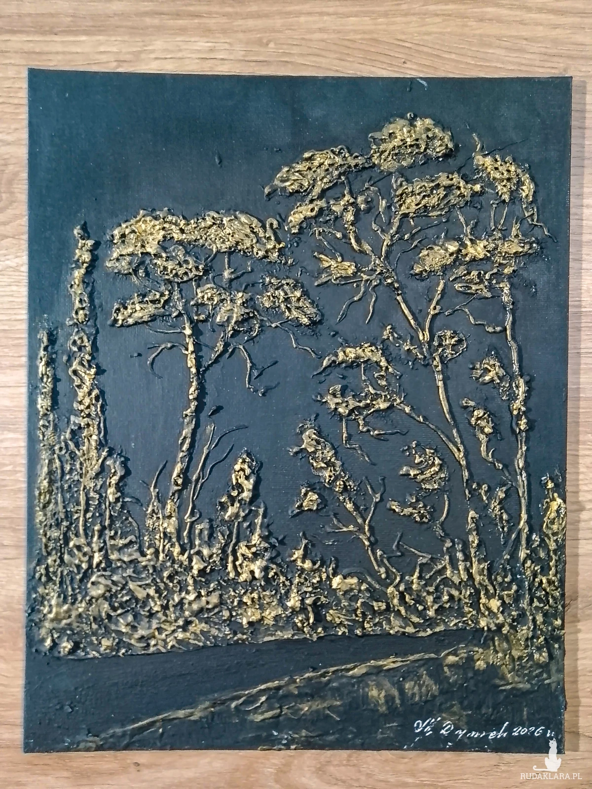 Wyjątkowy dwuczęściowy zestaw - połączenie surowej elegancji i nowoczesnego designu, dzięki czemu idealnie wpisuje się w modny styl Scandi-Glamour, loft lub nowoczesną klasykę. Szyk, natura i blask złota... Ciemna kolorystyka sprawia, że wnętrze nabiera klasy, a biżuteryjny blask przyciąga wzrok każdego widza. To coś więcej niż płótno – to gra cieni i wypukłości, które zapraszają do dotyku. Każde pociągnięcie szpachlą było starannie przemyślane, by stworzyć harmonijną kompozycję. Nie jest to wydruk, lecz autorskie dzieło z wyraźnym śladem ręki artysty. Idealne rozwiązanie dla osób szukających dodatków klasycznych i nowoczesnych jednocześnie. Dekoracja doskonała do salonu, sypialni, luksusowego gabinetu, czy na ekskluzywny prezent.