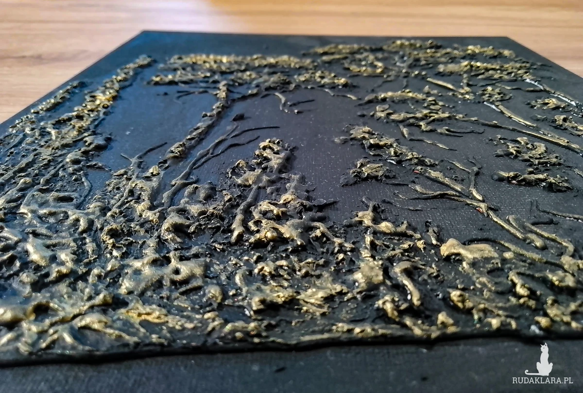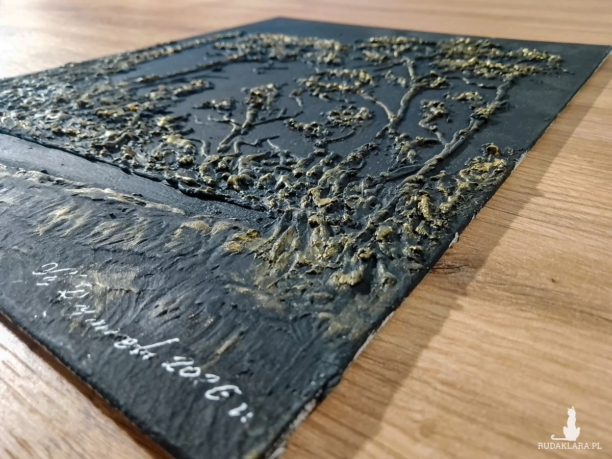 - Technika malarska: Malarstwo strukturalne z teksturą 3D z zastosowaniem pasty strukturalnej oraz farb akrylowych