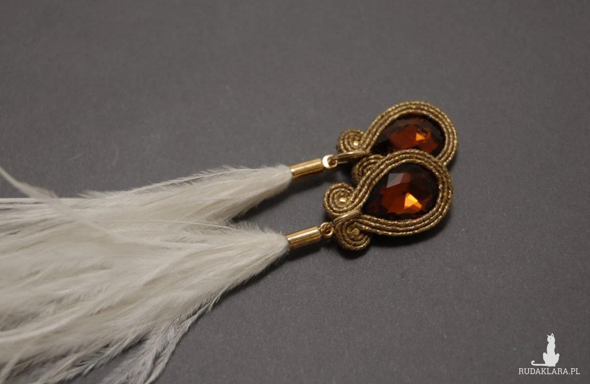 oferuję kolczyki lub klipsy zrobione techniką sutasz, ozdobione fasetowanymi, szklanymi kaboszonami i delikatnymi piórami. Sznurek jest opalizujący.