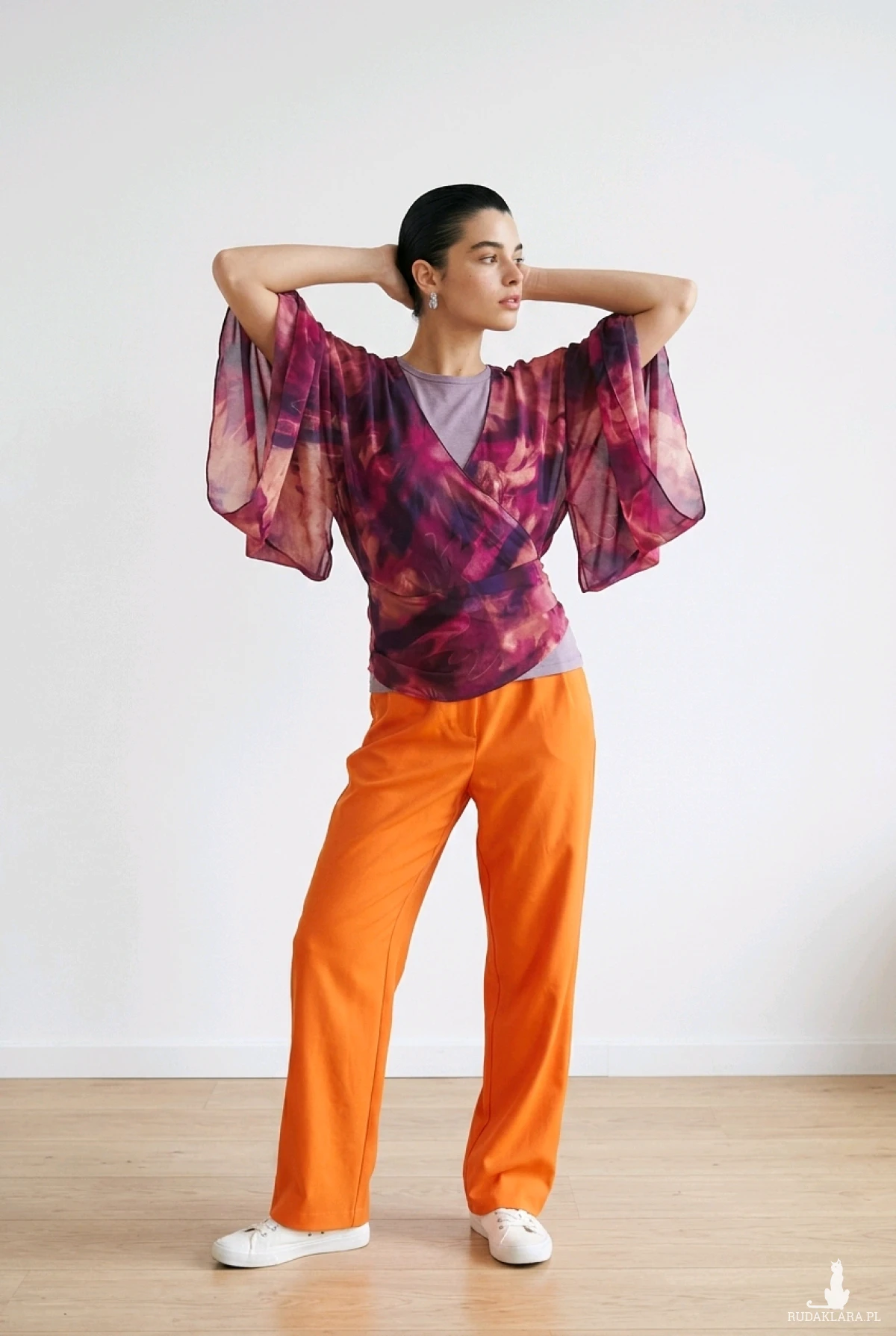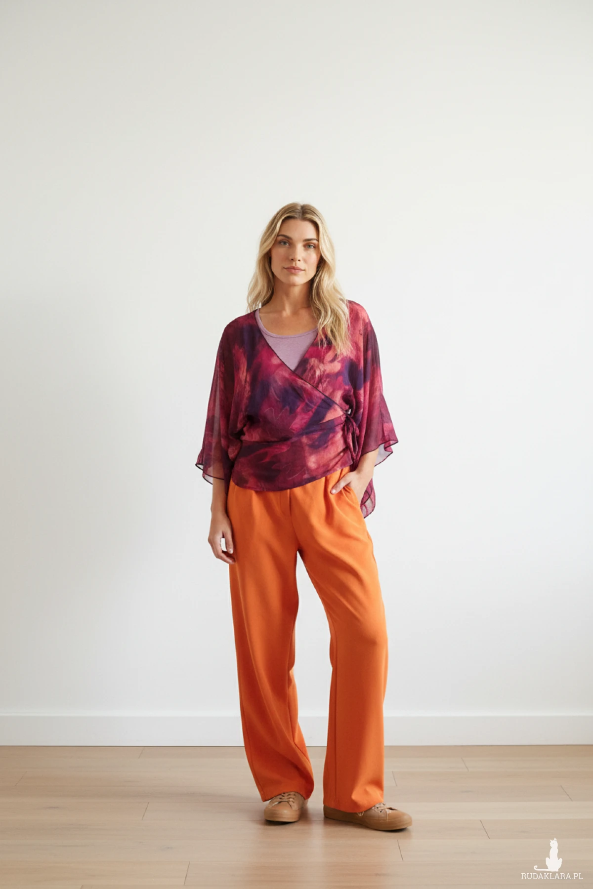 Bluzka w odcieniach Bordo i fioletu firma mango wspaniałe rękawy materiał to wiskoza długość bluzki 75 cm pas mierzony na płasko 45 cm bluzka wygląda spektakularnie ale ma bardzo duży dekolt więc dobrze jest mieć t-shirt pod spodem materiał wiskoza